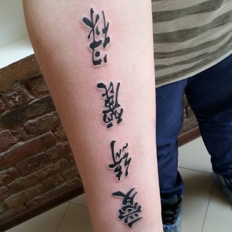 L'art d'écrire à l'aide de hiéroglyphes remonte à l'Orient ancien. Les caractères complexes chinois, japonais et coréens sont aussi difficiles à déchiffrer qu'à écrire. Dans le monde du tatouage, on trouve souvent des caractères chinois et japonais, bien sûr. Les caractères coréens ne sont pas particulièrement populaires, même parmi les Coréens eux-mêmes - ils préfèrent utiliser les caractères chinois comme art corporel.