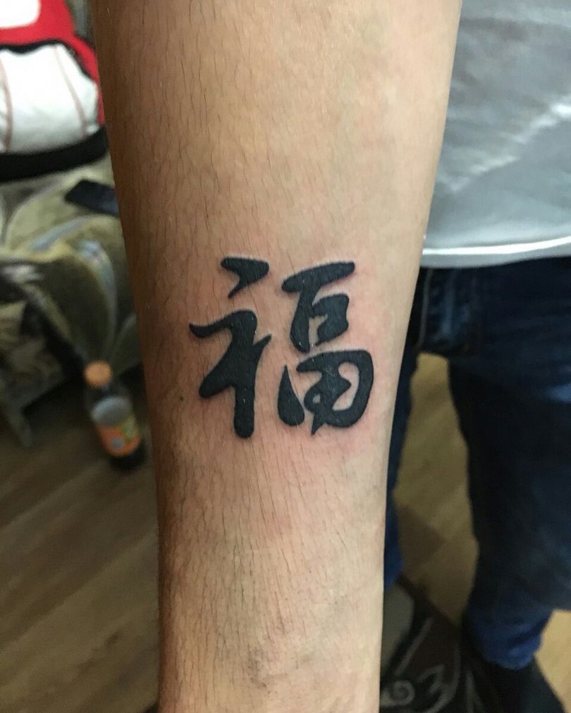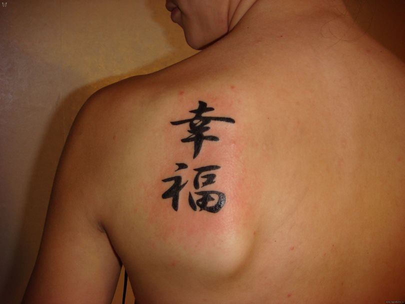 - Caractère chinois pour "bonheur". Les Chinois pensent que ce tatouage symbolise le patronage des cieux. Il est très populaire parmi ceux qui veulent créer une famille solide.