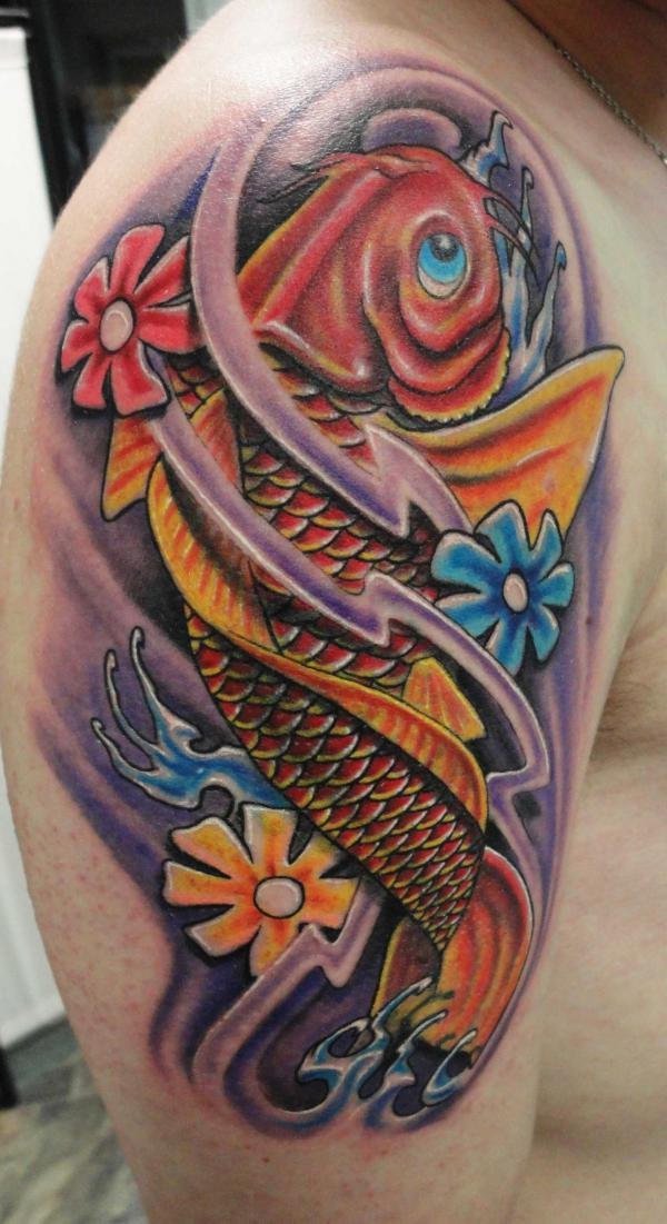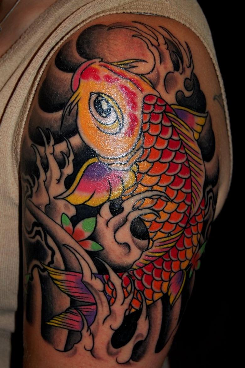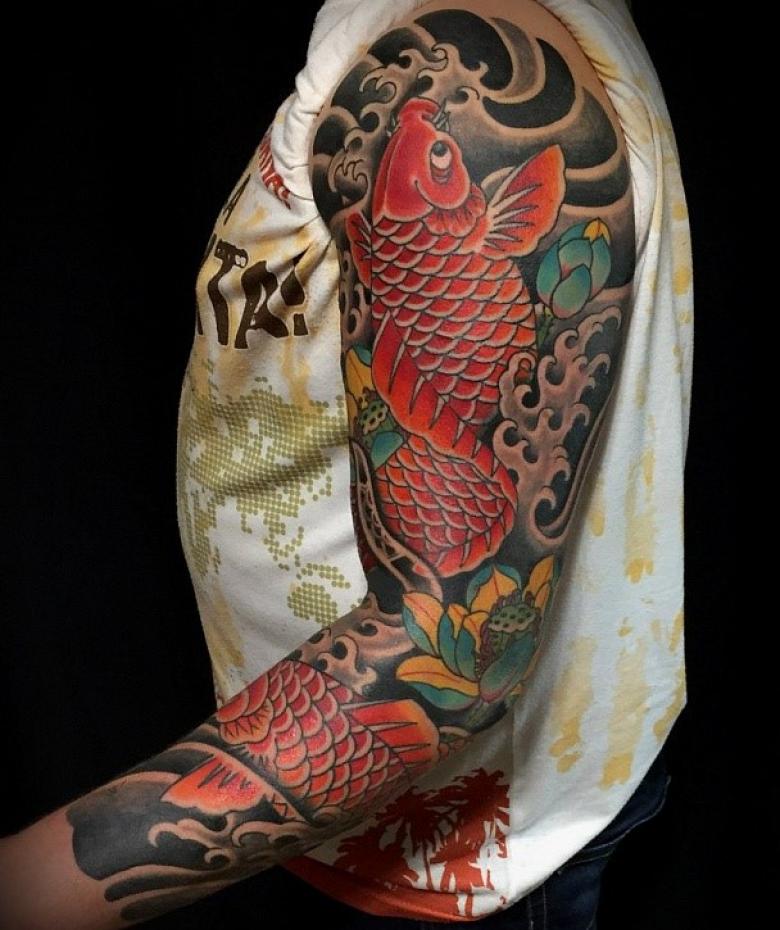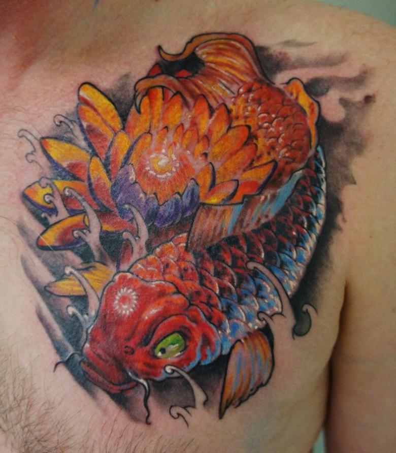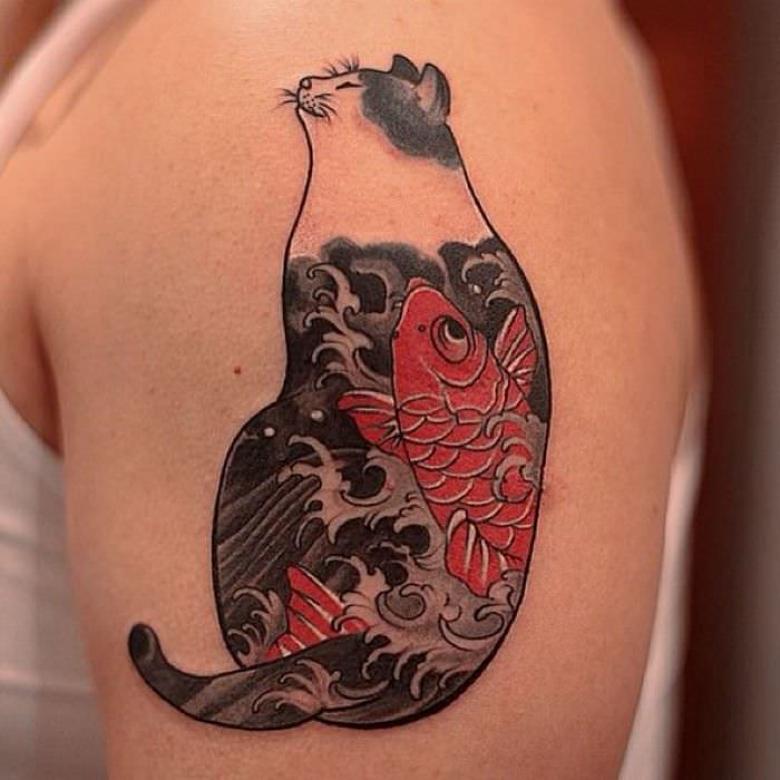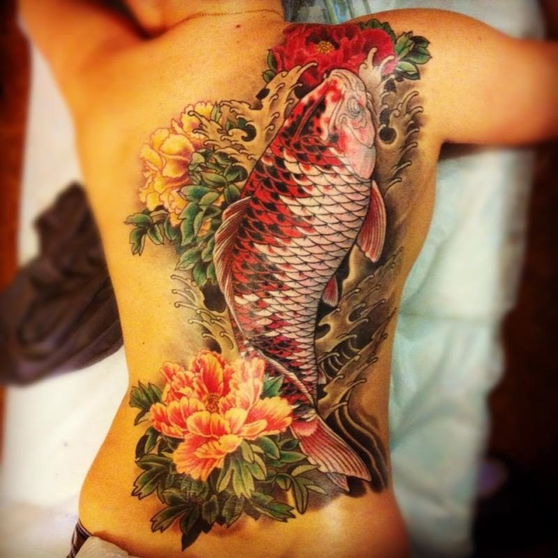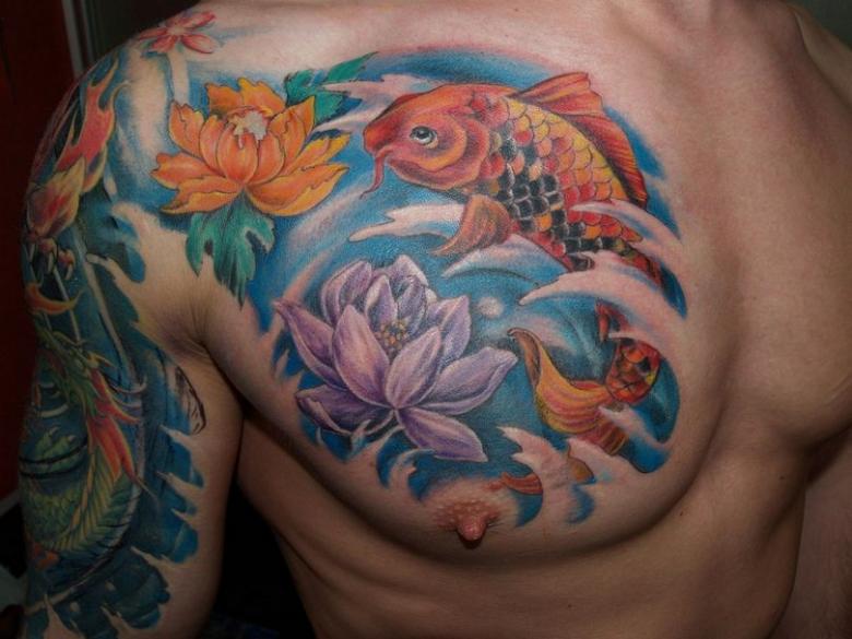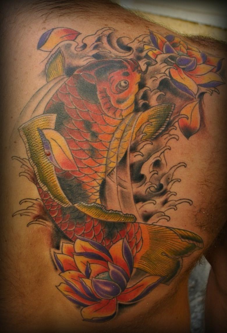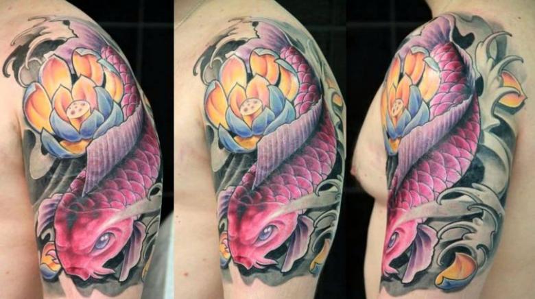 Un dessin de tatouage représentant deux poissons Koi est courant. Il symbolise un mariage réussi et durable, la fidélité et l'harmonie dans la relation entre une femme et un homme. La composition sera complétée par un contour des hiéroglyphes, entouré de lotus.