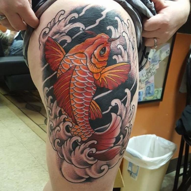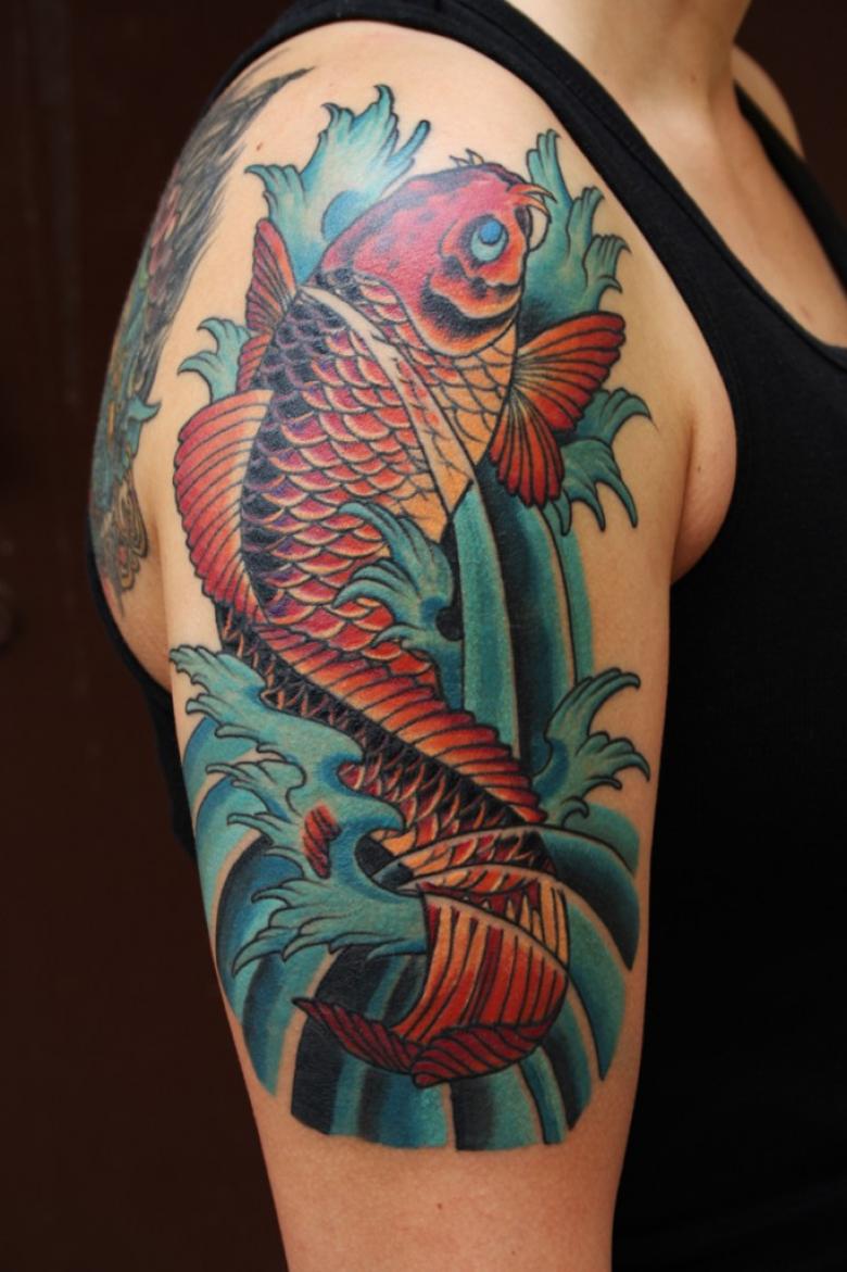 Les jeunes femmes et les jeunes filles appliquent la carpe comme symbole du bonheur familial. Une carpe rose est la couleur de l'innocence, un poisson plus saturé convient aux femmes plus âgées. Le porteur de ce tatouage est capable d'accomplir beaucoup de choses sans l'aide des autres, de manière indépendante. Le tatouage semble parfait autour du poignet et de l'avant-bras. On croit que son propriétaire s'attend à une grande chance.