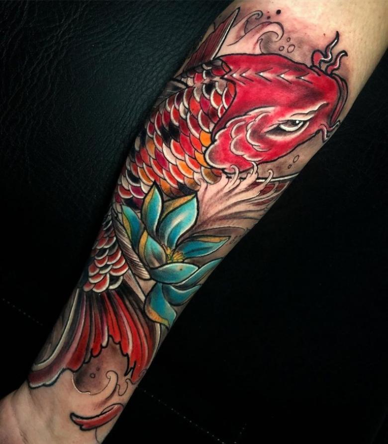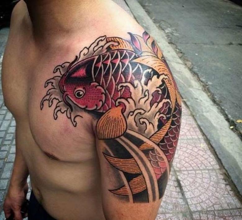 La carpe Koi japonaise n'est pas un choix rare pour un sujet de tatouage. Une telle image témoigne de la richesse du monde intérieur de son propriétaire. Une image originale et accrocheuse constitue une excellente décoration corporelle. Le tatouage d'une carpe à tête de dragon sera l'amulette parfaite pour la personne qui l'aura choisi.
