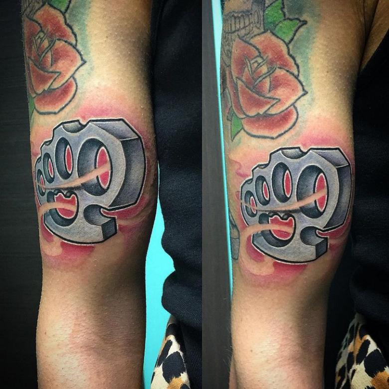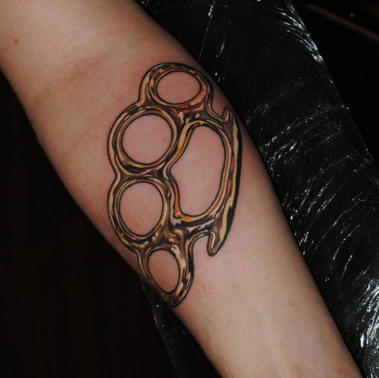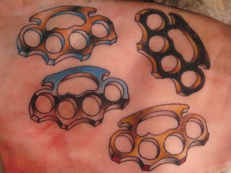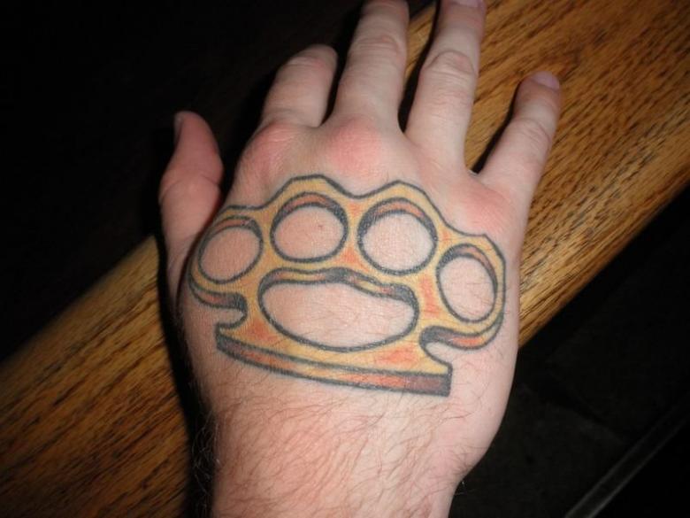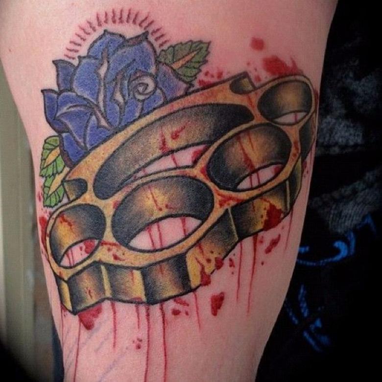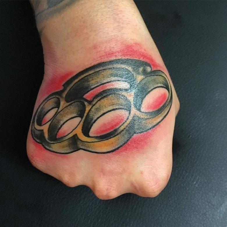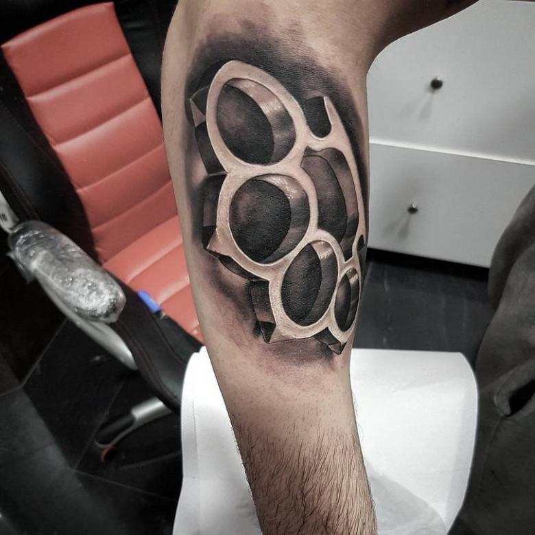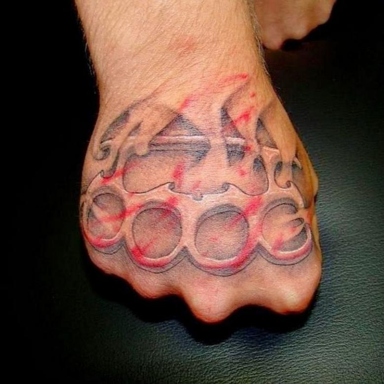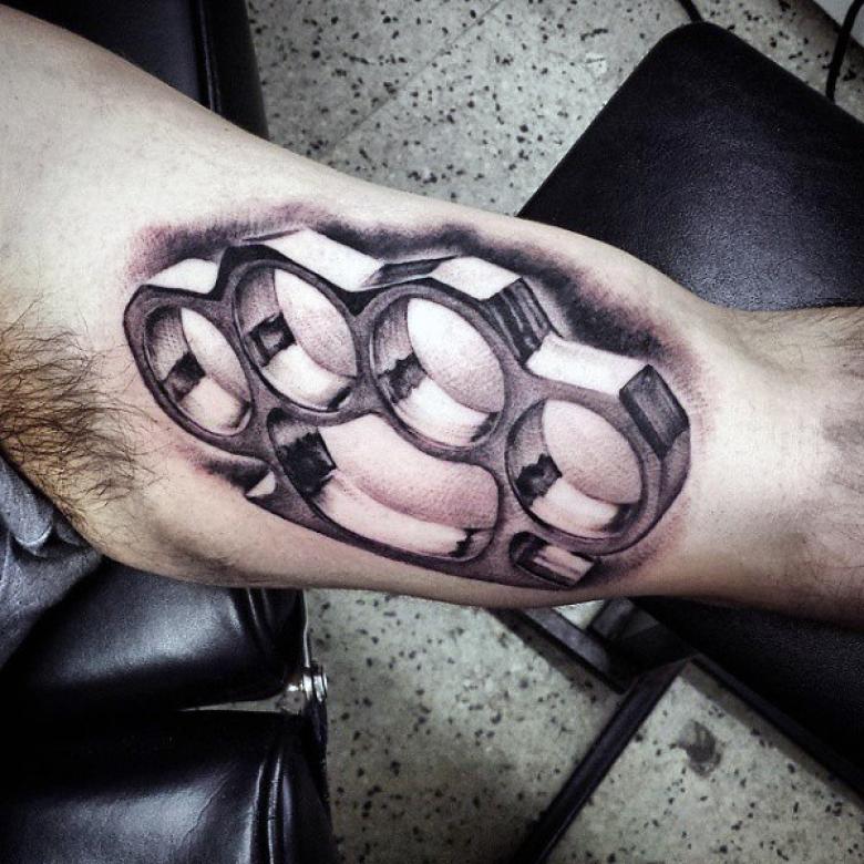 Au vingtième siècle, les poings américains étaient également populaires auprès des criminels, mais aujourd'hui, ils ne sont pratiquement plus utilisés. Les poings américains, en revanche, sont souvent présents sur la peau des types ayant un tempérament de hooligan. Ils en font des rappeurs et des rockeurs, des gars qui ont une vision originale du design et de l'esthétique. Il convient de noter que le port du poing américain comme arme est interdit en Russie et dans de nombreux pays, mais qu'il est ouvertement vendu en Turquie et au Brésil pour être porté librement.