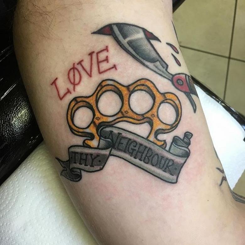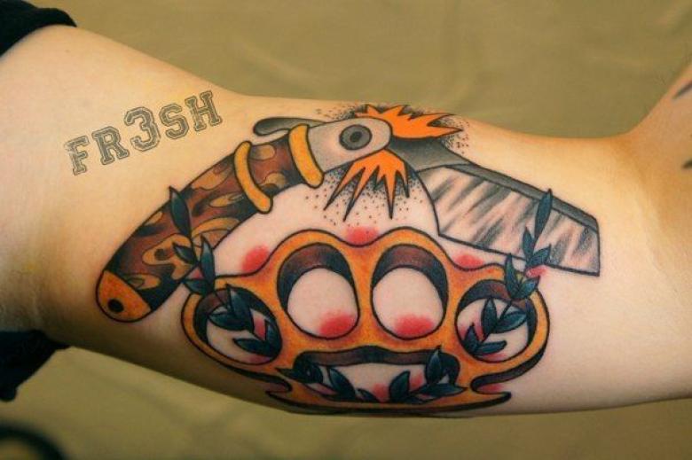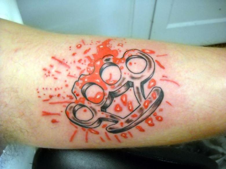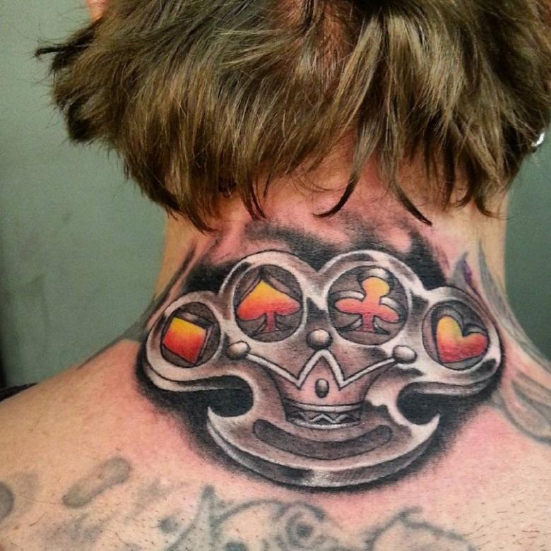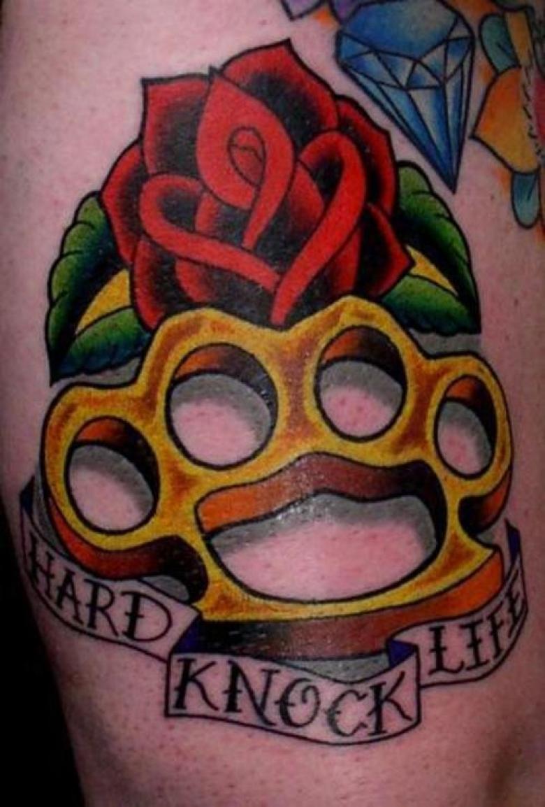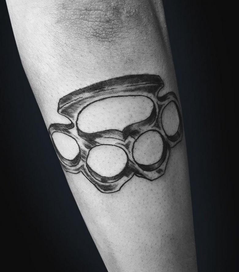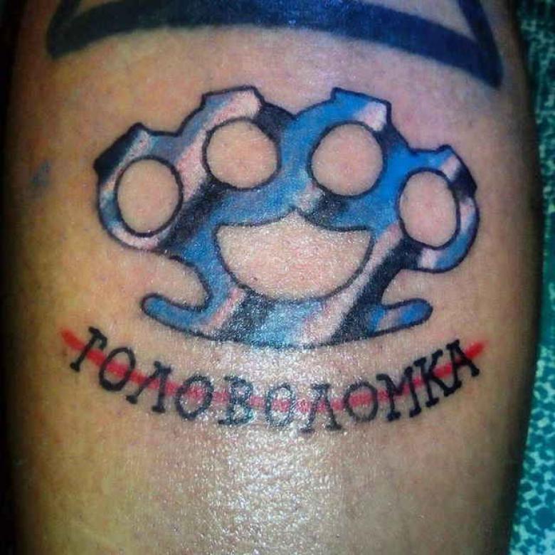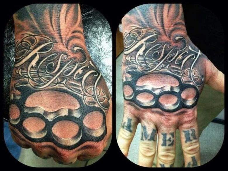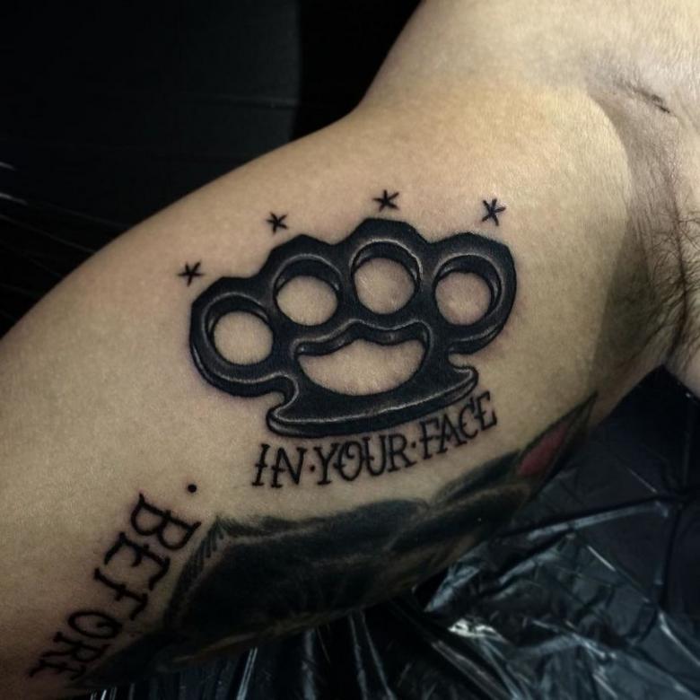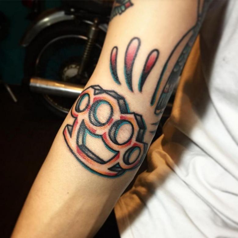 Au vingtième siècle, les poings américains étaient également populaires auprès des criminels, mais aujourd'hui, ils ne sont pratiquement plus utilisés. Les poings américains, en revanche, sont souvent présents sur la peau des types ayant un tempérament de hooligan. Ils en font des rappeurs et des rockeurs, des gars qui ont une vision originale du design et de l'esthétique. Il convient de noter que le port du poing américain comme arme est interdit en Russie et dans de nombreux pays, mais qu'il est ouvertement vendu en Turquie et au Brésil pour être porté librement.