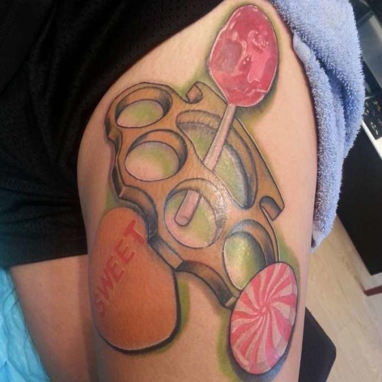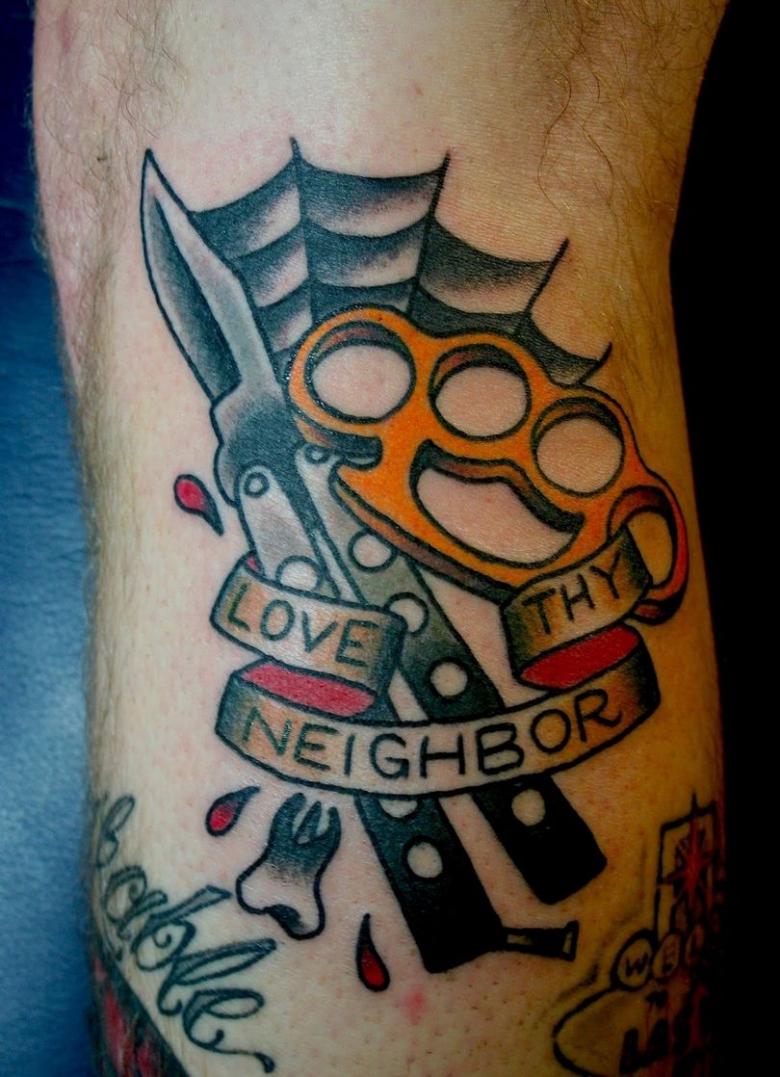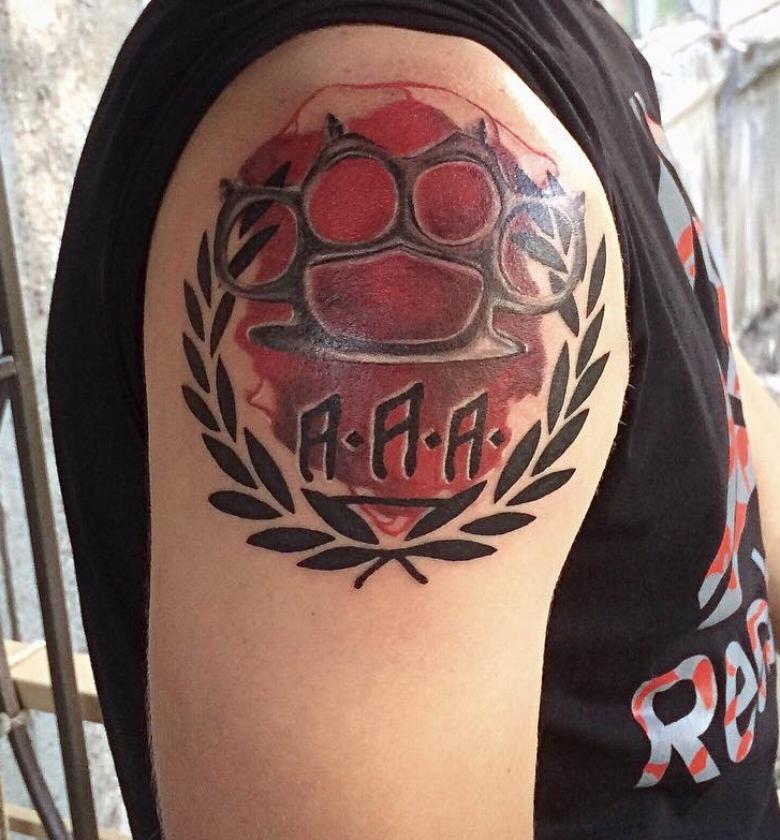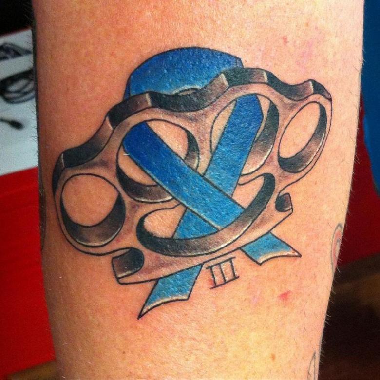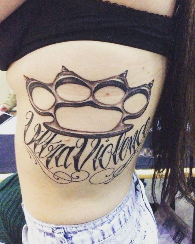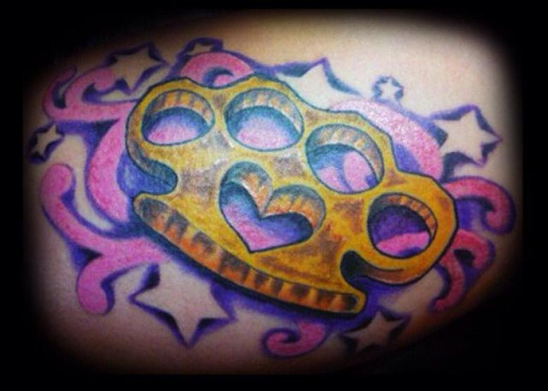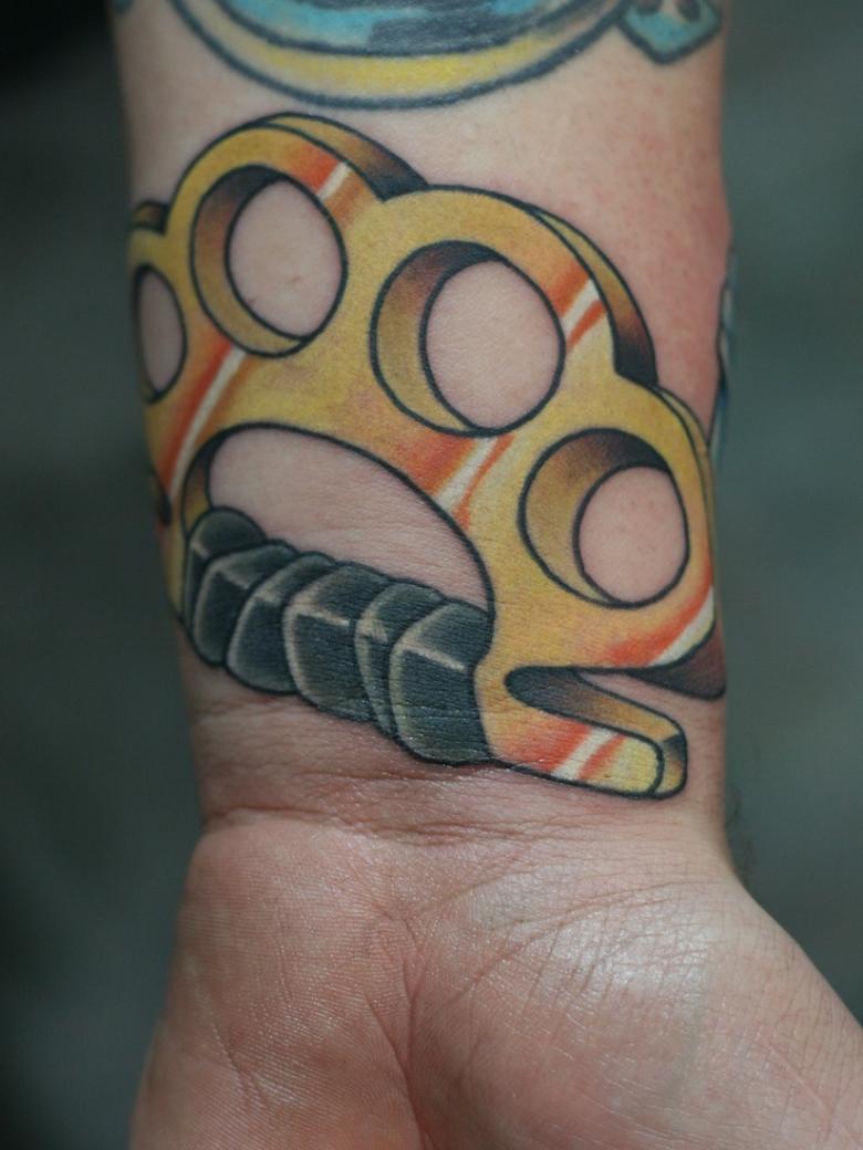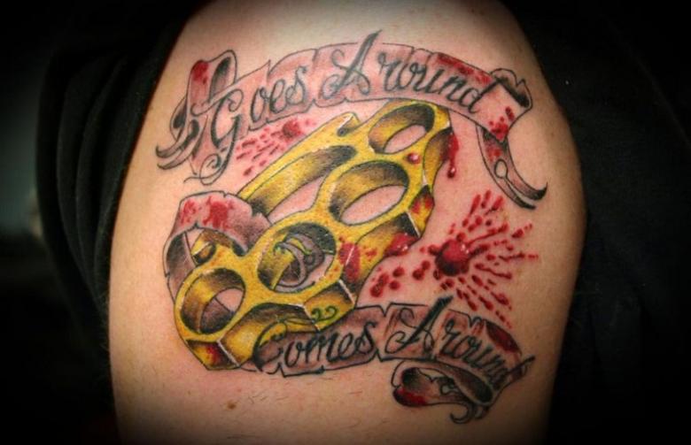 Au vingtième siècle, les poings américains étaient également populaires auprès des criminels, mais aujourd'hui, ils ne sont pratiquement plus utilisés. Les poings américains, en revanche, sont souvent présents sur la peau des types ayant un tempérament de hooligan. Ils en font des rappeurs et des rockeurs, des gars qui ont une vision originale du design et de l'esthétique. Il convient de noter que le port du poing américain comme arme est interdit en Russie et dans de nombreux pays, mais qu'il est ouvertement vendu en Turquie et au Brésil pour être porté librement.