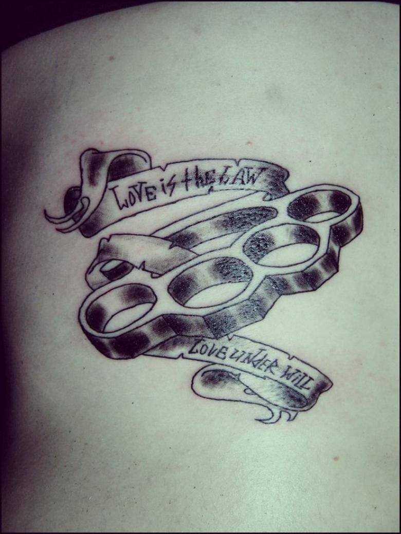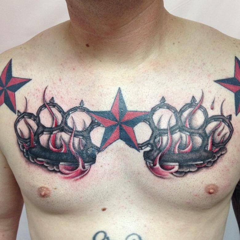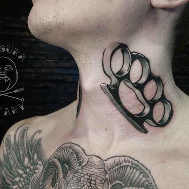 En général, le tatouage du poing américain signifie le rôle de la force brute ainsi que sa présence. En combinaison avec un Rottweiler ou un tigre, une lame froide, des revolvers - il s'agit certainement d'une menace cachée, qui peut être prise en compte comme un avertissement.