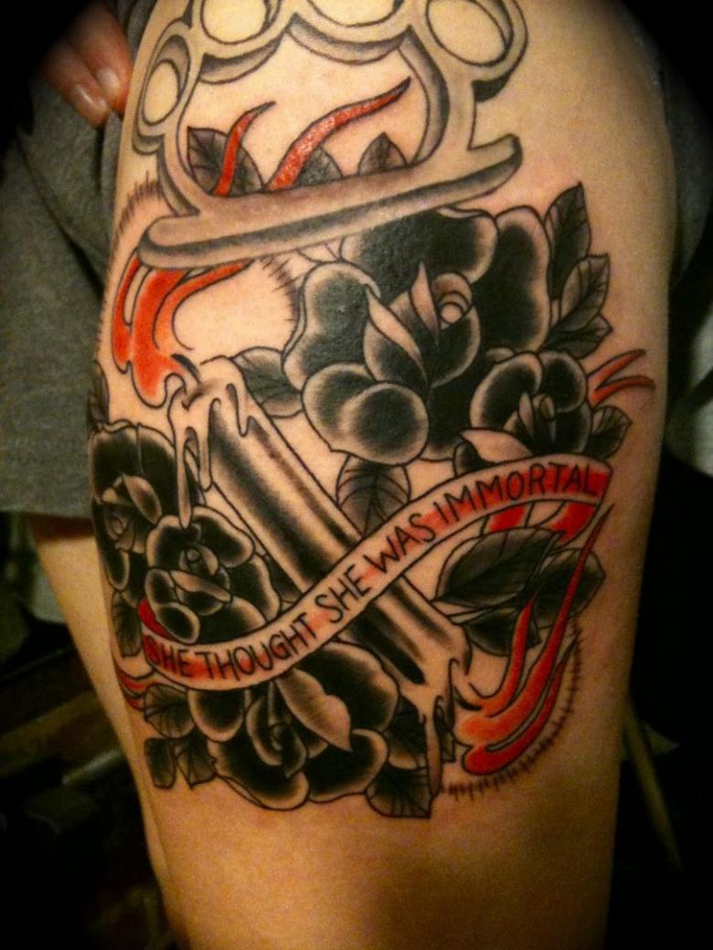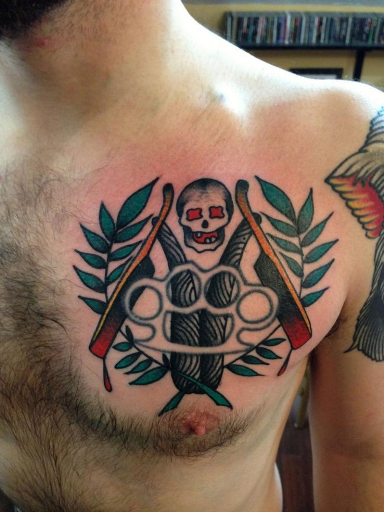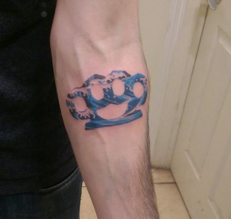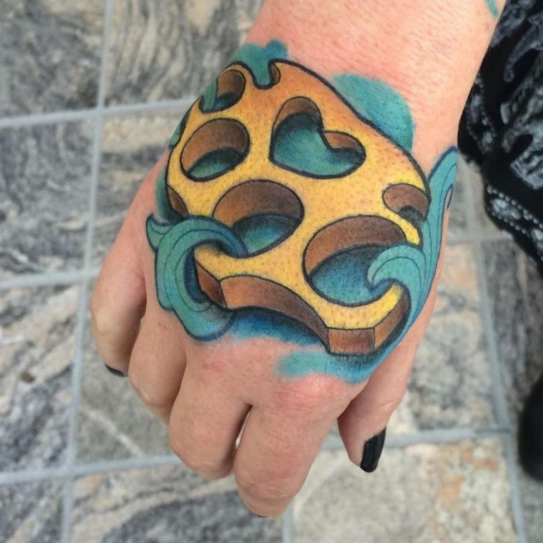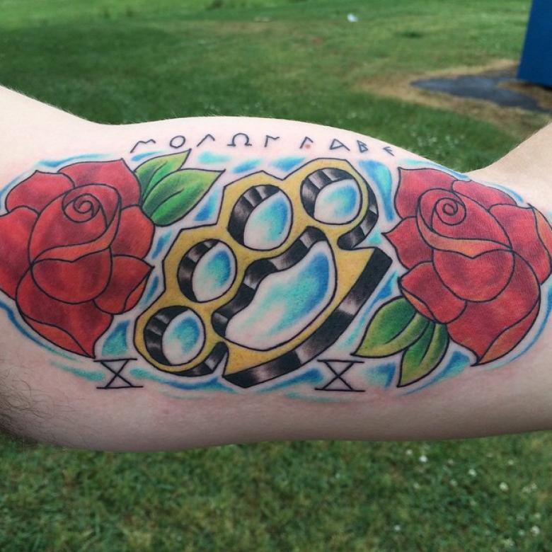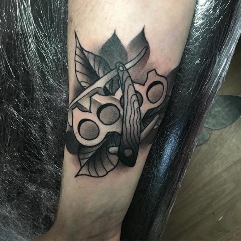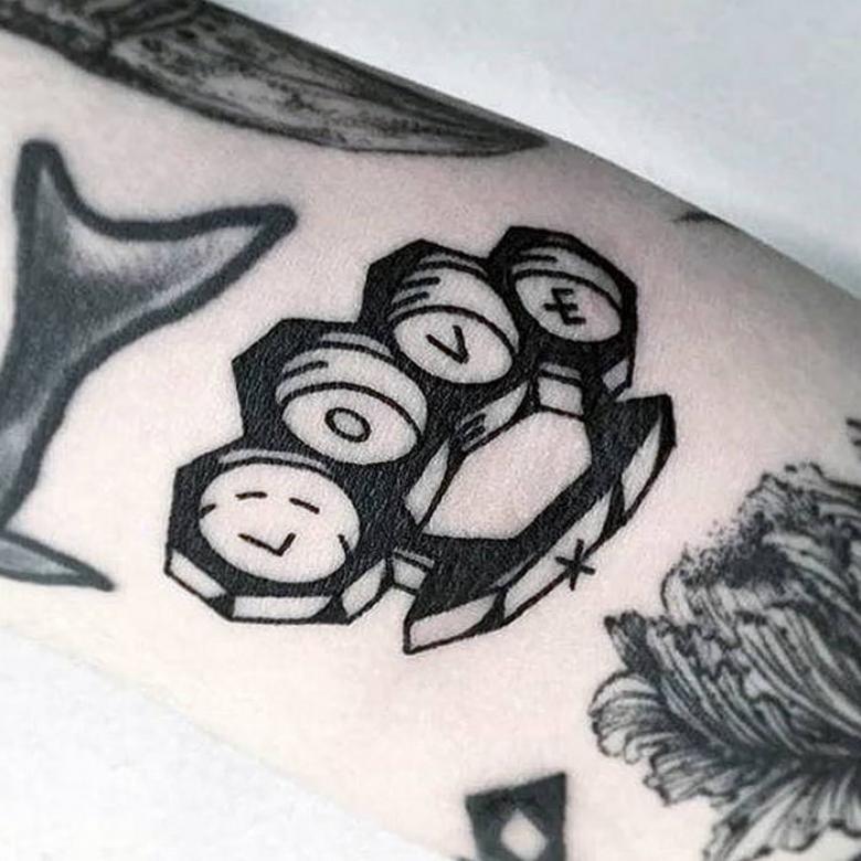 Il s'agit du motif masculin le plus courant sur les poignets, similaire aux bras classiques. Il y en a sur l'avant-bras et sur le dos des paumes. D'autres combinaisons se font sur les épaules, la poitrine et le dos sous la forme d'un couteau dont le manche ressemble à une articulation. Si nous voyons des variations des images, il y a ici une charge symbolique supplémentaire. Ce maître du tatouage poing américain a clairement ses propres idées, il est stoïque dans les situations difficiles, il aime le pouvoir, c'est un grand esquiveur.