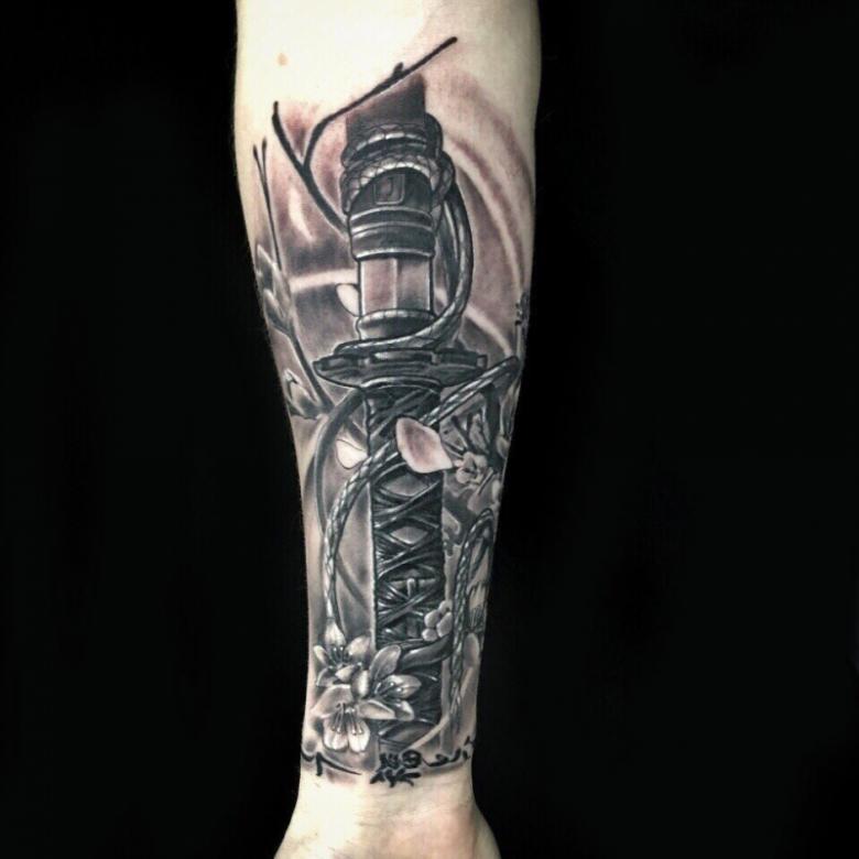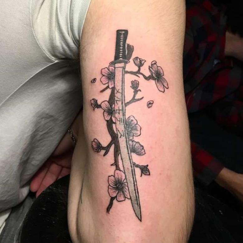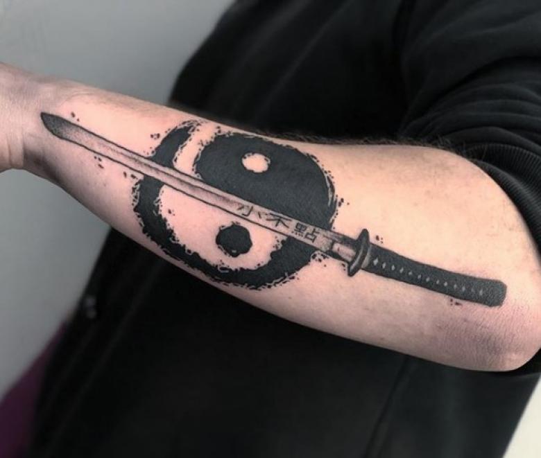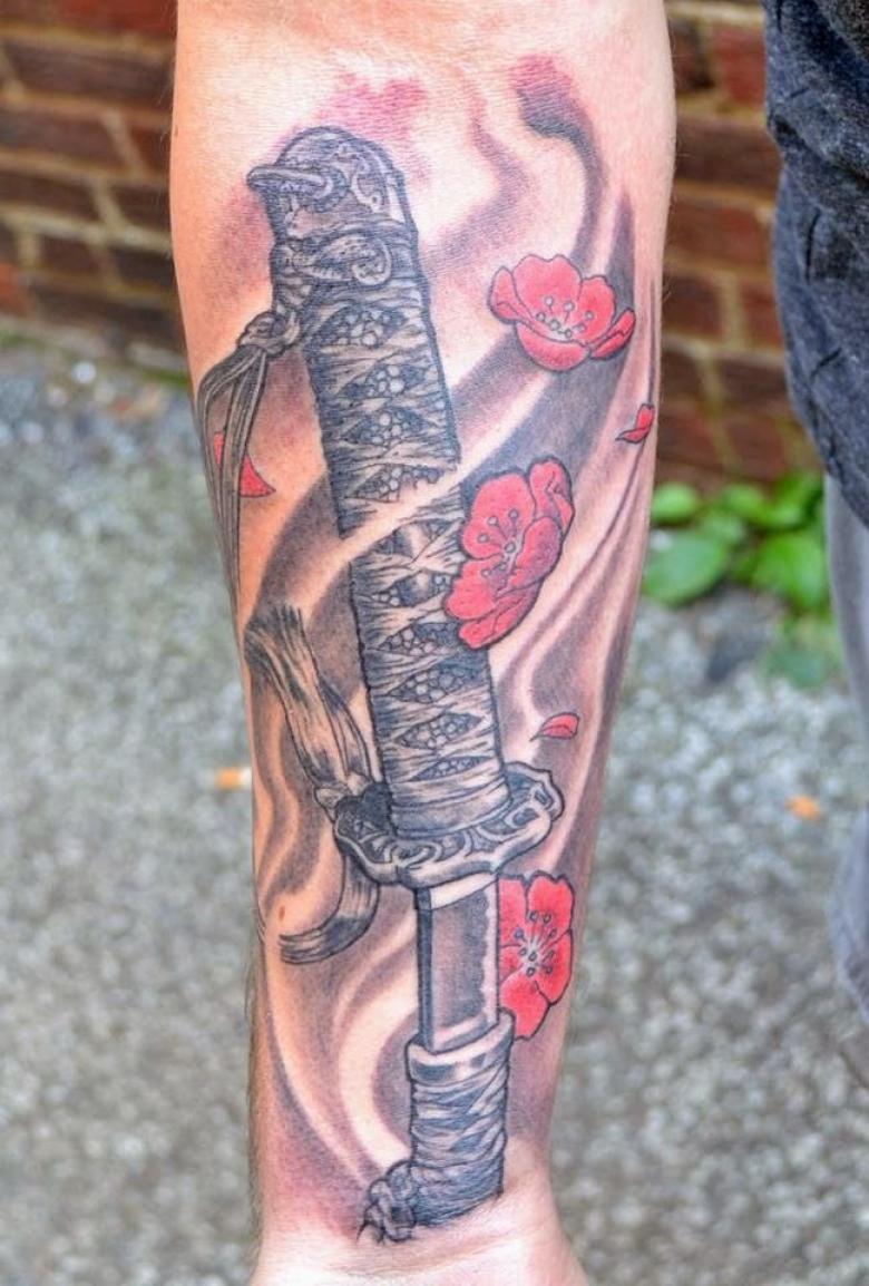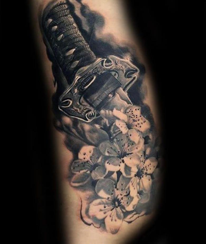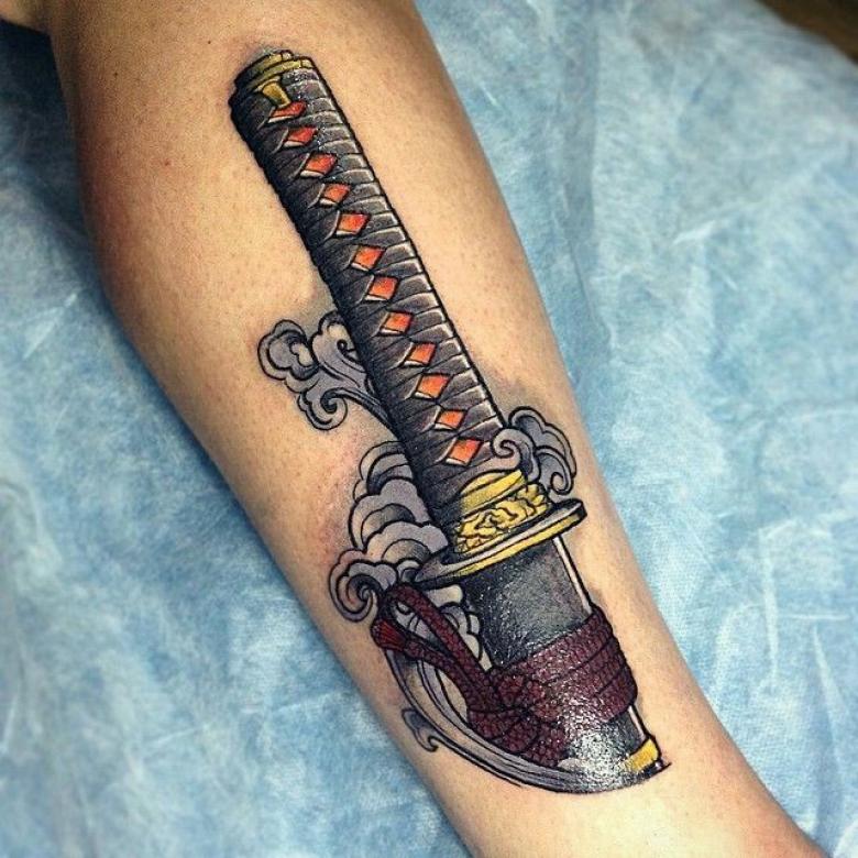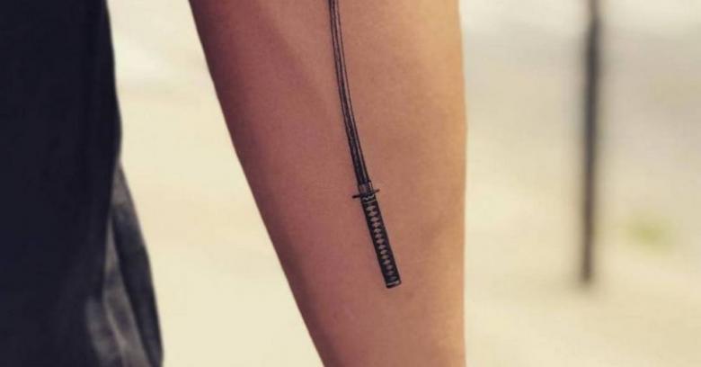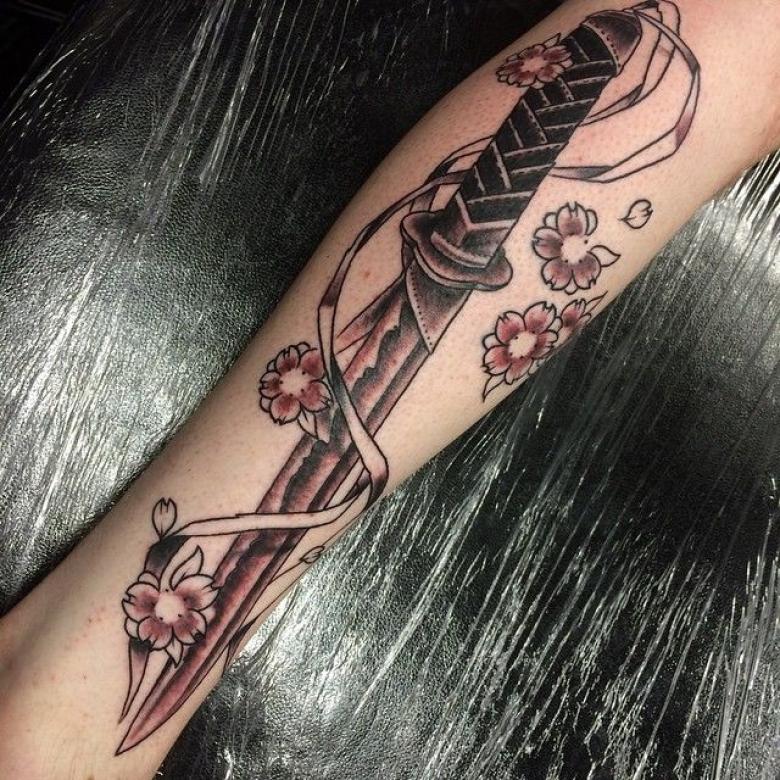 Tatouages au katana - description complète, éléments d'image supplémentaires (samouraï, fille, sakura), placement, motifs et photos