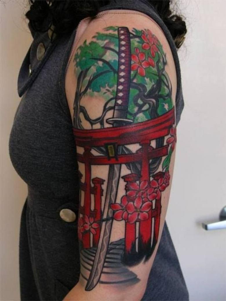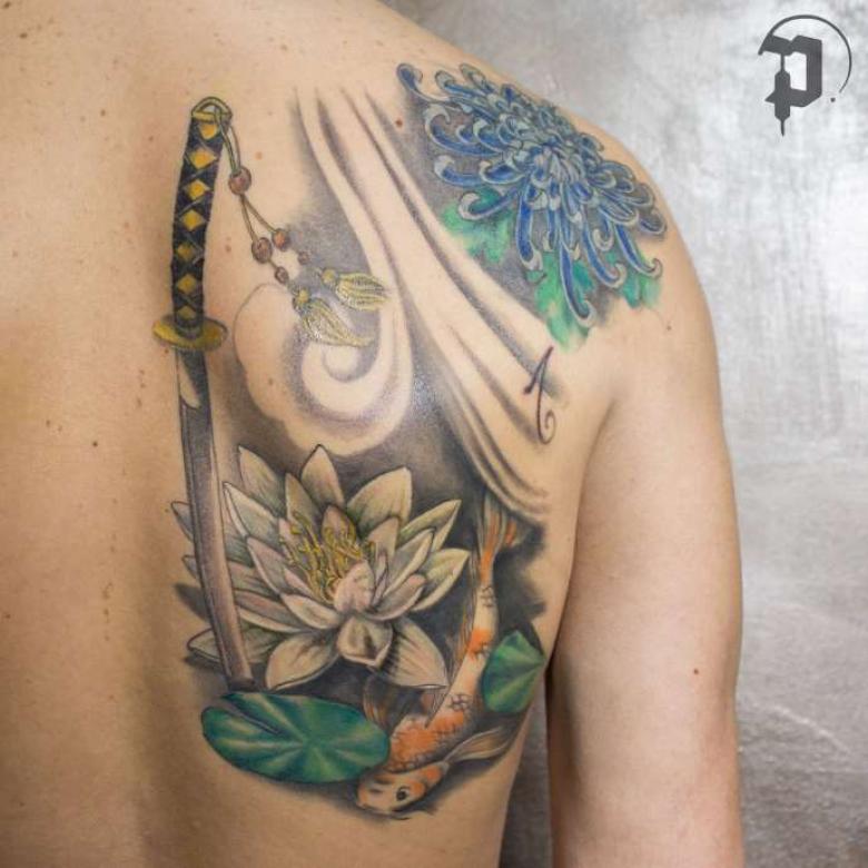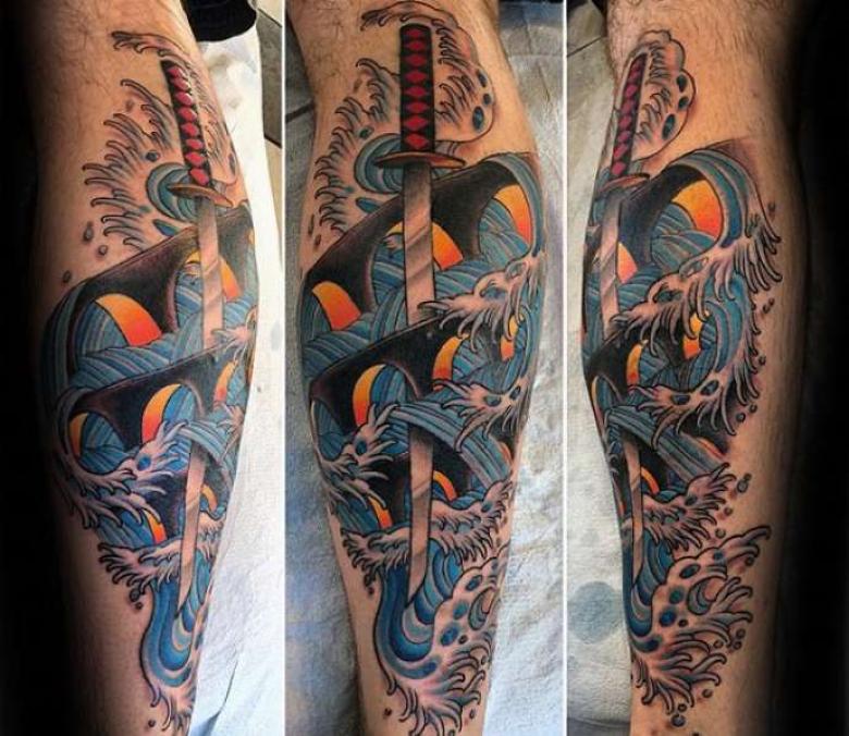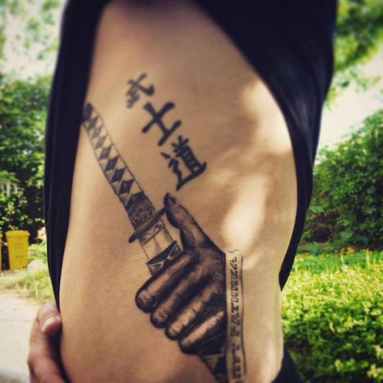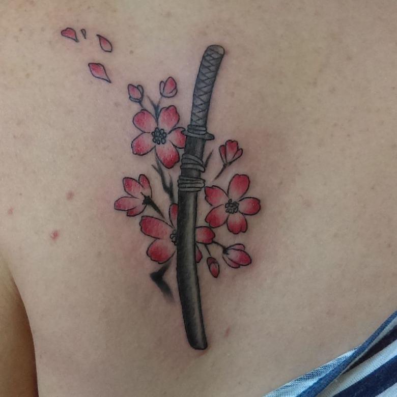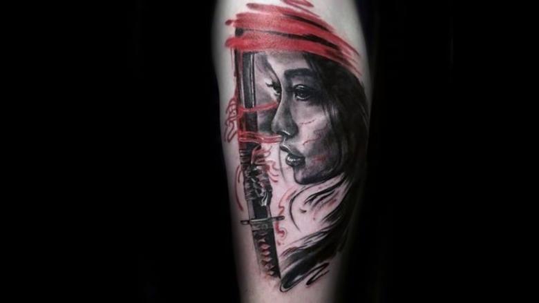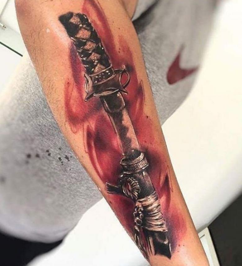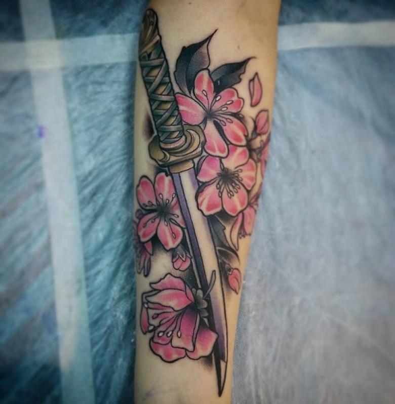 Tatouages au katana - description complète, éléments d'image supplémentaires (samouraï, fille, sakura), placement, motifs et photos