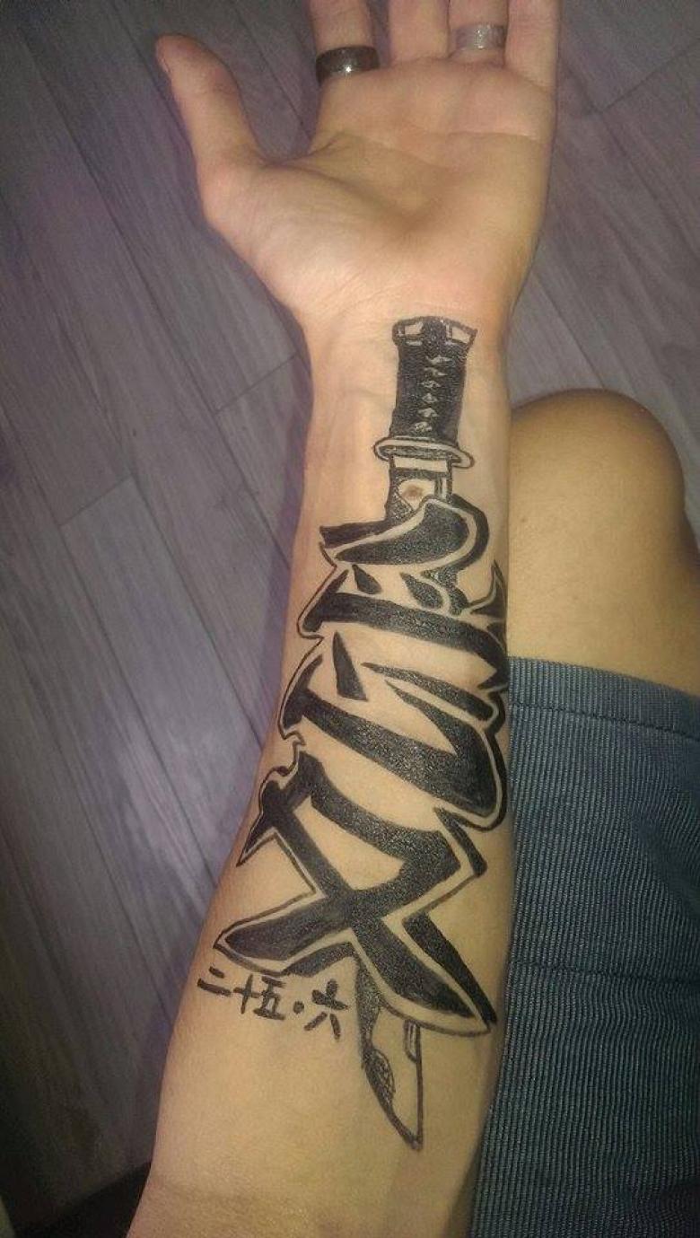 - Plutôt souvent avoir un katana représentants de la partie la plus forte de l'humanité de l'intérieur, sur la main de la courbure du coude au poignet.