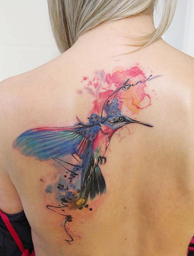 Tatouage d'un colibri - croquis et signification pour deux filles et deux hommes, types de tatouages d'un colibri (colorés ou en noir et blanc), où les placer (sur le bras, le poignet, le cou, la clavicule, l'omoplate), photos d'œuvres.