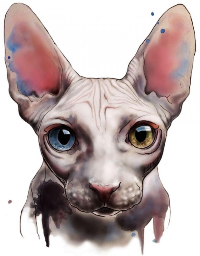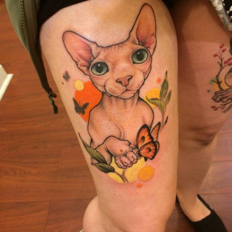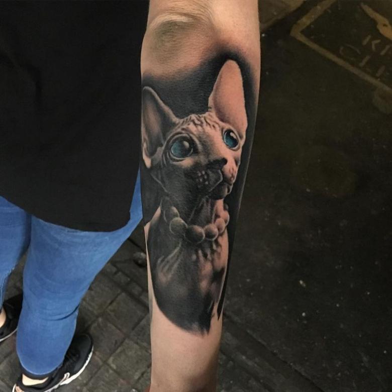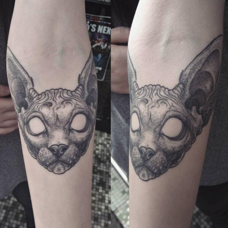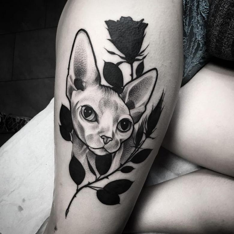 Choisir un tatouage avec un chat sphinx peut sembler agressif. En raison de son apparence extravagante : peau sans poils gonflés et courbes rugueuses du corps, cette race est perçue comme quelque chose de maléfique. En fait, ce n'est pas le cas. Les chats Sphynx sont des animaux loyaux et amicaux, qui rayonnent de sérénité et de non-conflit.