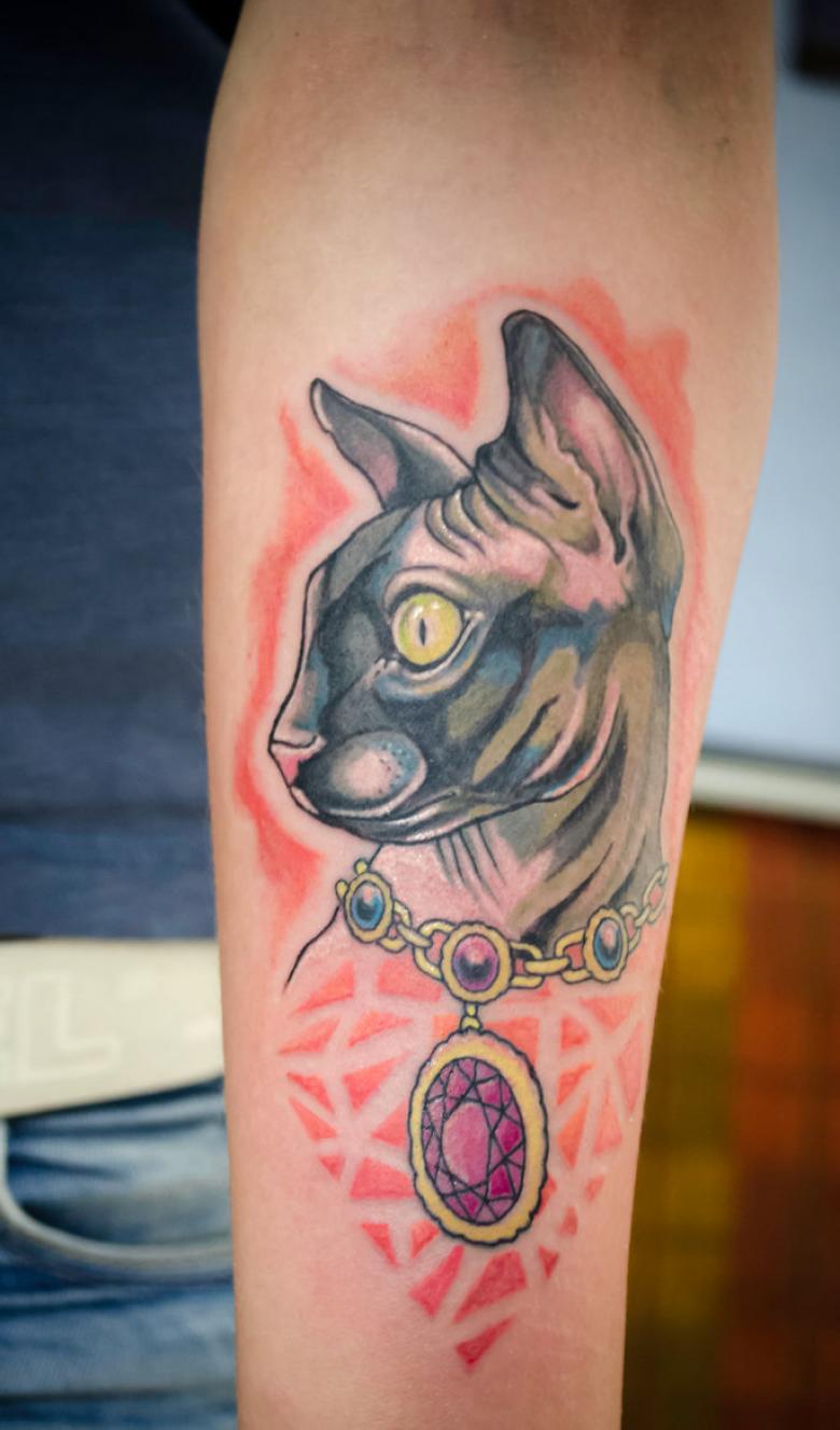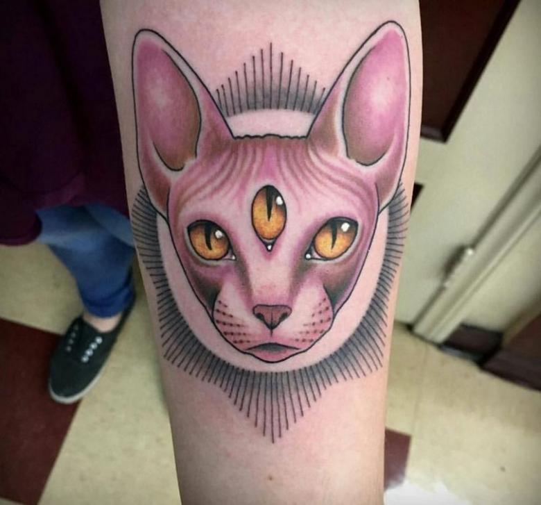 Les gens croient qu'un tatouage avec un chat sphinx devient une amulette qui peut protéger son propriétaire de tous les problèmes. L'énergie puissante de cet animal mystique protège contre le mauvais œil, la haine et l'envie.