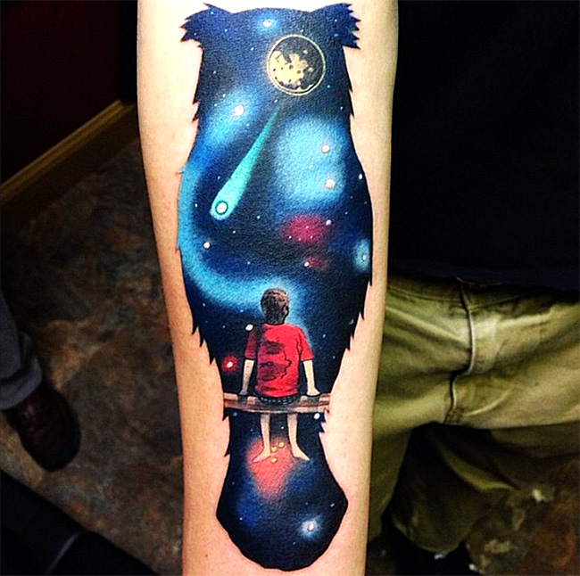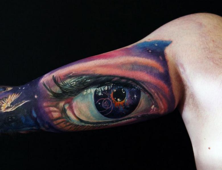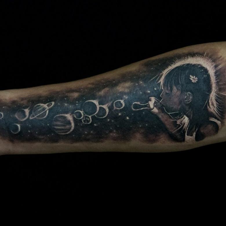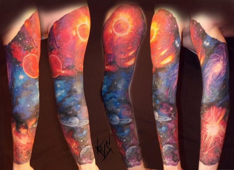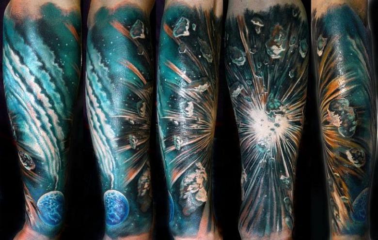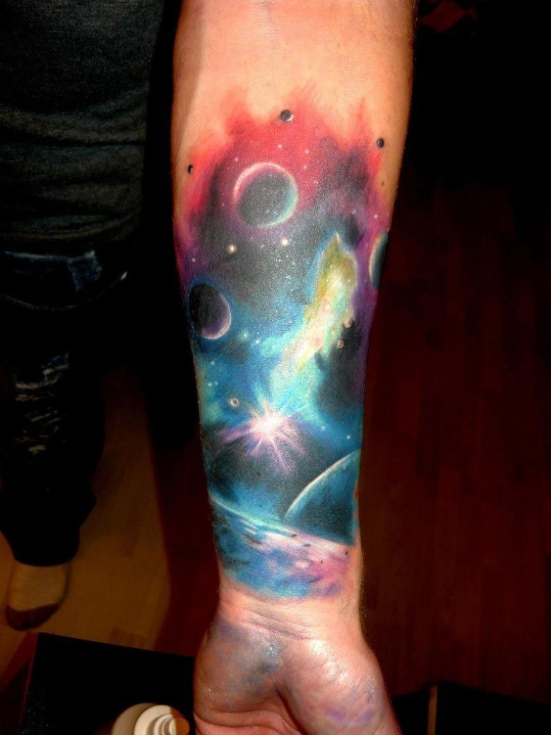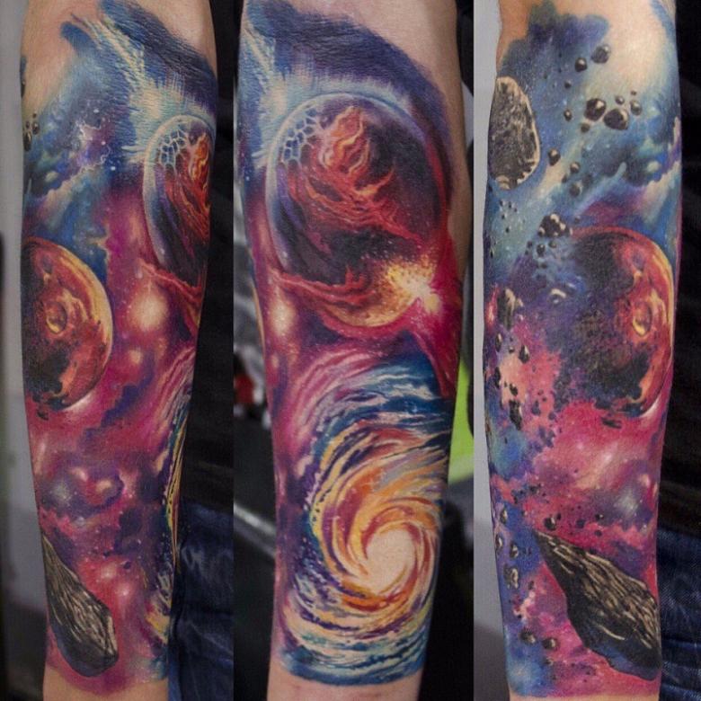 Le réalisme de l'espace, sa véritable échelle nécessite un grand espace. C'est le dos, les épaules, la poitrine, les cuisses, les mollets. Sur l'avant-bras, vous devriez afficher l'abstraction, la fantaisie, les galaxies, les amas d'étoiles. Mais ce ne sont que des recommandations. Le choix appartient toujours au client. Un bon salon de tatouage possède sa propre galerie de photos de l'espace. Un choix personnel est également autorisé, par exemple télécharger à partir du web, créer soi-même.
