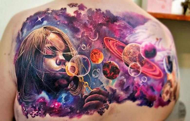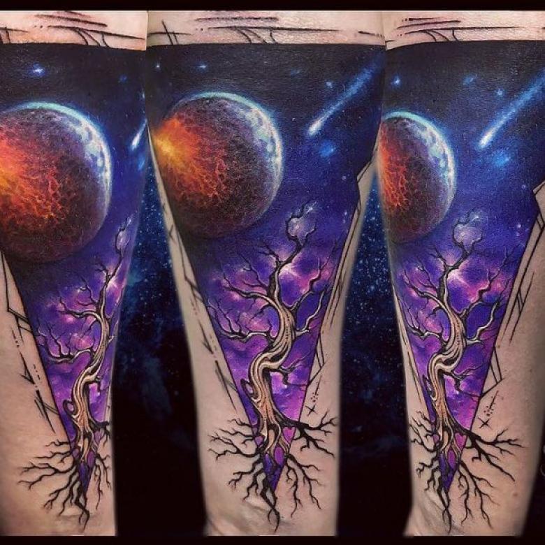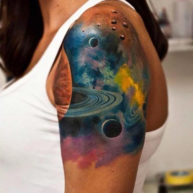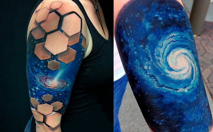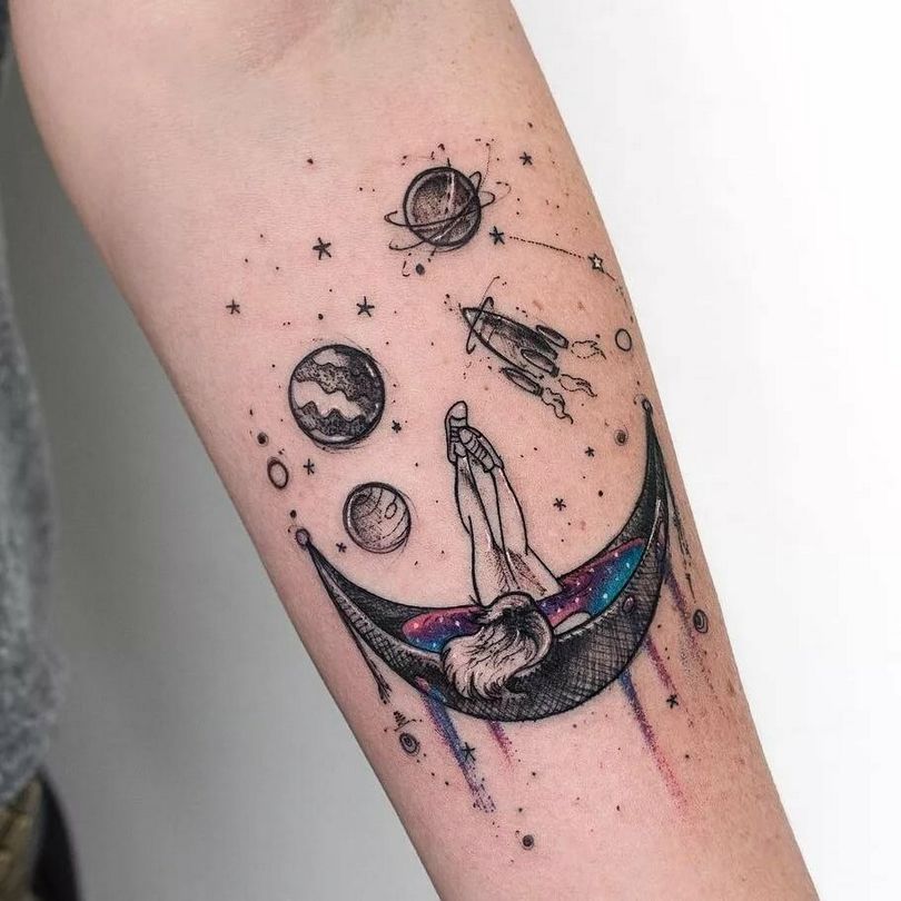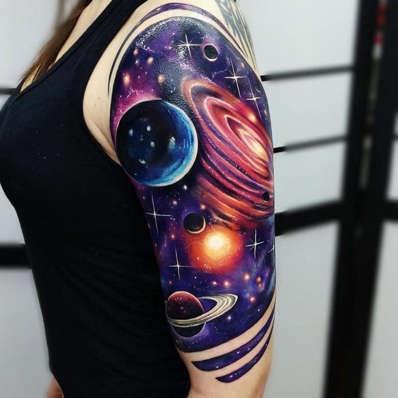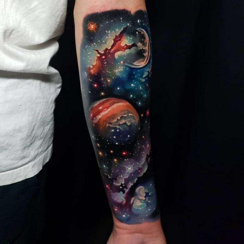 L'espace a de multiples facettes. Les jeunes et les personnes d'âge mûr, les hommes et les femmes trouveront leur propre composition. L'échelle de l'univers ne doit pas être transmise dans son intégralité. La technologie permet également de réaliser des tatouages plus petits. Mais d'abord, il convient de décider du thème du dessin.
