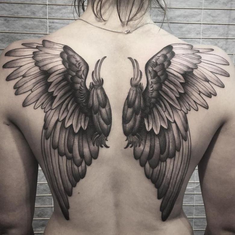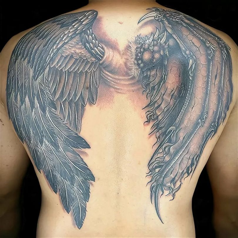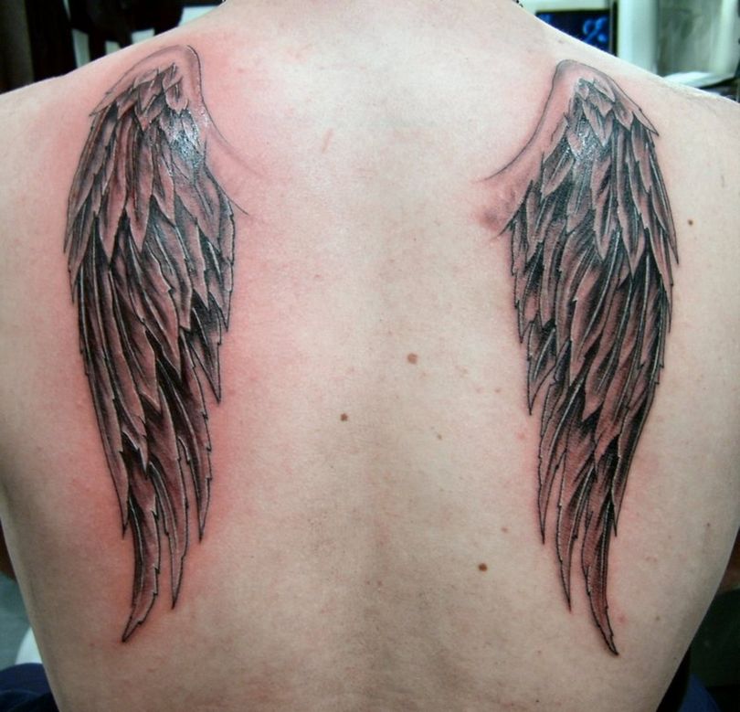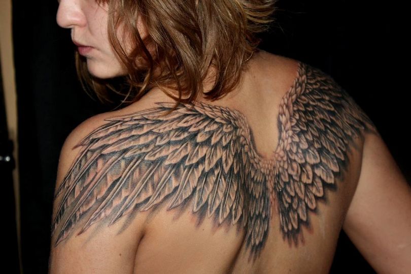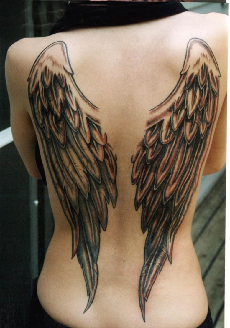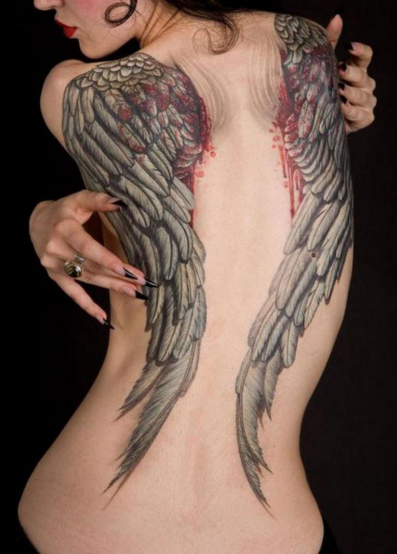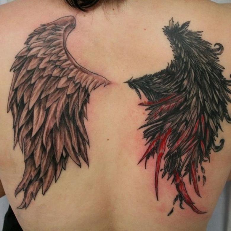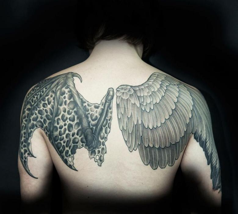Un tatouage d'ailes dans le dos a une signification ambiguë. Le dessin se rapporte aux anges et la technique et les couleurs utilisées définissent l'essence du personnage : l'aspect bon ou mauvais de l'ange.