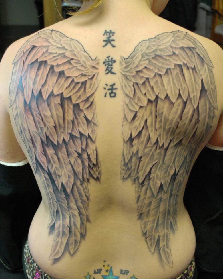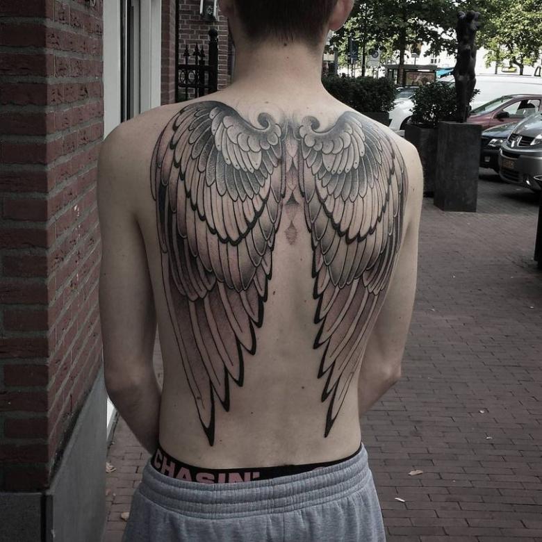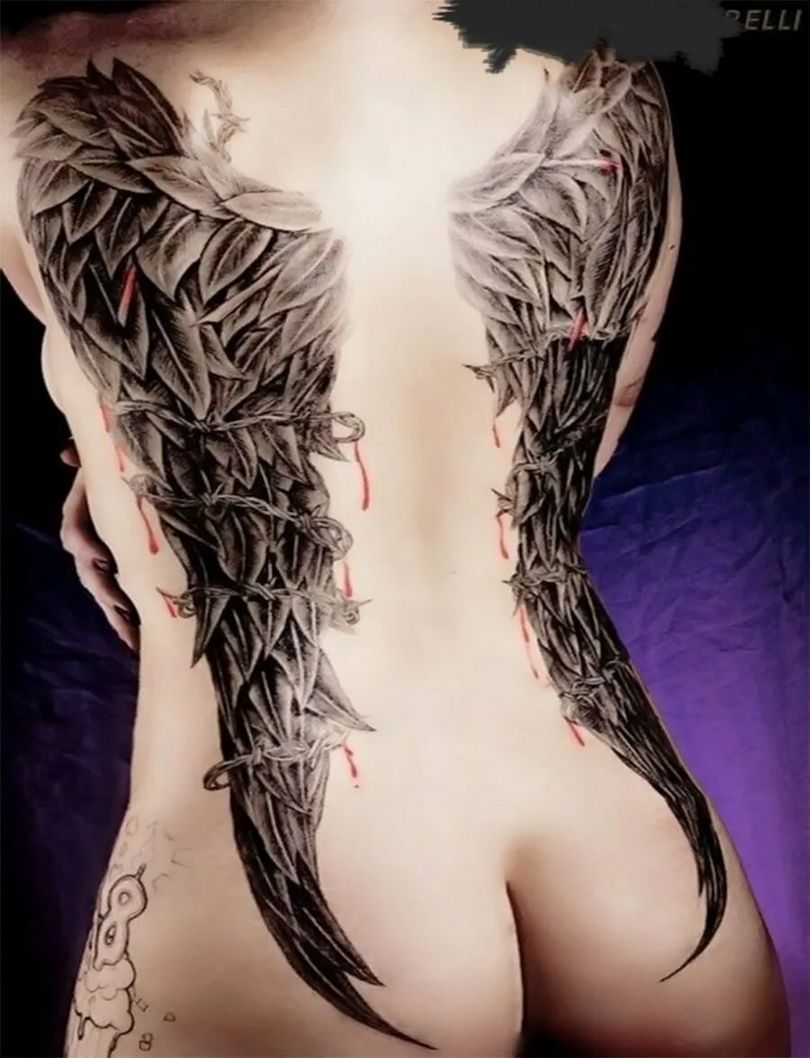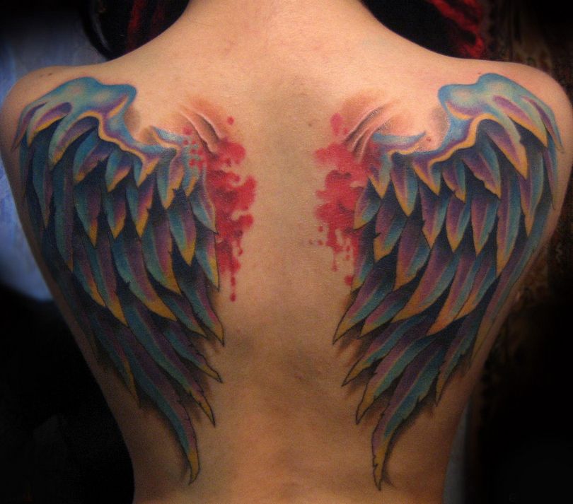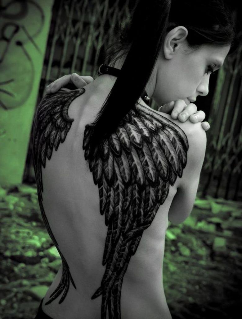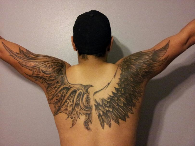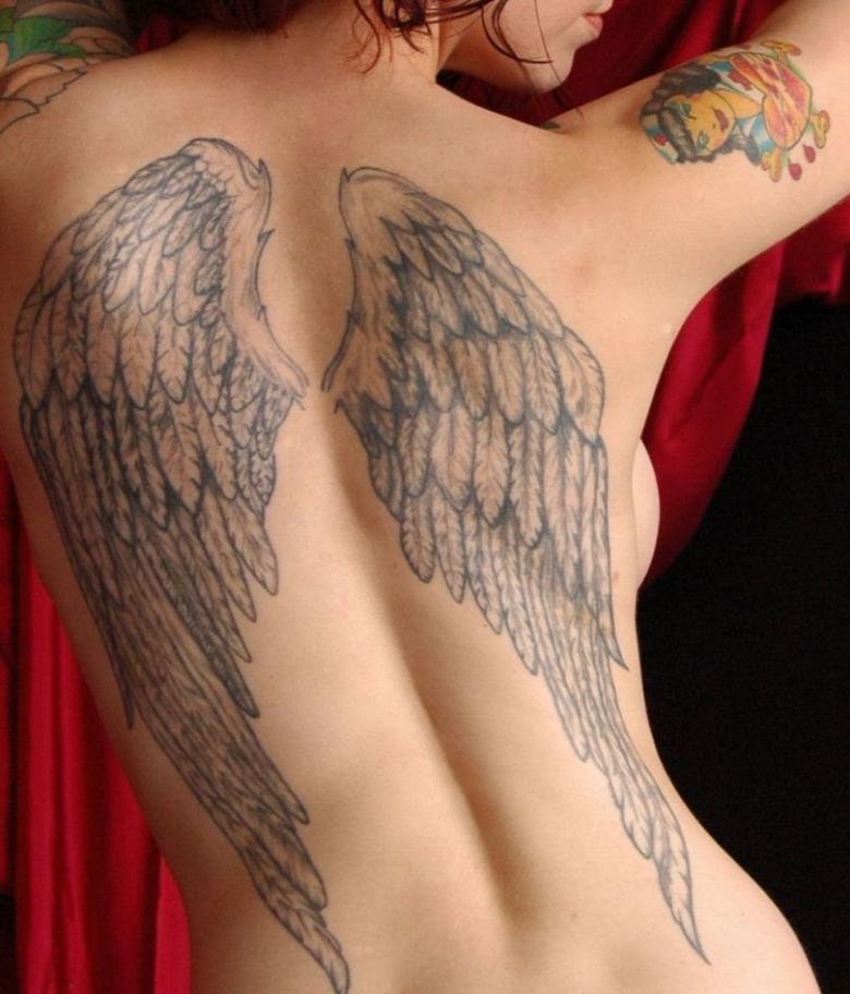 Un tatouage d'ailes dans le dos a une signification ambiguë. Le dessin se rapporte aux anges et la technique et les couleurs utilisées définissent l'essence du personnage : l'aspect bon ou mauvais de l'ange.