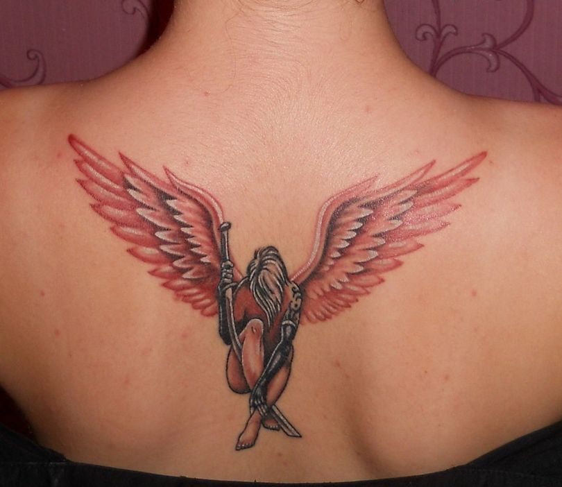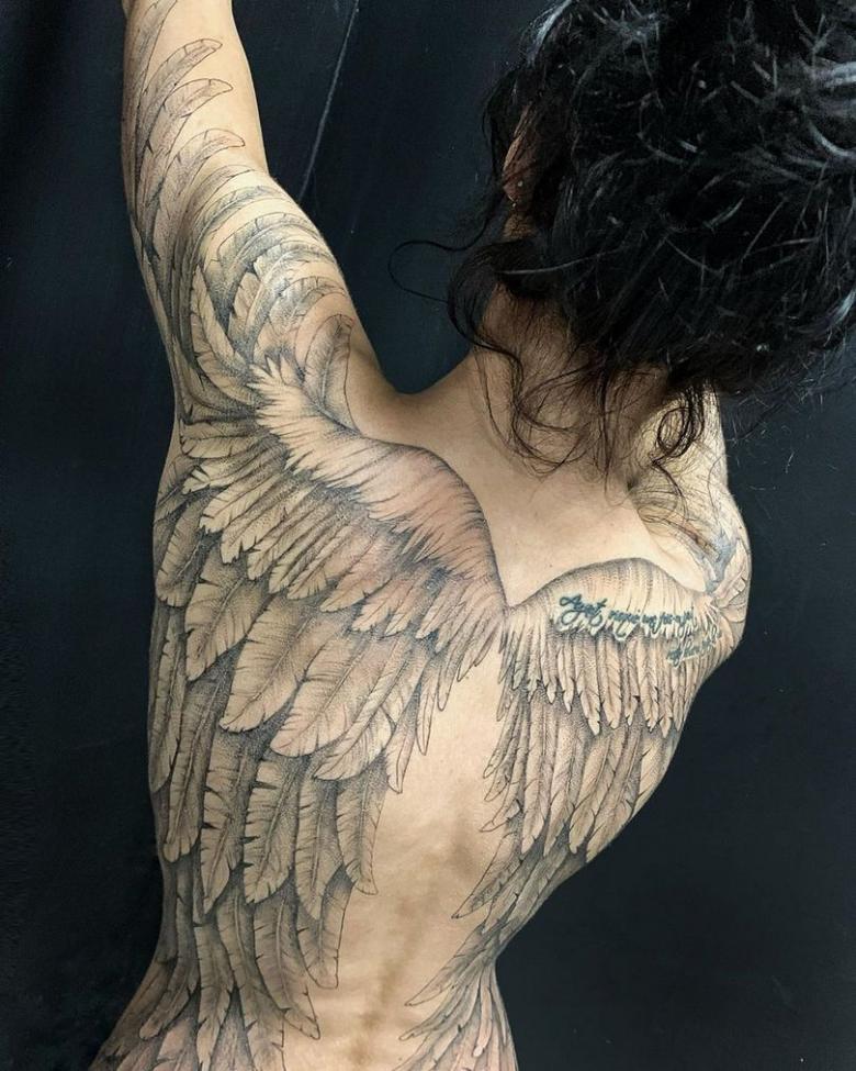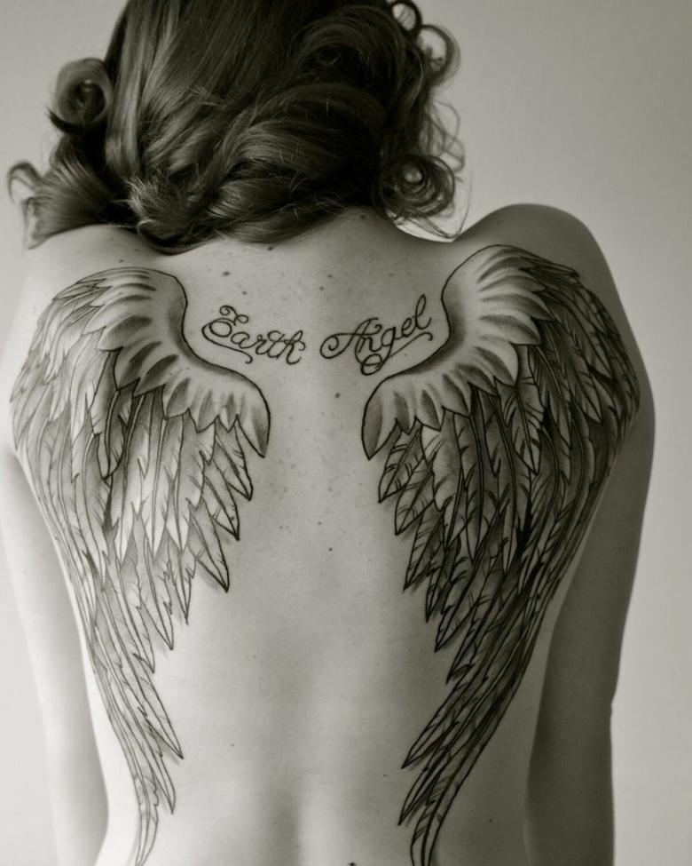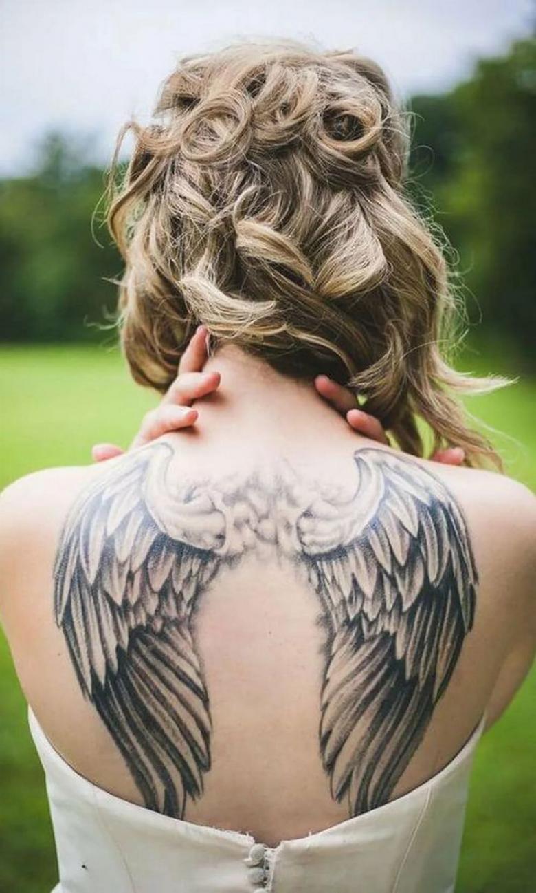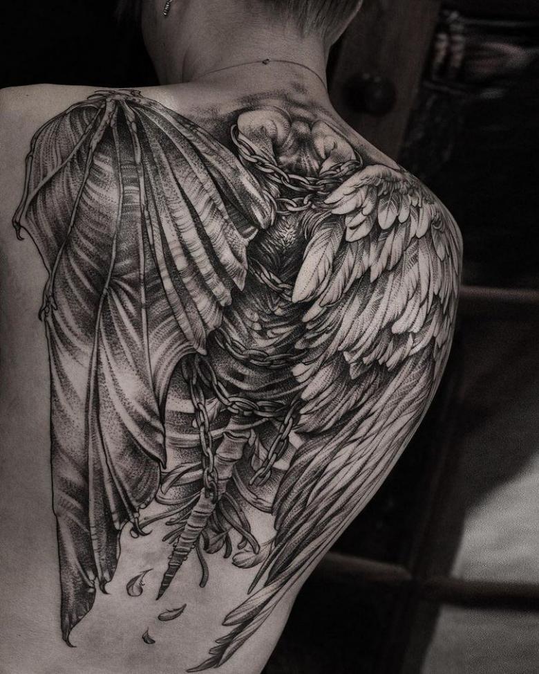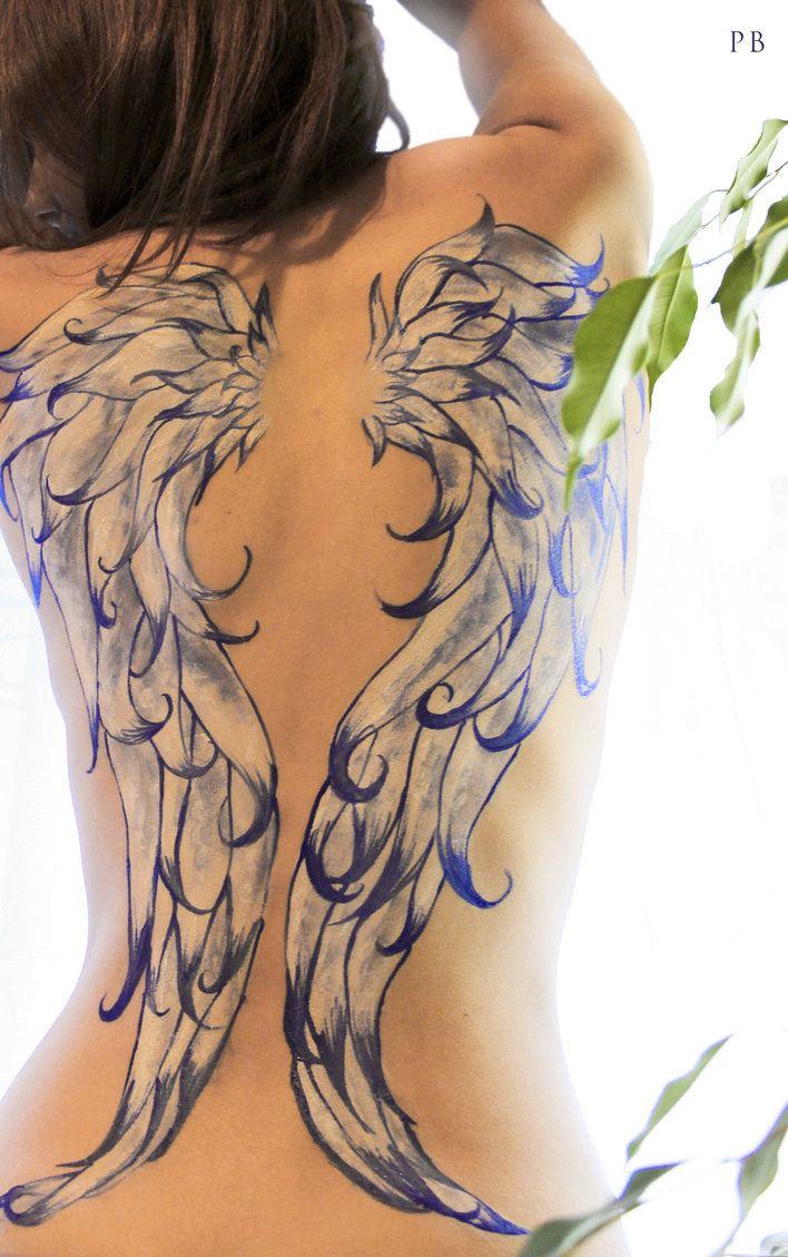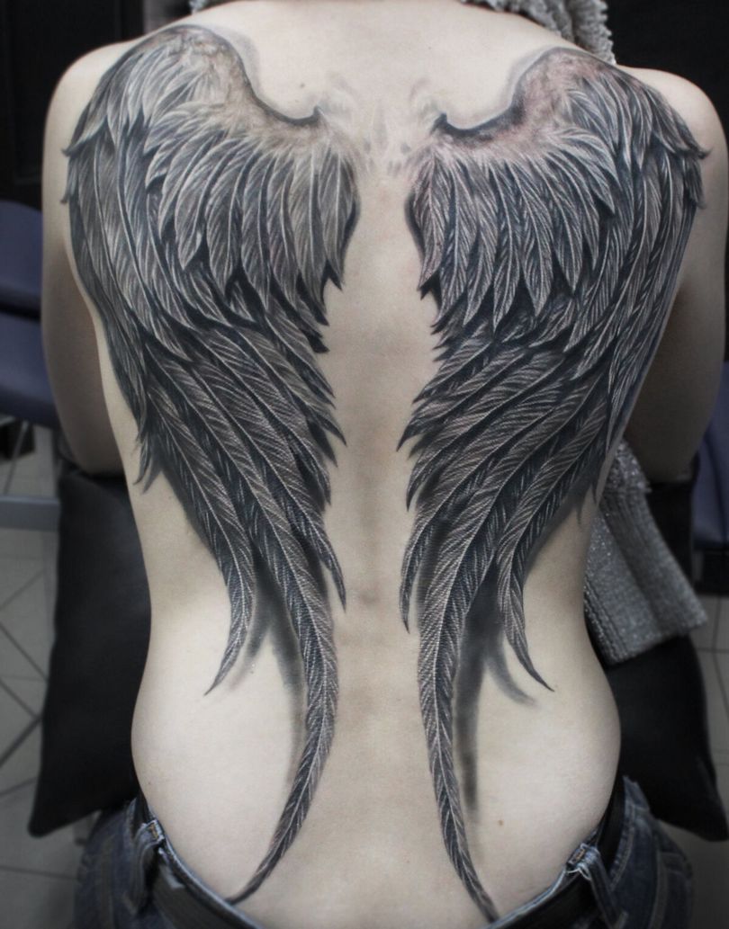 Un tatouage d'ailes dans le dos a une signification ambiguë. Le dessin se rapporte aux anges et la technique et les couleurs utilisées définissent l'essence du personnage : l'aspect bon ou mauvais de l'ange.