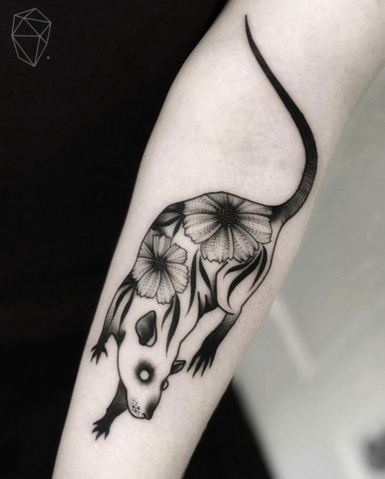 Le tatouage représente souvent un beau rat à poils blancs, aux yeux expressifs et au museau mignon. Cette image est décorée de fleurs, d'ornements floraux qui soulignent la douceur et la nature romantique du personnage.