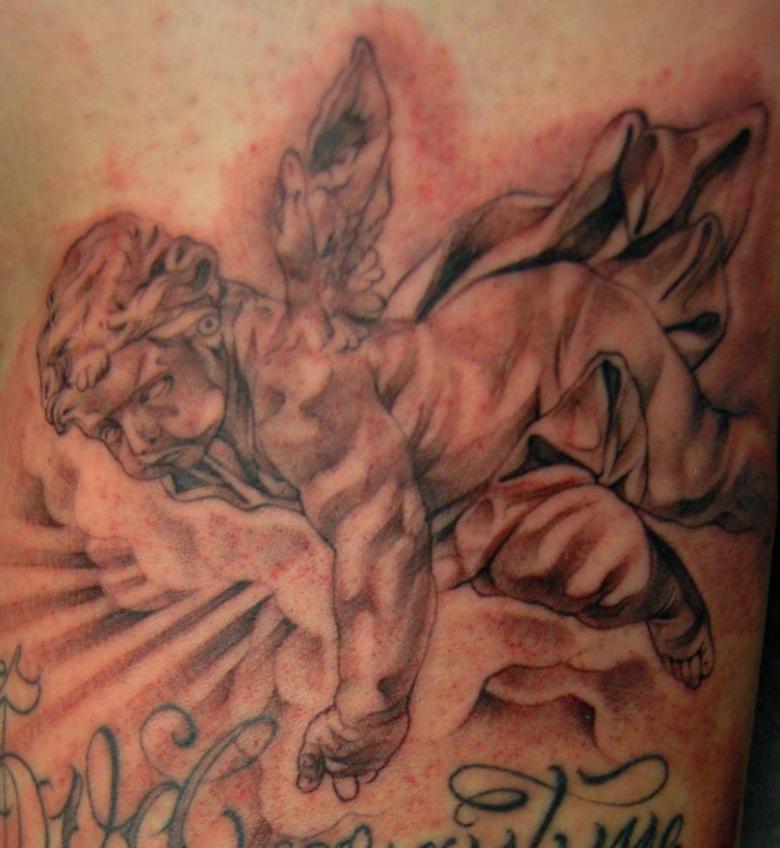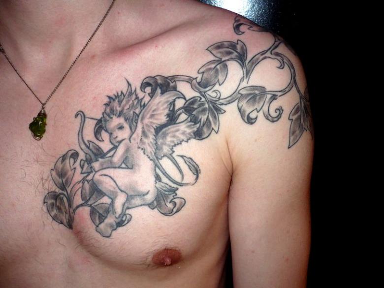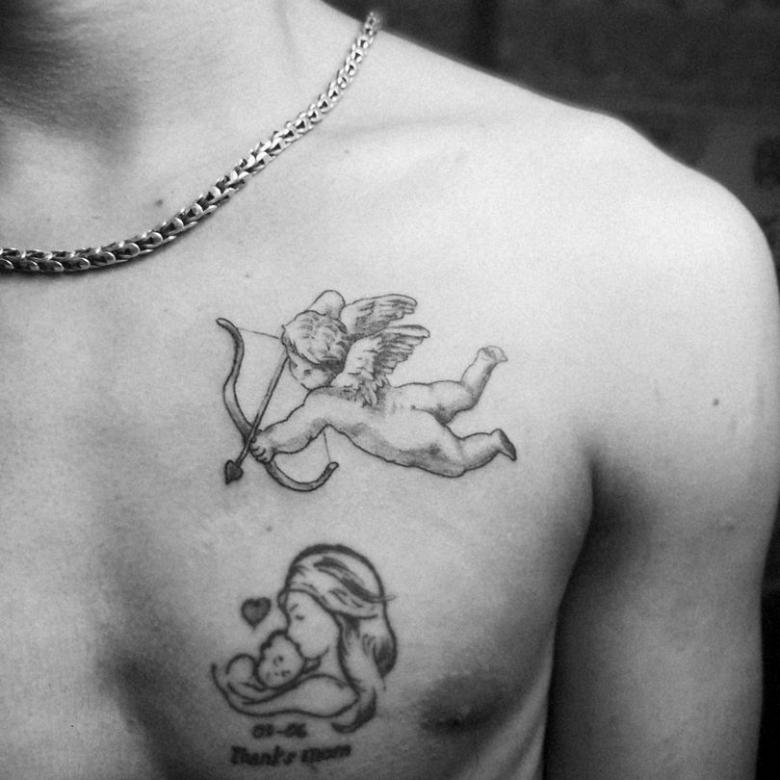 Le Cupidon souriant et malicieux sur le corps caractérise le porteur comme un homme à femmes qui peut gagner le cœur de n'importe quelle fille. Les hommes de cette catégorie s'attirent facilement les faveurs des femmes et attirent toujours l'attention sur eux. Un grand nombre d'histoires d'amour et de romans ne pèsent pas sur le propriétaire d'un tel tatouage, au contraire, de nouvelles dates et des sentiments élevés l'inspirent et l'encouragent.