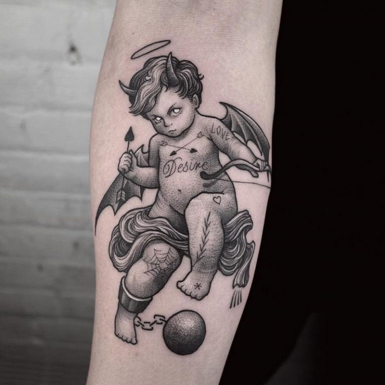 L'image de Cupidon est un type de tatouage d'ange et de chérubin. Le tatouage d'un ange est le propriétaire comme un talisman, qui lui donne en plus de la protection, une grande énergie. À son tour, Cupidon occupe une place importante dans la collection de dessins populaires qui attirent beaucoup d'attention.