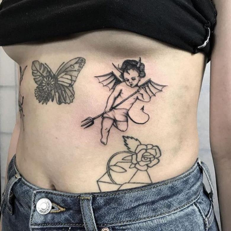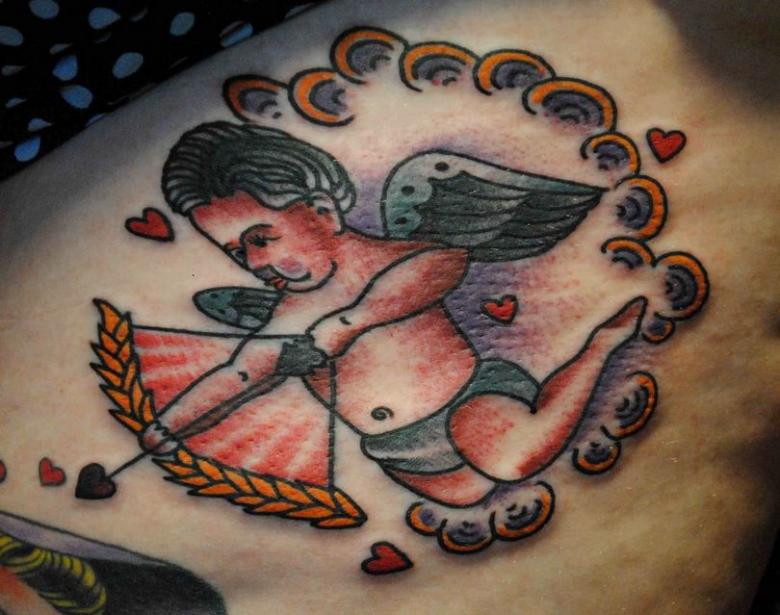 Les filles, avec le tatouage de Cupidon, reflètent leur stade de tomber amoureuse, en essayant d'augmenter leurs sentiments déjà grands pour leur partenaire. L'illustration corporelle, vive et colorée, montre la positivité et la joie avec lesquelles le porteur aborde la vie :