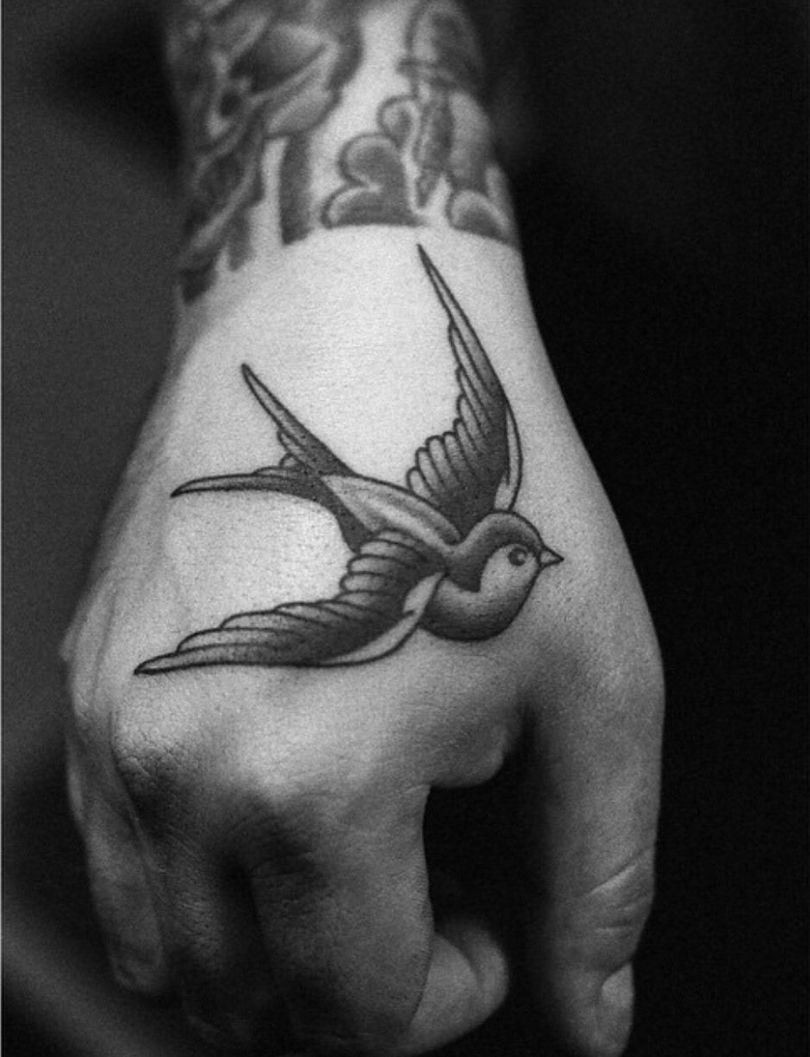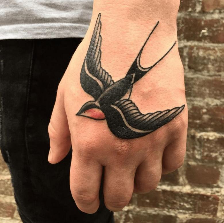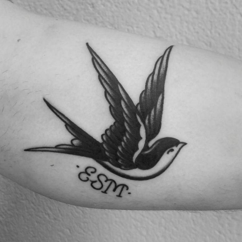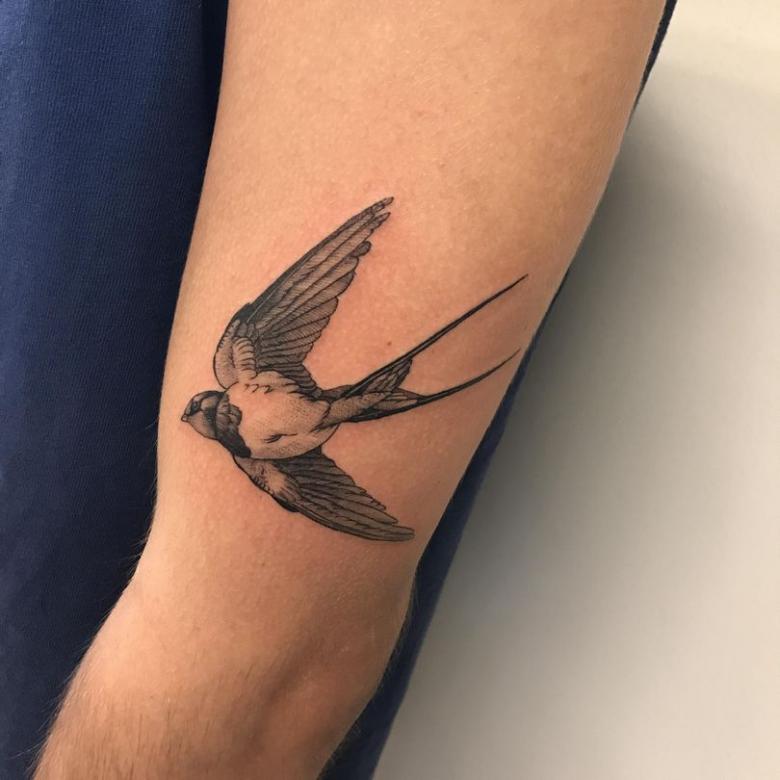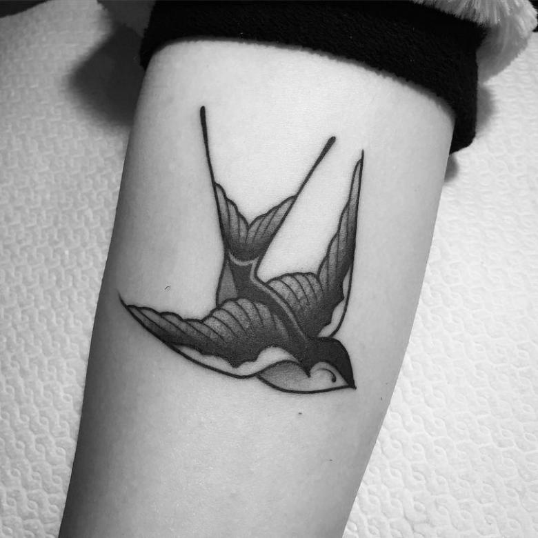 Le tatouage avec une hirondelle est un ornement traditionnel du corps d'un marin. Au départ, il a été emporté par le style simplifié de l'ancienne école, car aucune autre option n'était disponible. Ils se sont appuyés sur le symbolisme associé à l'hirondelle - elle est considérée comme un signe annonciateur de l'approche de la grande terre. C'est pourquoi ils l'appréciaient comme un talisman leur permettant de rentrer chez eux en toute sécurité.