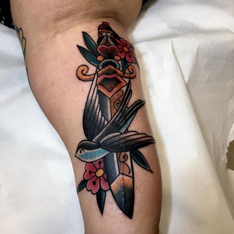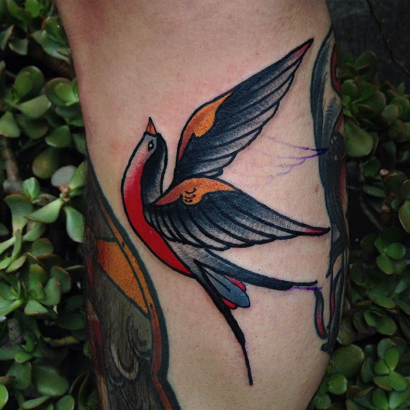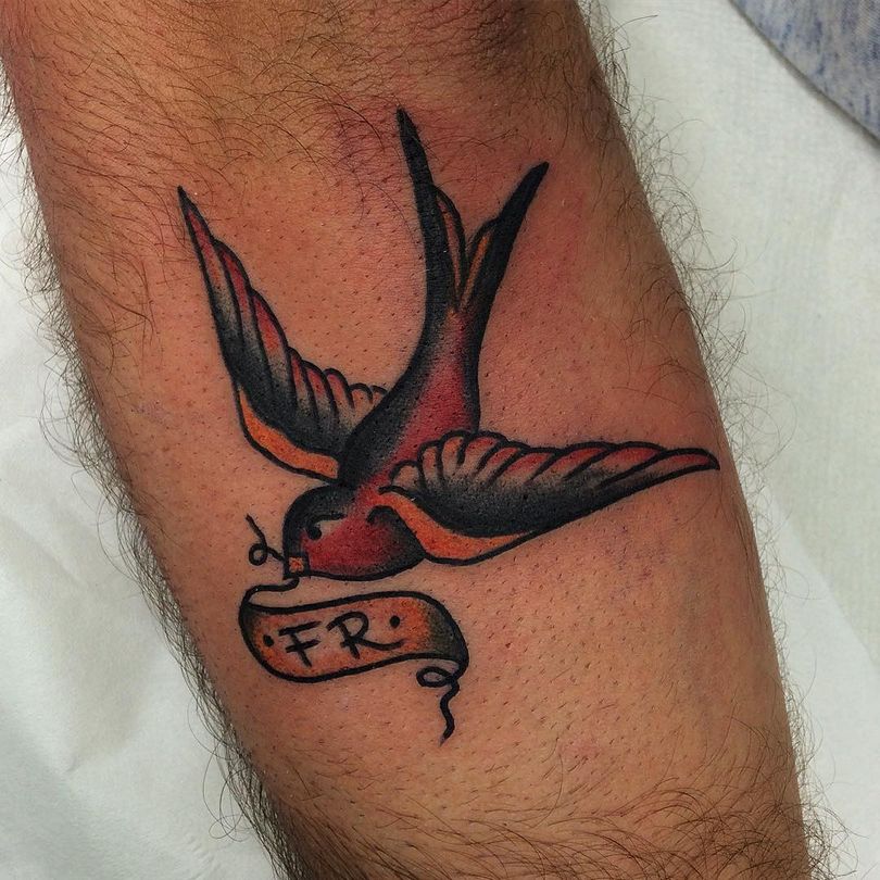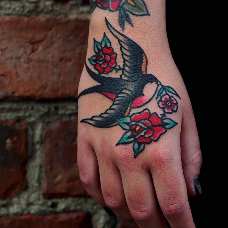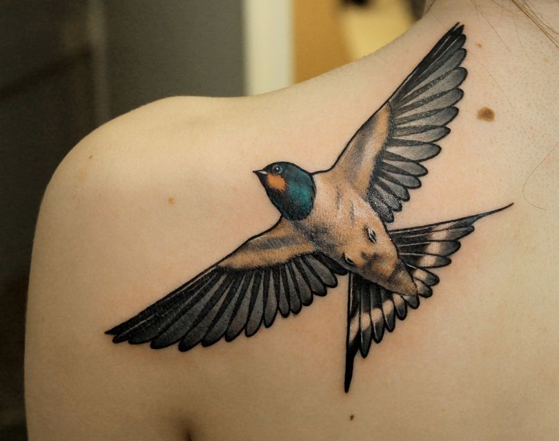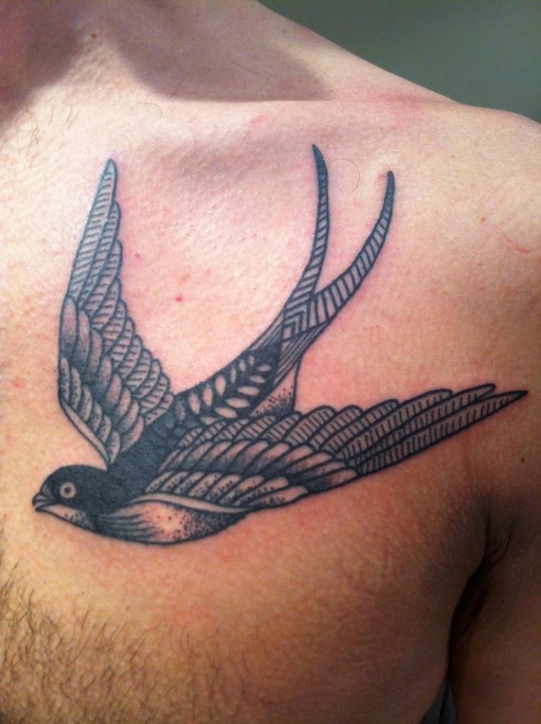 Le tatouage avec une hirondelle est un ornement traditionnel du corps d'un marin. Au départ, il a été emporté par le style simplifié de l'ancienne école, car aucune autre option n'était disponible. Ils se sont appuyés sur le symbolisme associé à l'hirondelle - elle est considérée comme un signe annonciateur de l'approche de la grande terre. C'est pourquoi ils l'appréciaient comme un talisman leur permettant de rentrer chez eux en toute sécurité.