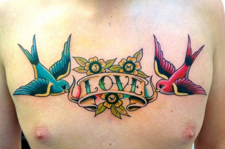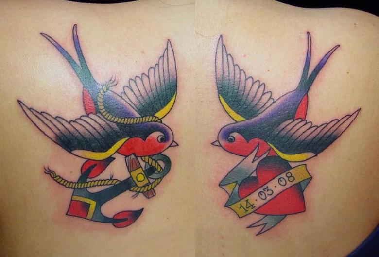 Un tatouage représentant deux hirondelles volant vers une rencontre symbolise la fidélité. L'hirondelle est un symbole de fidélité ou de bonheur, souvent utilisé par les amoureux pour exprimer leurs sentiments par des associations avec le nid familial de l'hirondelle.