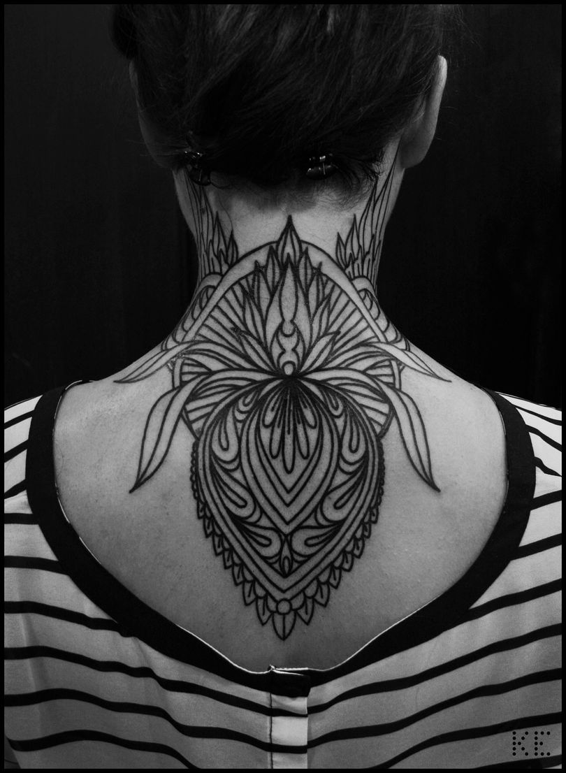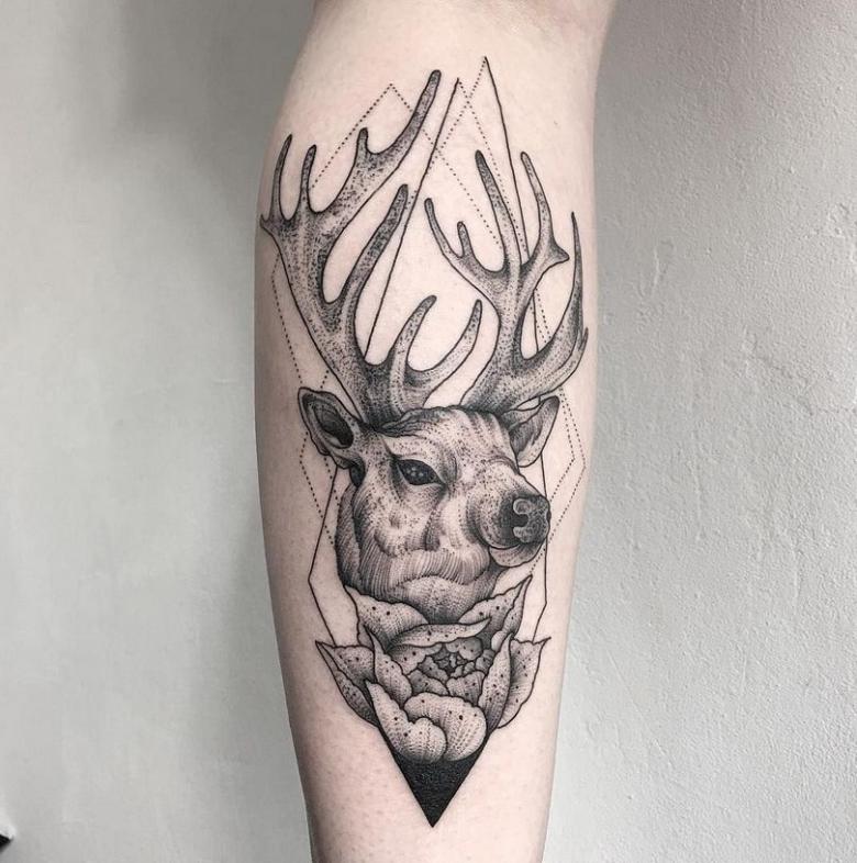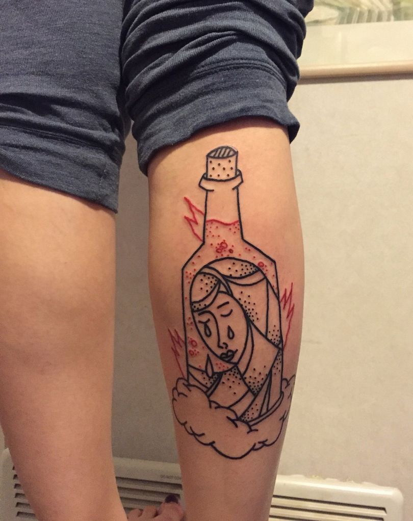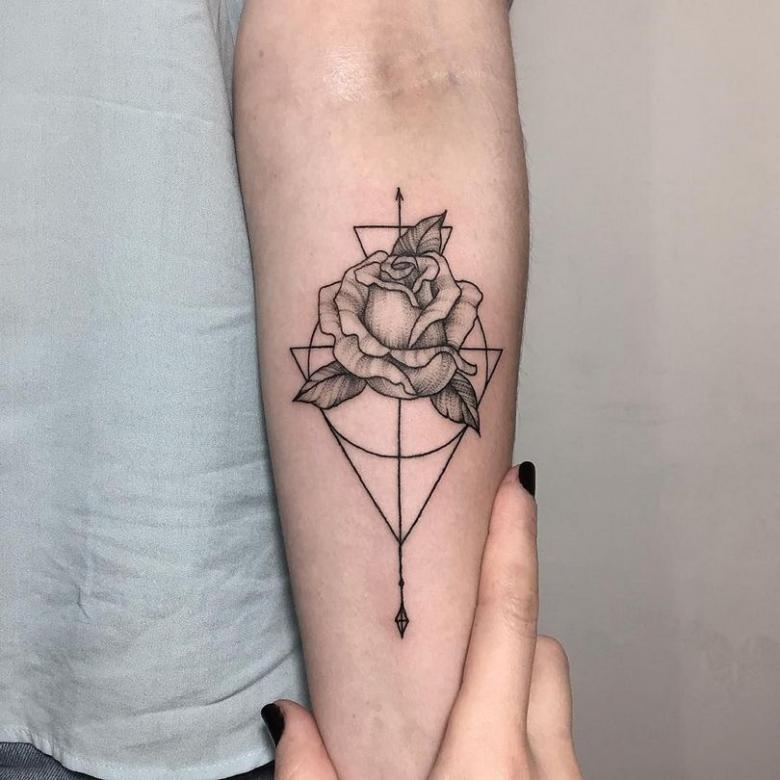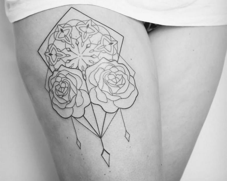 Les tatouages de ce style se combinent bien avec le Dotwork, le blackwork, ainsi qu'avec les aquarelles. La règle principale du style - l'image ne doit pas être déformée ou asymétrique. Tous les contours doivent être de la même épaisseur et ininterrompus. Des détails supplémentaires aideront à exprimer l'intrigue principale.