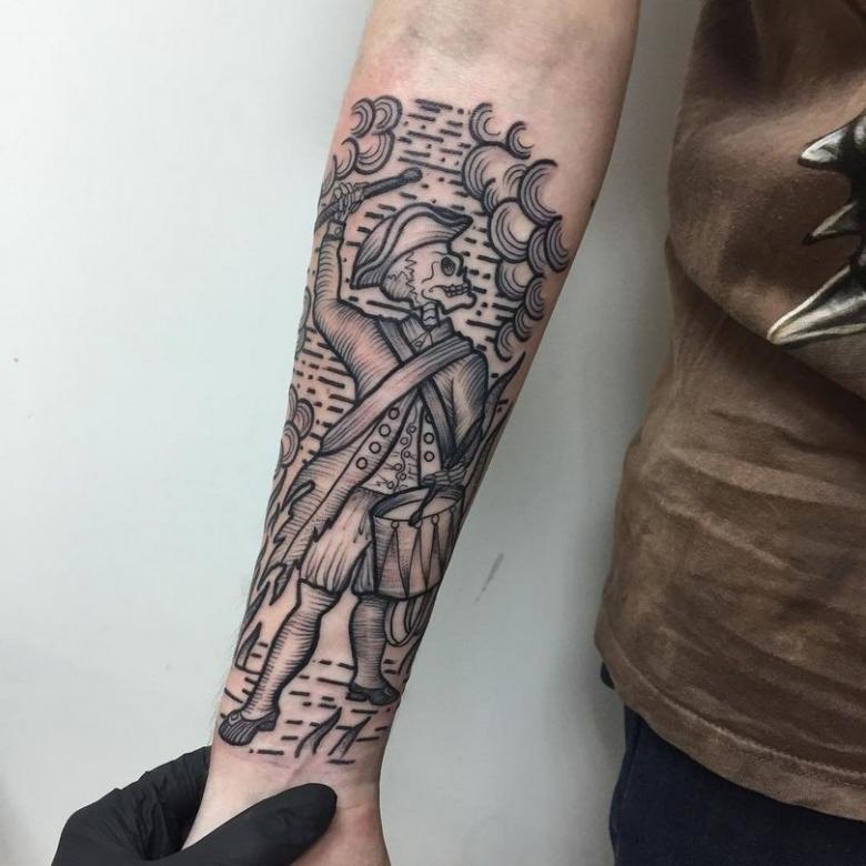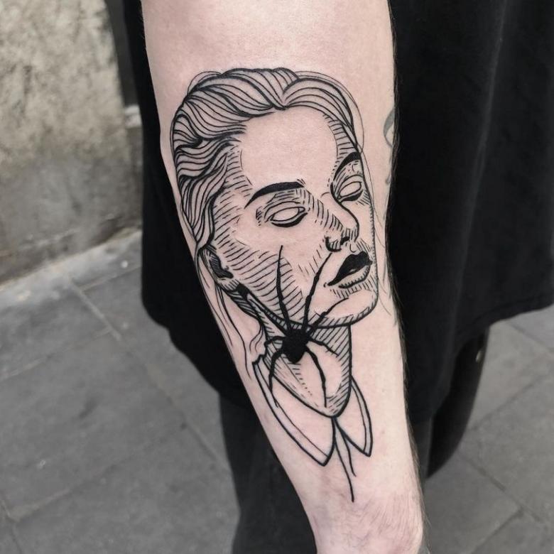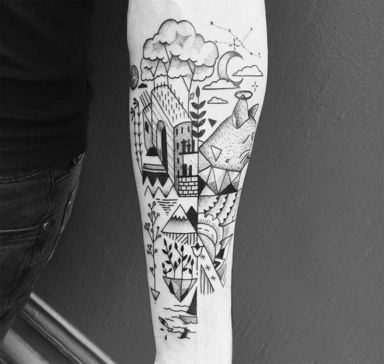 Mais le dessin au trait donne plus de créativité au tatouage, car il permet de mélanger différents styles et tendances dans l'art de la peinture corporelle. Le mot "linework" lui-même contient les mots anglais "line and work" et se traduit en russe par "travail en ligne" ou "travail en ligne".