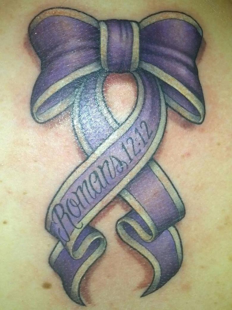 - Le tatouage du ruban violet symbolise certains cancers, notamment le cancer des testicules, le cancer du pancréas et le cancer de la thyroïde.