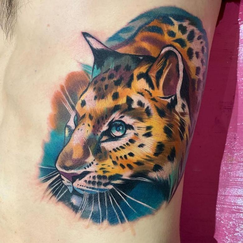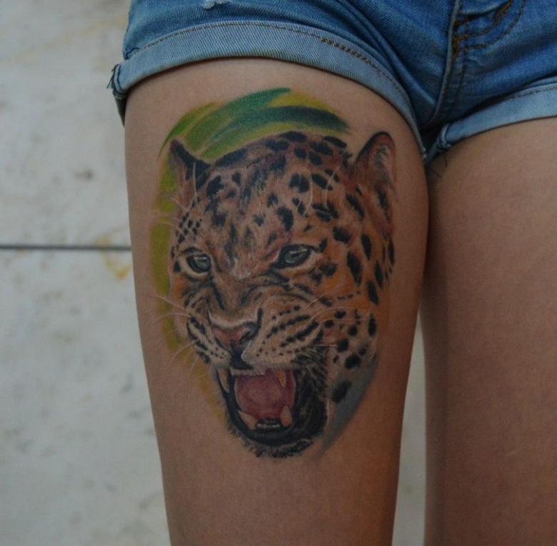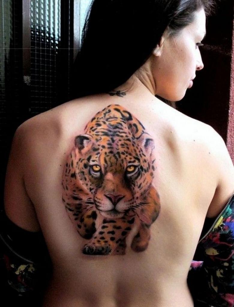 Il souligne la grâce féminine et la beauté de la silhouette, la supériorité sur les autres filles, la liberté et une certaine présence du glamour. Les femmes du beau sexe adorent la version colorée du tatouage léopard. Cette image vibrante démontre la fertilité et la loyauté envers un seul homme.