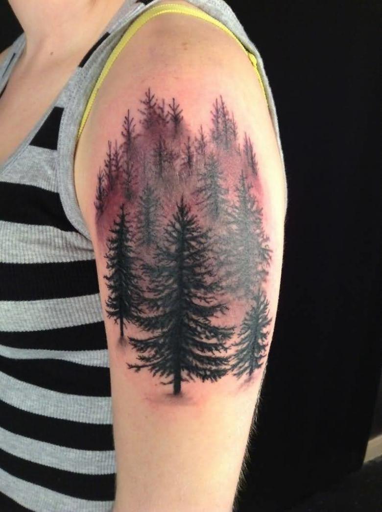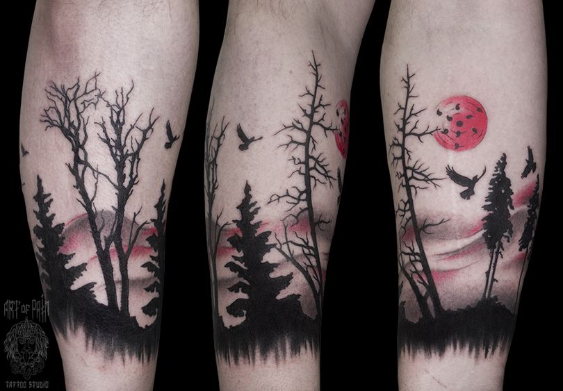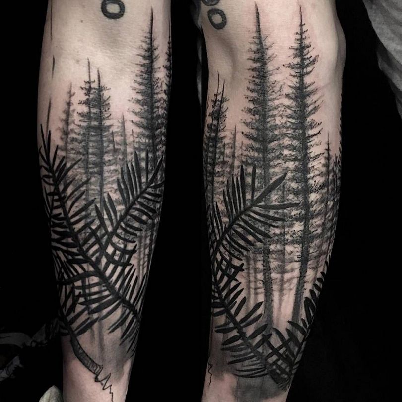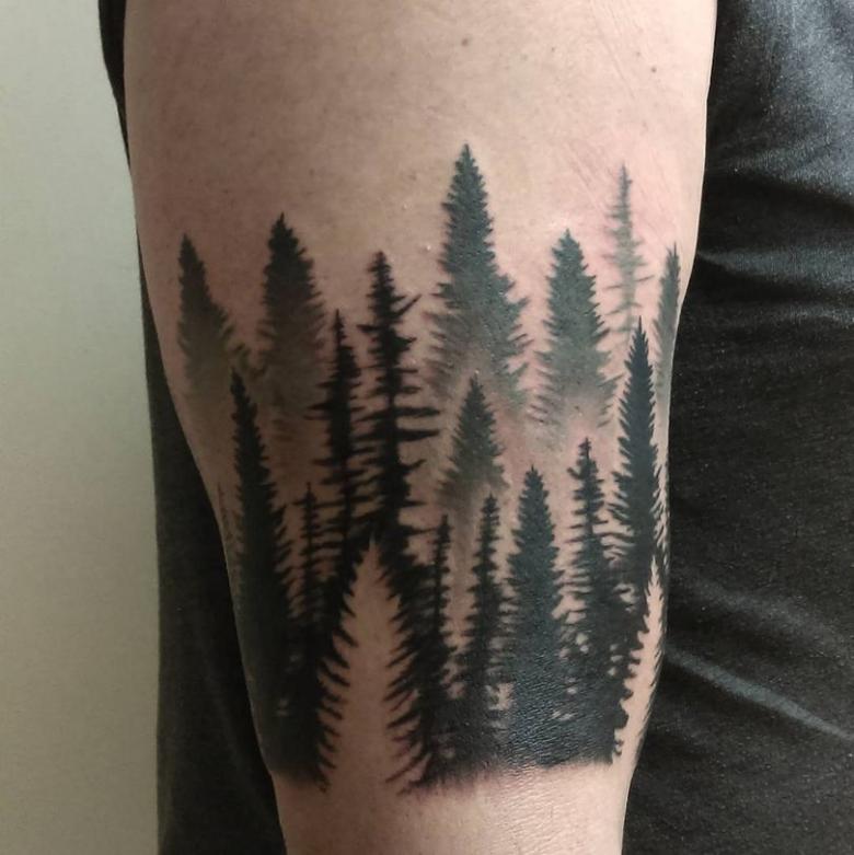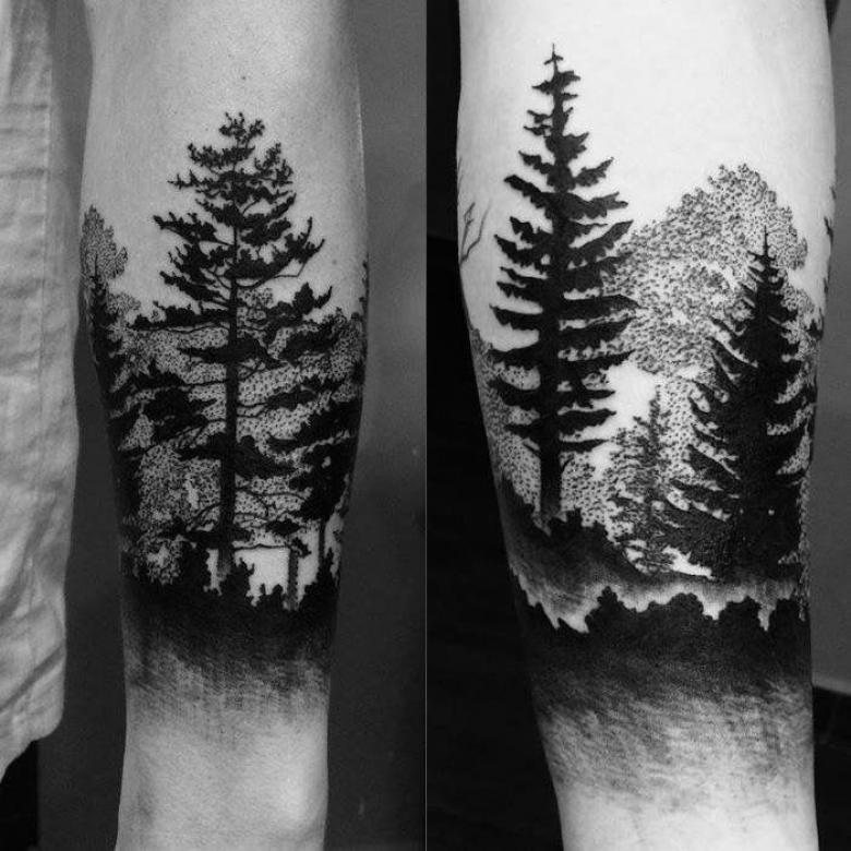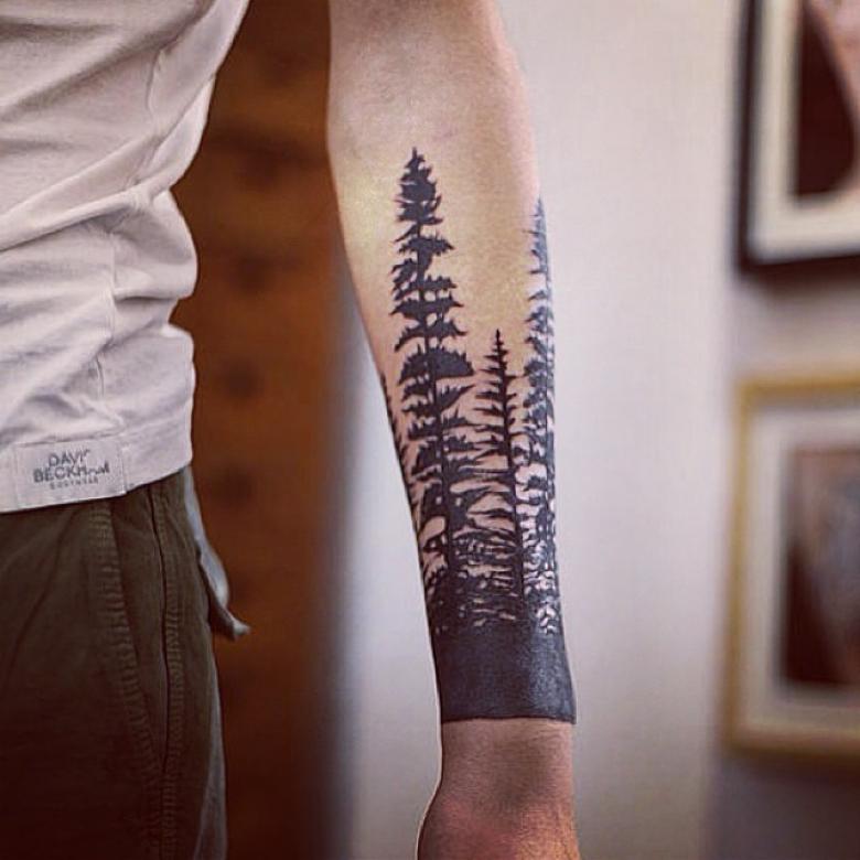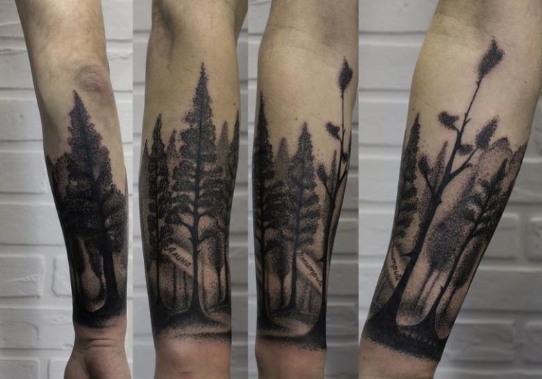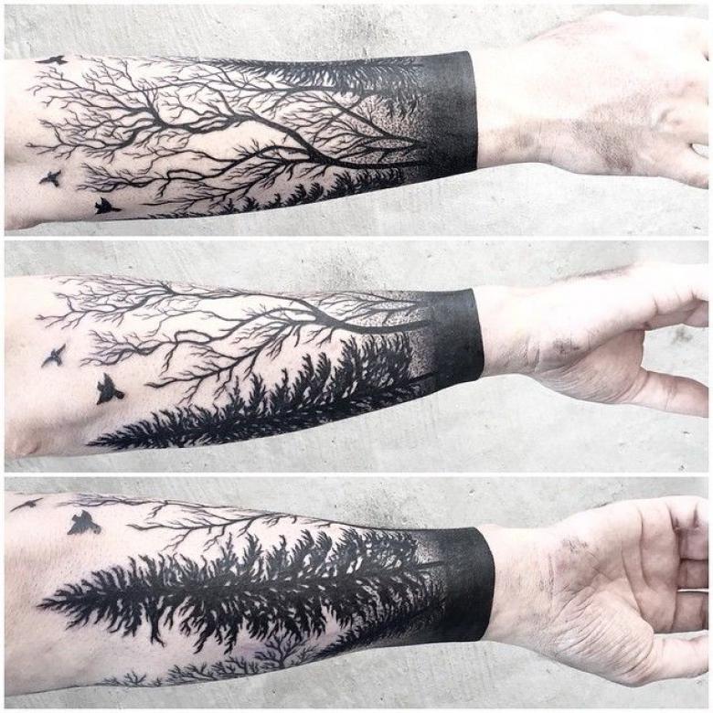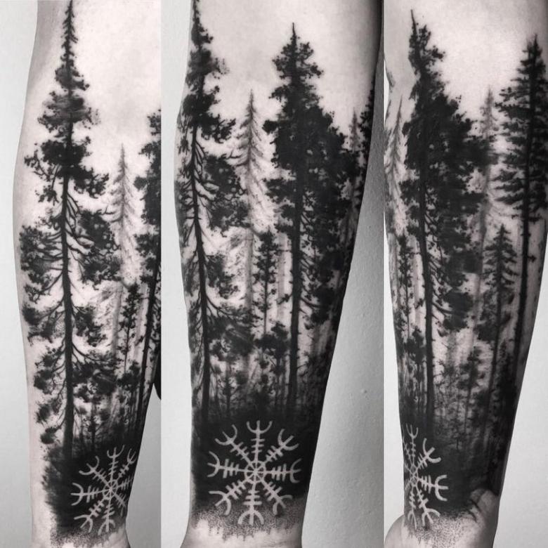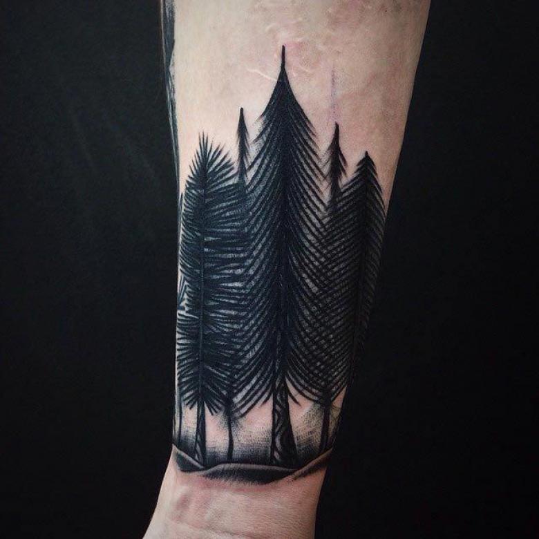 Le porteur de ce tatouage connaît exactement sa place dans la hiérarchie de la vie, sans prétendre en avoir trop, mais sans oublier ses capacités. Une forêt peut être tatouée comme un symbole d'énergie vitale abondante ou comme un signe de polyvalence.