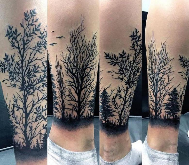 La présence de nombreux arbres aux branches nues dans une forêt nue peut suggérer un manque de confiance envers les autres et un niveau élevé d'agressivité envers les étrangers. Ces tatouages sont généralement commandés par des personnes qui ont vécu une série de trahisons. Ils sont utilisés pour faire comprendre à tous ceux qu'ils rencontrent qu'ils n'ont plus l'intention de tolérer l'injustice.