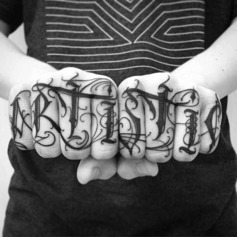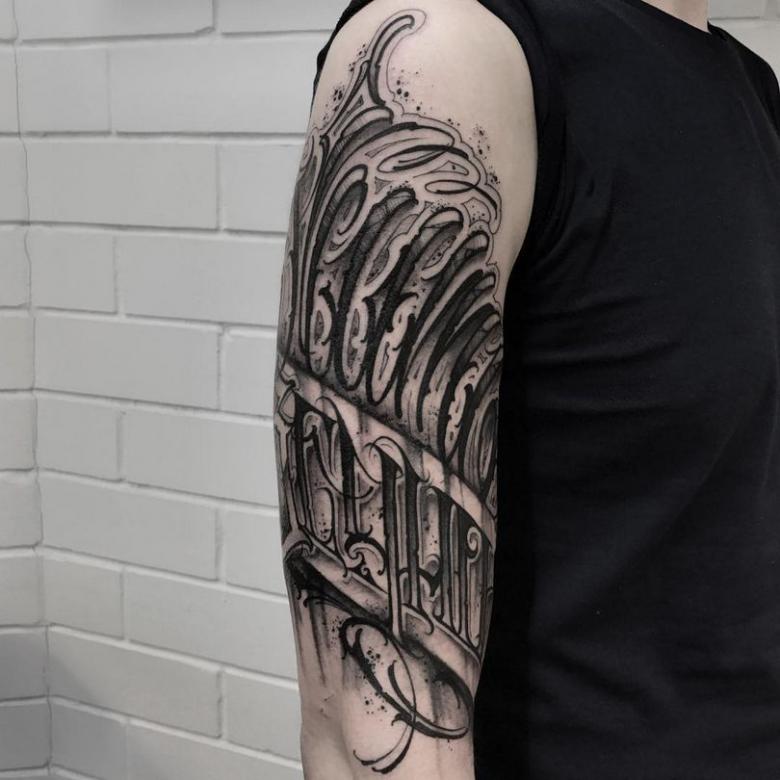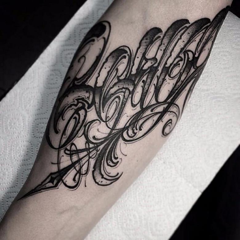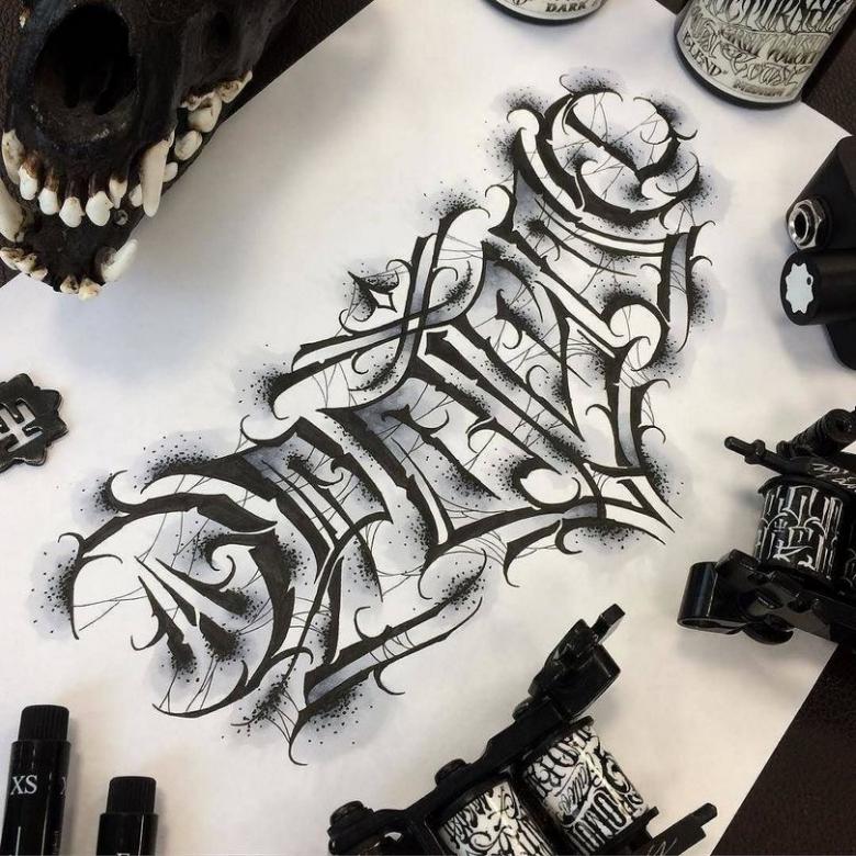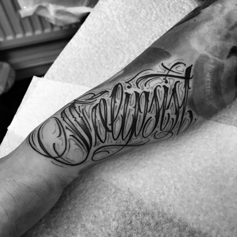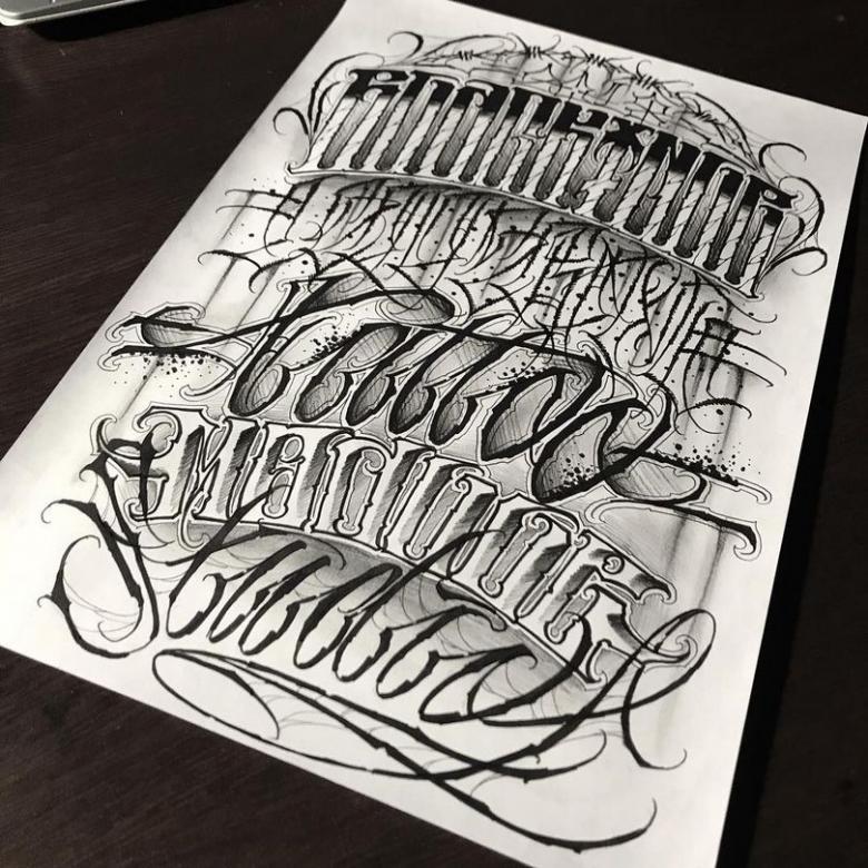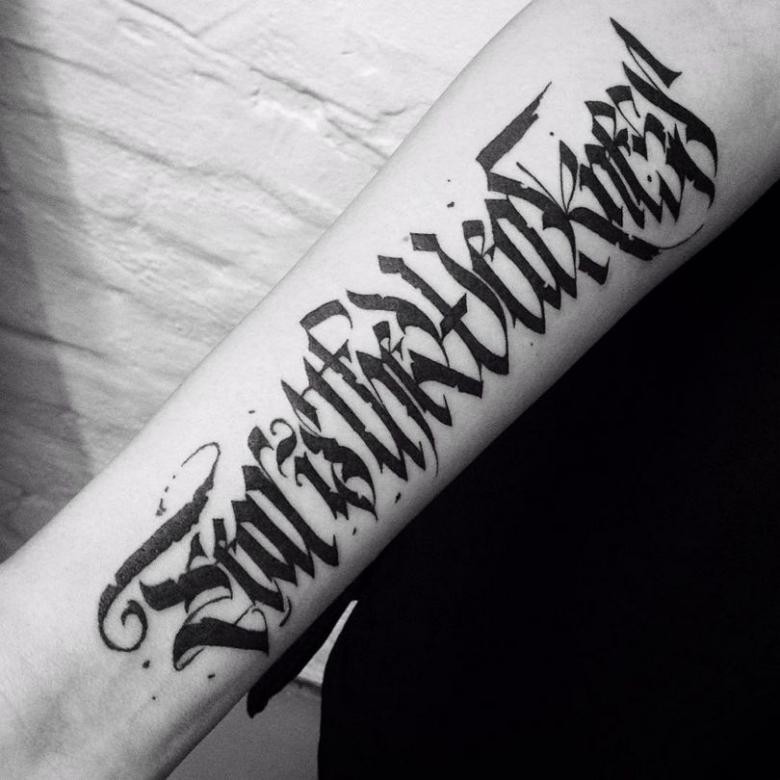 Un avantage intéressant d'un tel dessin est l'unicité de l'image, qui peut prendre en compte le jeu des muscles, les particularités de l'anatomie. Le lettrage est complété par des détails graphiques originaux, qui ombrent artistiquement le texte principal.