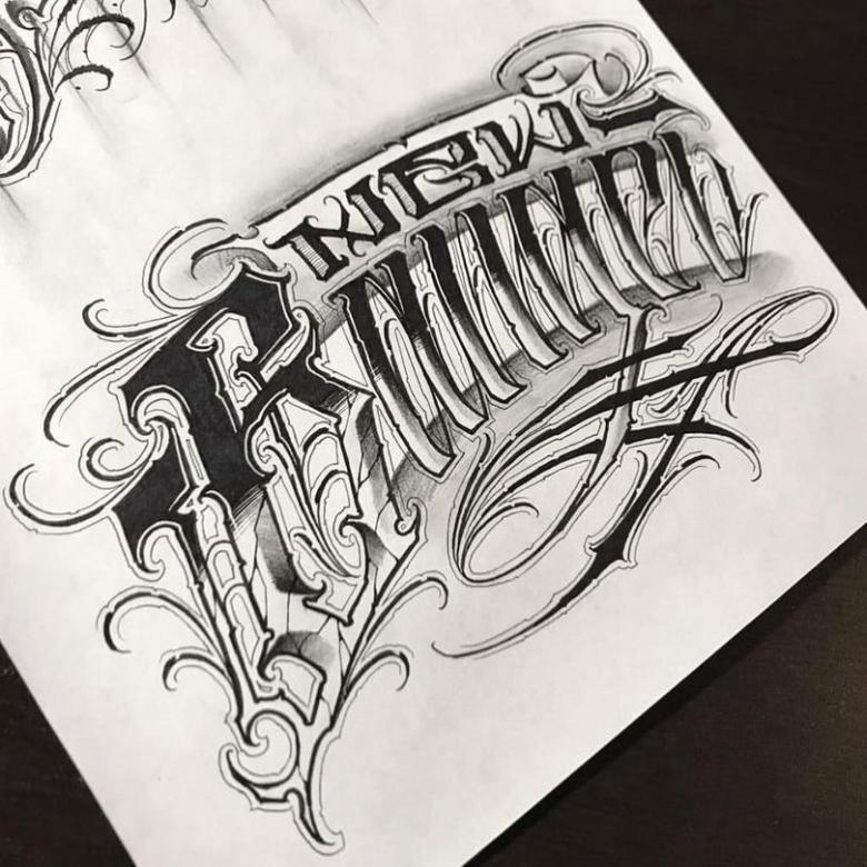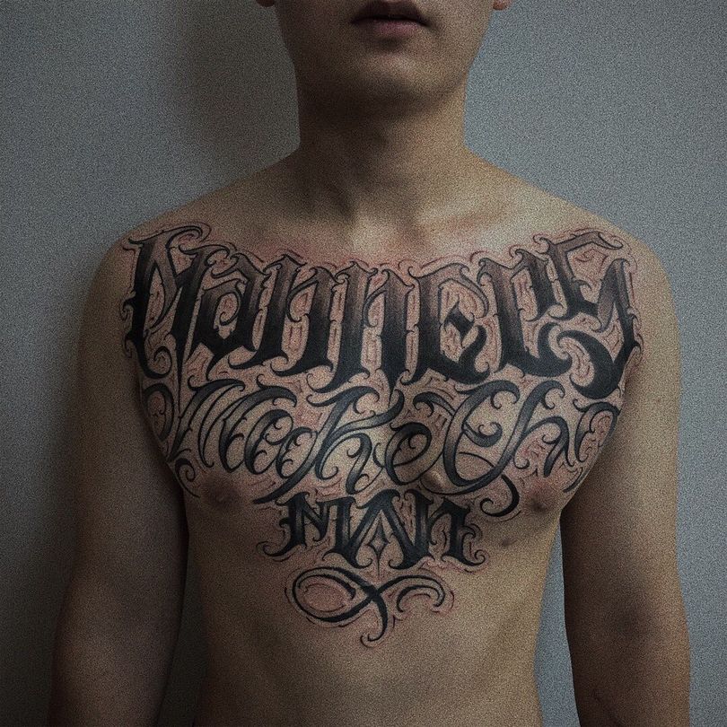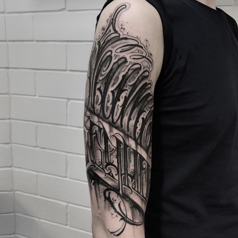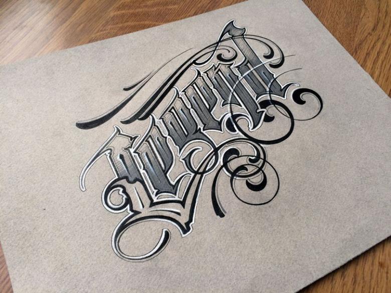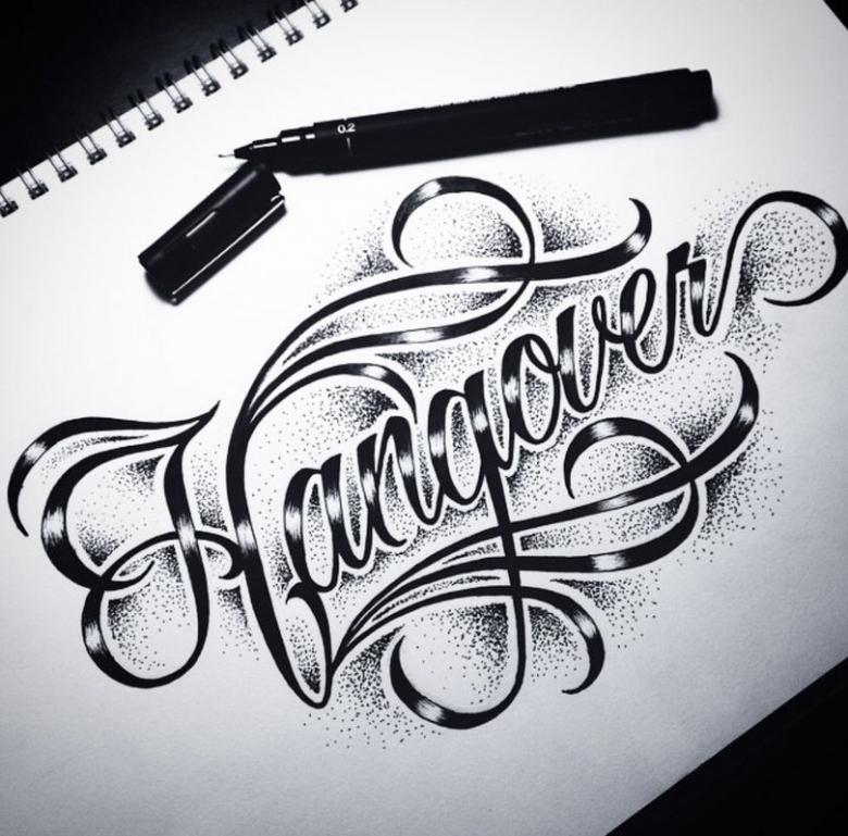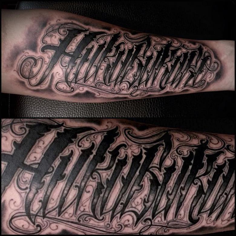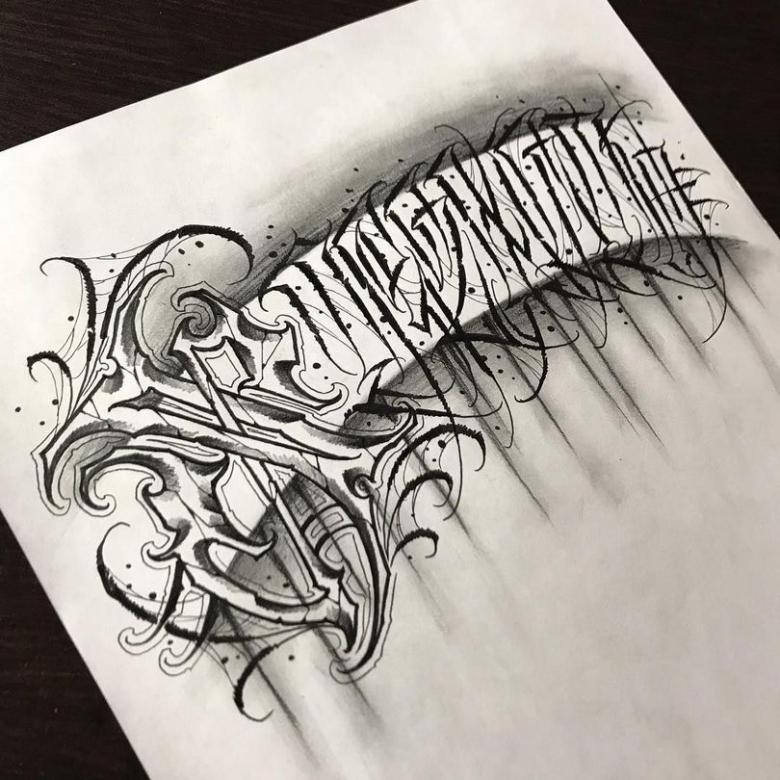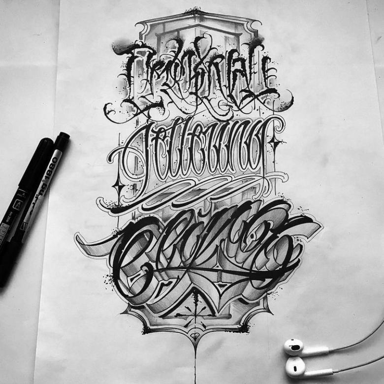 Un avantage intéressant d'un tel dessin est l'unicité de l'image, qui peut prendre en compte le jeu des muscles, les particularités de l'anatomie. Le lettrage est complété par des détails graphiques originaux, qui ombrent artistiquement le texte principal.