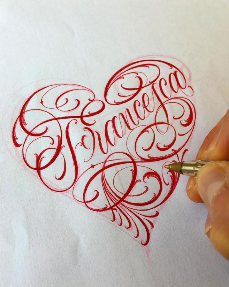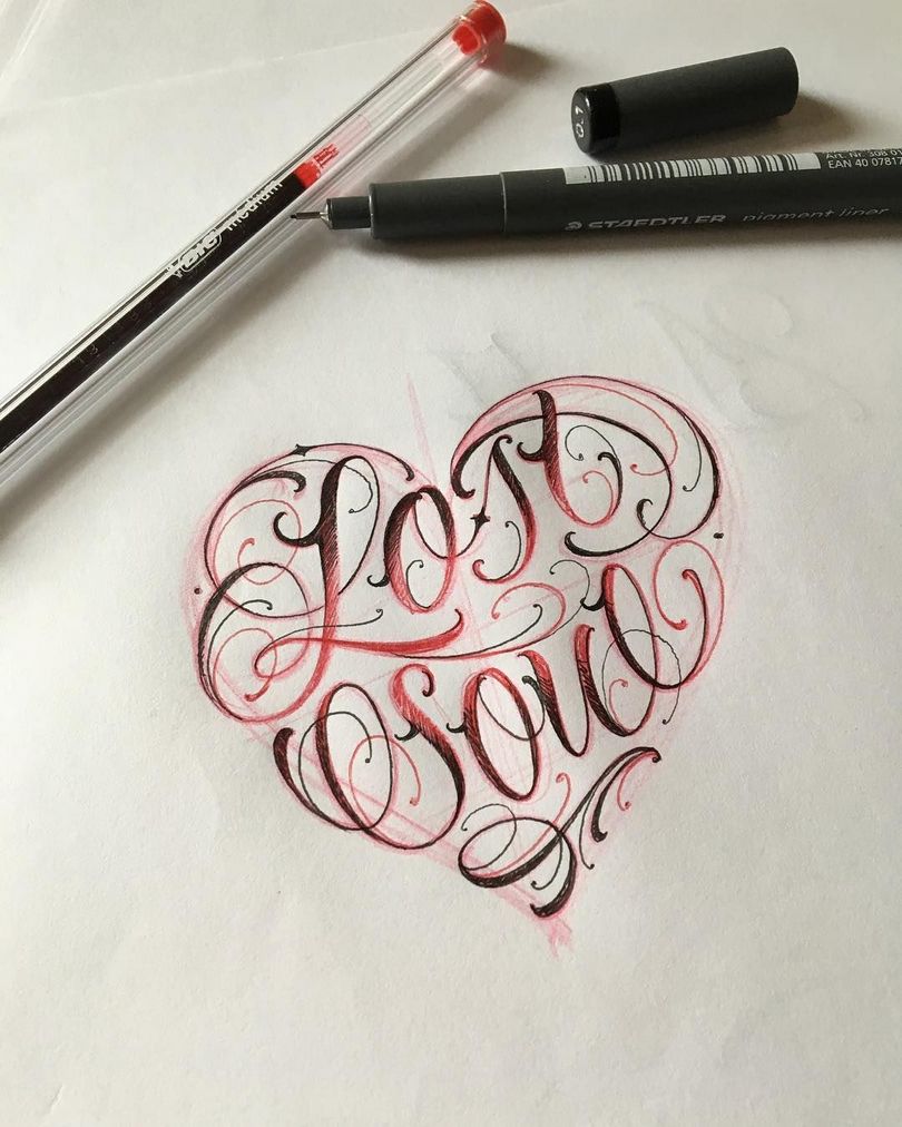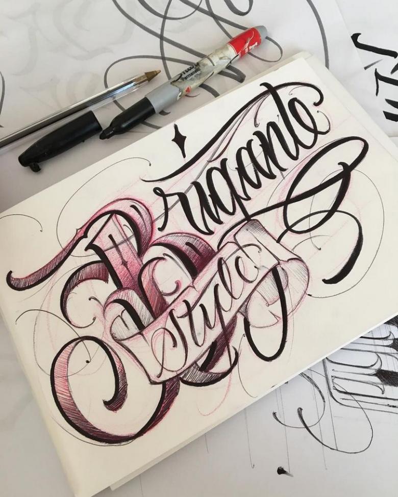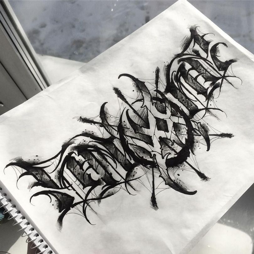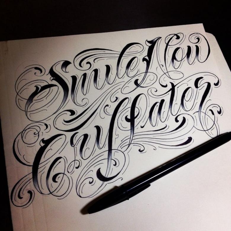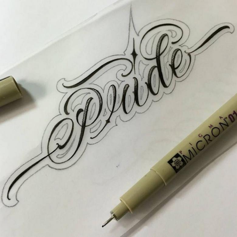 Un avantage intéressant d'un tel dessin est l'unicité de l'image, qui peut prendre en compte le jeu des muscles, les particularités de l'anatomie. Le lettrage est complété par des détails graphiques originaux, qui ombrent artistiquement le texte principal.