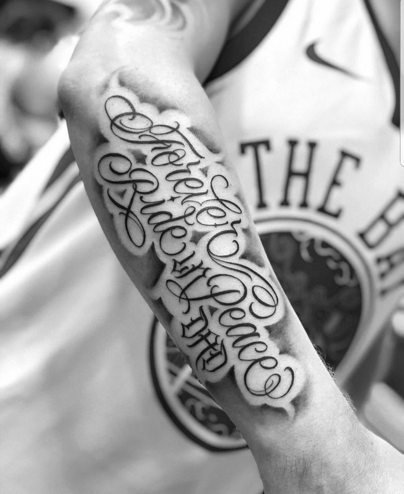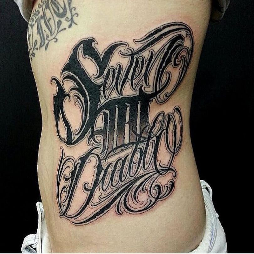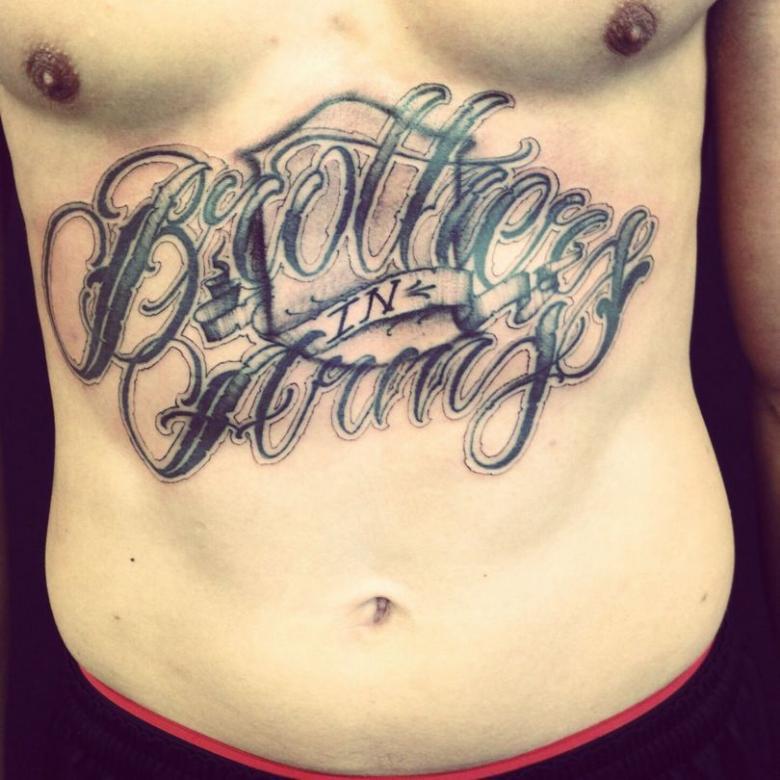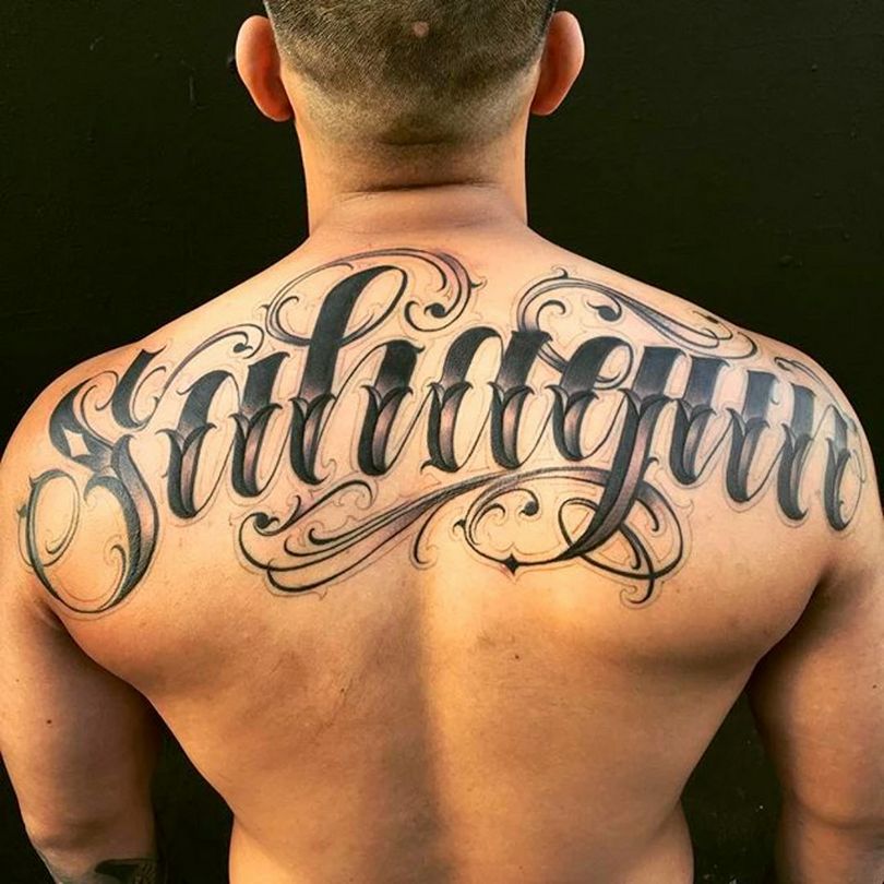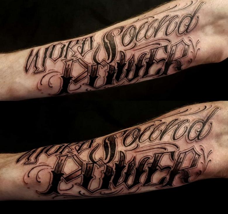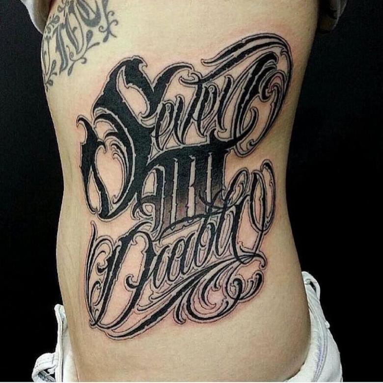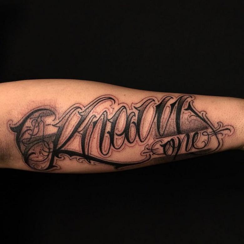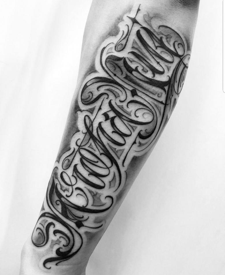 Conseil : ne vous contentez pas de modèles tout prêts ou d'un simple lettrage au trait. Un artiste expérimenté peut proposer une option plus intéressante, en tenant compte des jeux d'ombre et de lumière sur la peau et les muscles, et suggérer une solution originale. Il tiendra compte du caractère du porteur et de ses préférences. Et le choix final de la police et du texte vous appartient !