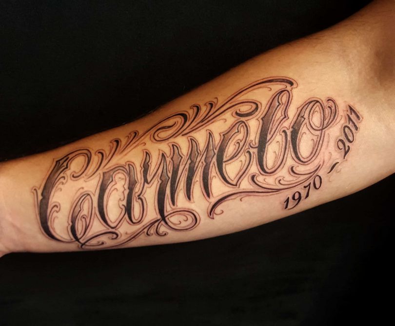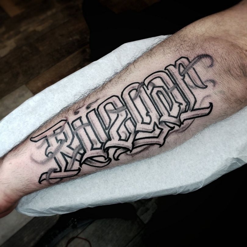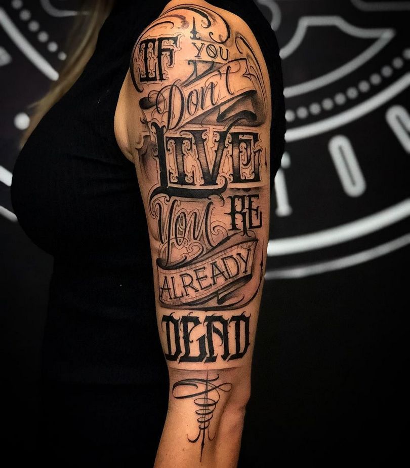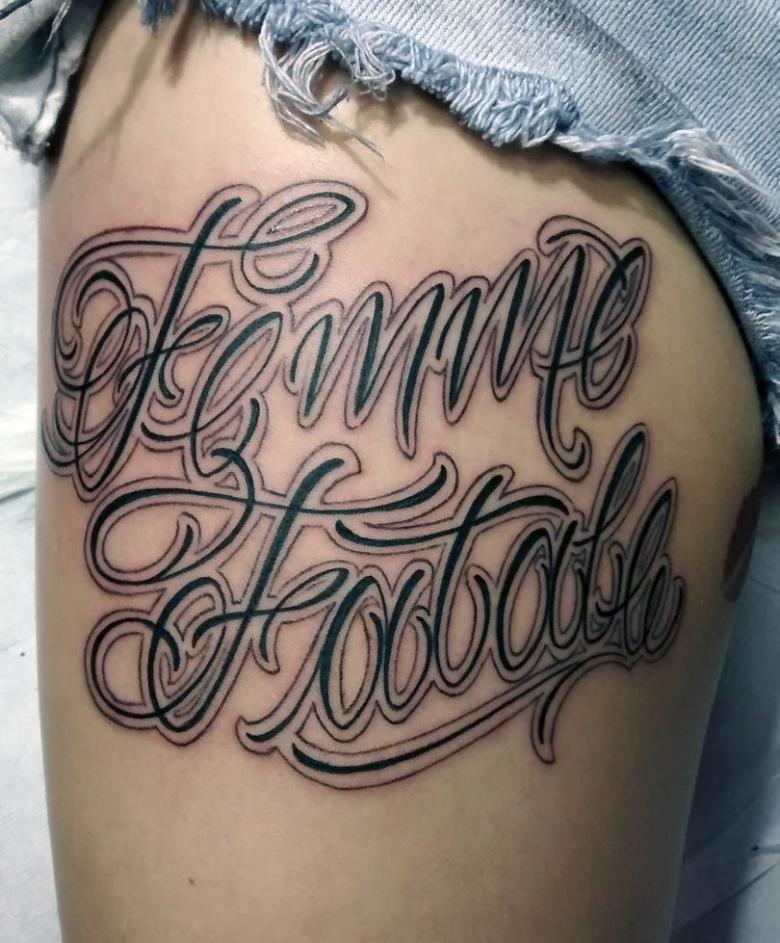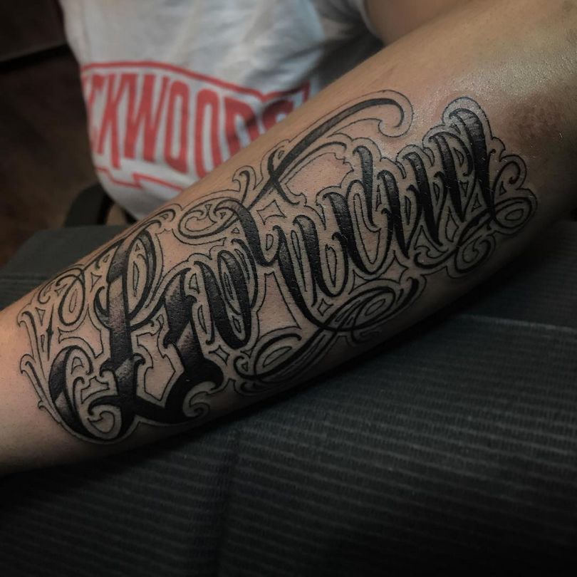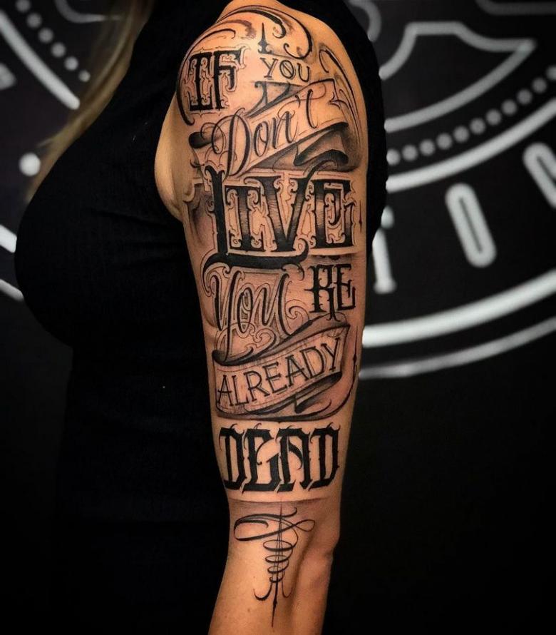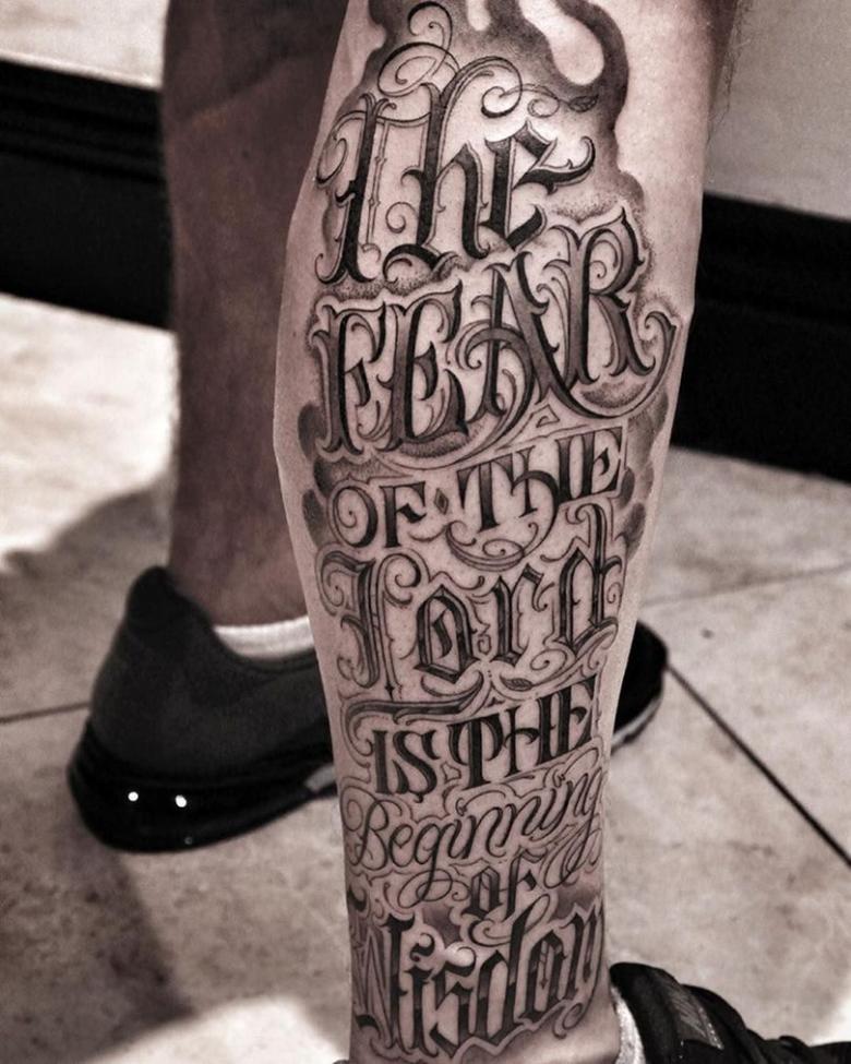 Conseil : ne vous contentez pas de modèles tout prêts ou d'un simple lettrage au trait. Un artiste expérimenté peut proposer une option plus intéressante, en tenant compte des jeux d'ombre et de lumière sur la peau et les muscles, et suggérer une solution originale. Il tiendra compte du caractère du porteur et de ses préférences. Et le choix final de la police et du texte vous appartient !