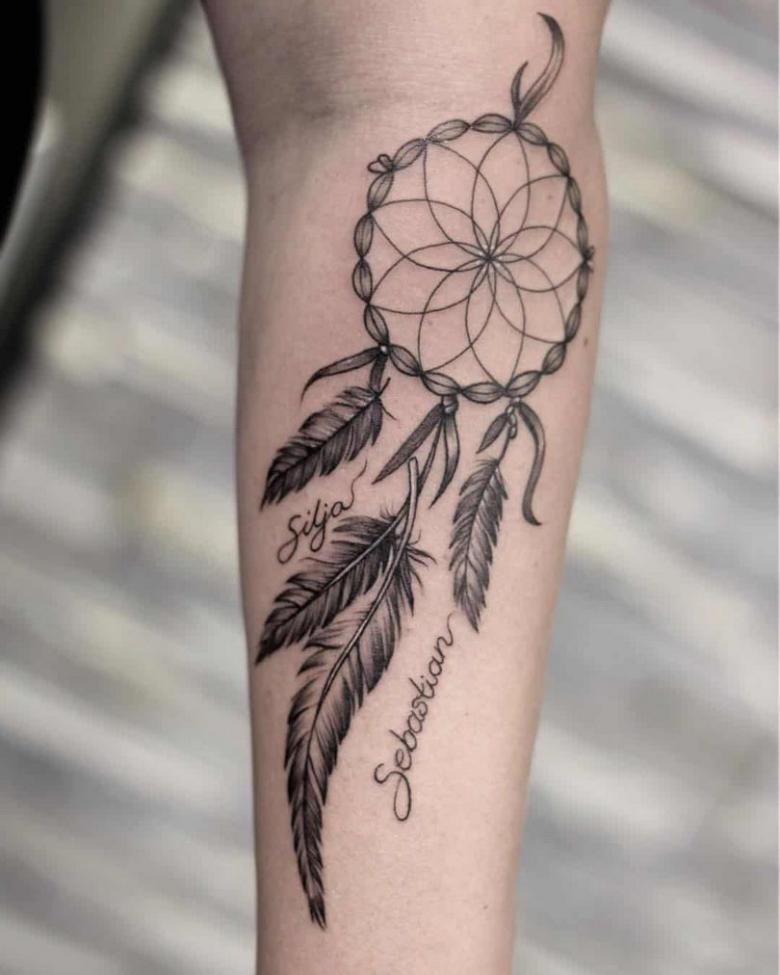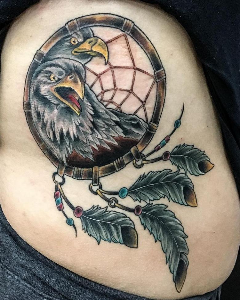 Une autre caractéristique intéressante de ce type de tatouage est que le nombre de plumes dans l'attrapeur a également une signification. Généralement, deux ou trois plumes sont représentées.