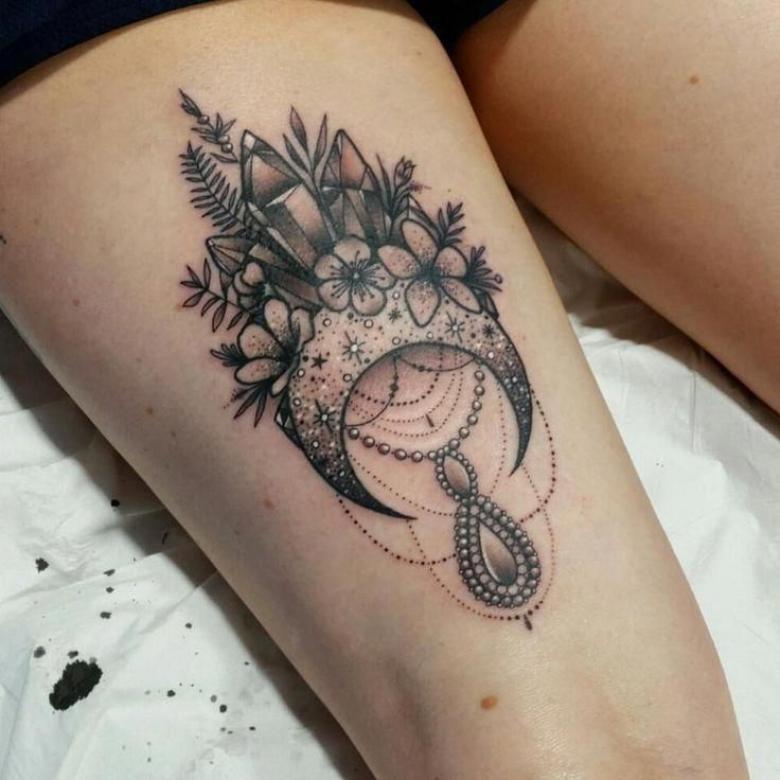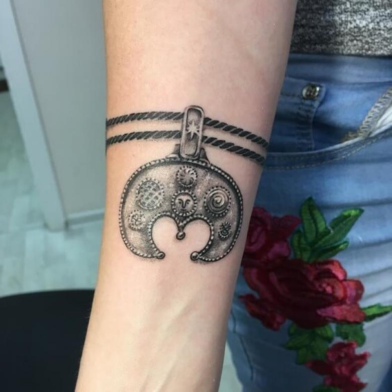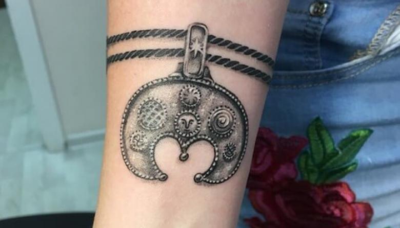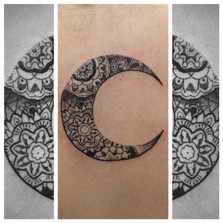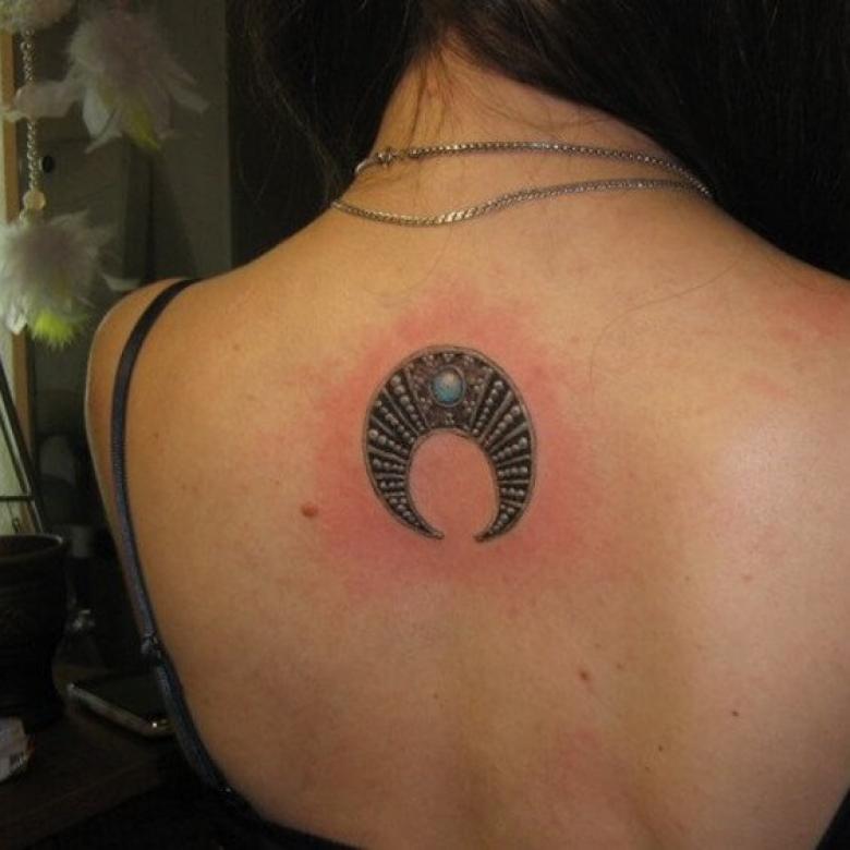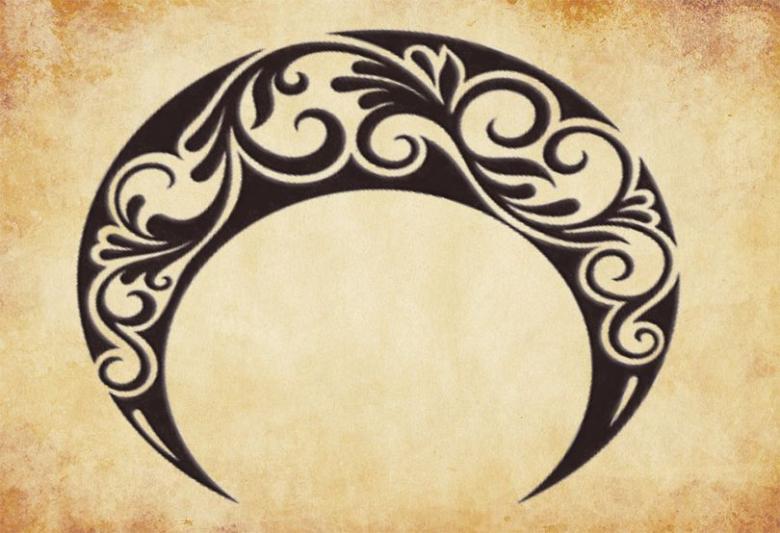 La lune à trois cornes symbolise le nombre mystique trois, la nature cyclique de la vie et les trois phases de l'existence : passé, présent et futur. Ce tatouage a un effet protecteur particulier. Il préserve la grossesse, aide à l'accouchement, protège la mère et l'enfant des mauvais regards, de la jalousie et de la sorcellerie.