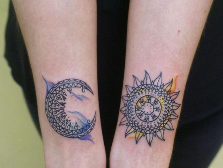 Dans la mythologie de l'ancienne population de Mésopotamie, des Sémites et des Sumériens, il est fait mention du dieu Lune sous une forme masculine. Des images du dieu sumérien Sina ont été trouvées - c'était un vieil homme avec une longue barbe et un croissant de lune avec des cornes au-dessus de sa tête. Il est ensuite devenu le prototype du dieu sage, qui contrôlait le temps et le destin.Le tatouage du croissant de lune en forme de cornes vers le haut, comme une Lune inversée, sur la main des hommes peut signifier le contrôle sur leur vie. On pourrait dire qu'il tient son destin entre ses mains. Cette image rappelle également les cornes d'un taureau, et le taureau dans la culture slave représentait la puissance et le courage.