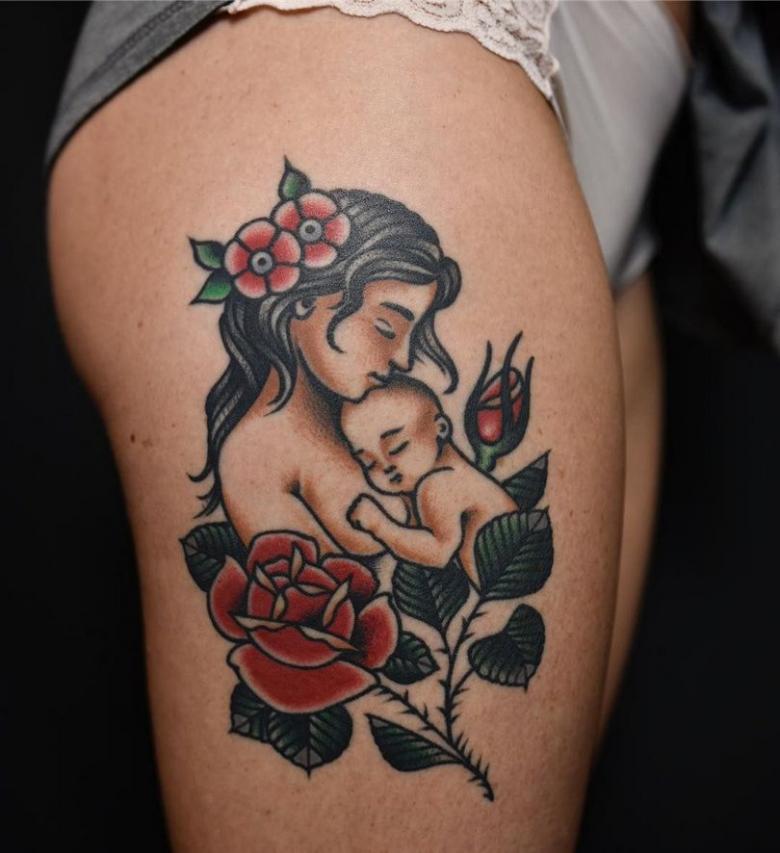 Le tatouage peut ressembler à une femme tenant un bébé dans ses bras. Pour celui qui le porte, il signifiera un lien spirituel indéfectible.