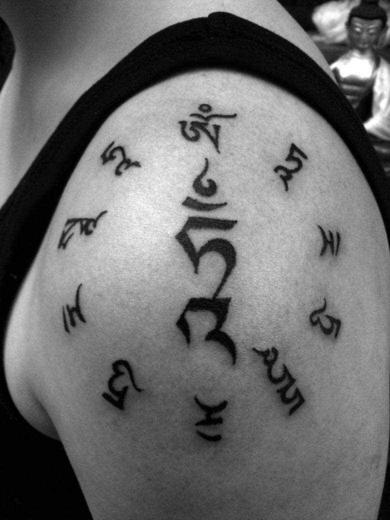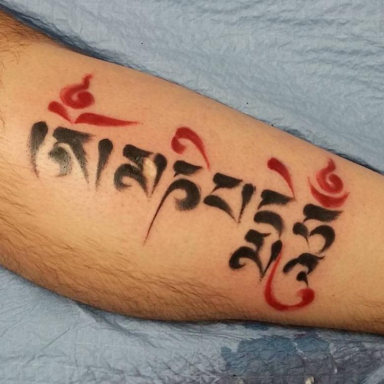 Pour les travaux plus importants, il n'est pas rare de se faire tatouer un mantra sur l'épaule ou l'avant-bras. Ils peuvent être disposés en lignes multiples ou en spirale. Un mantra peut être incorporé de manière transparente dans presque tous les dessins. Il n'est pas rare de choisir des images en forme de fleur de lotus ou de Bouddha.
