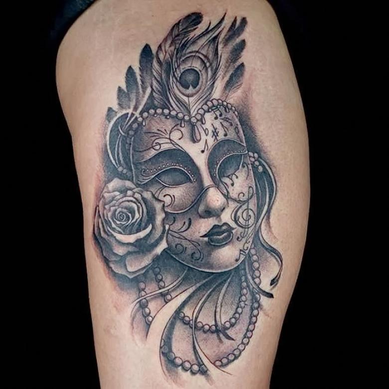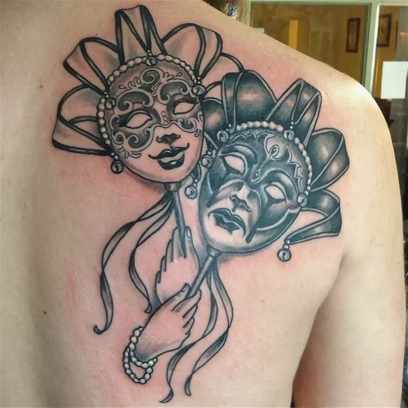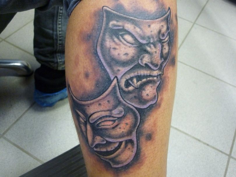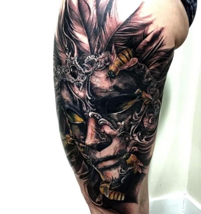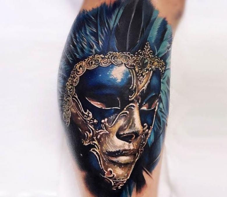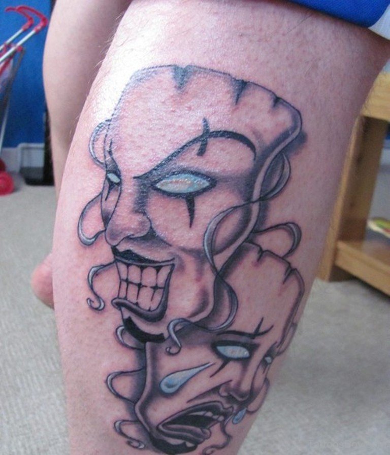 Les masques sur les jambes, surtout sur les mollets, ne sont pas mauvais. Cela s'explique par les thèmes associés de certains tatouages de masques - théâtraux, clownesques. Dupliqués sur les bras et les jambes, les tatouages ont en général un aspect spectaculaire. La large zone de chevauchement permet de bien dissimuler les cicatrices cutanées. Et pour éviter les erreurs lors de l'application d'un tatouage, il convient de choisir un salon éprouvé, un maître expérimenté.