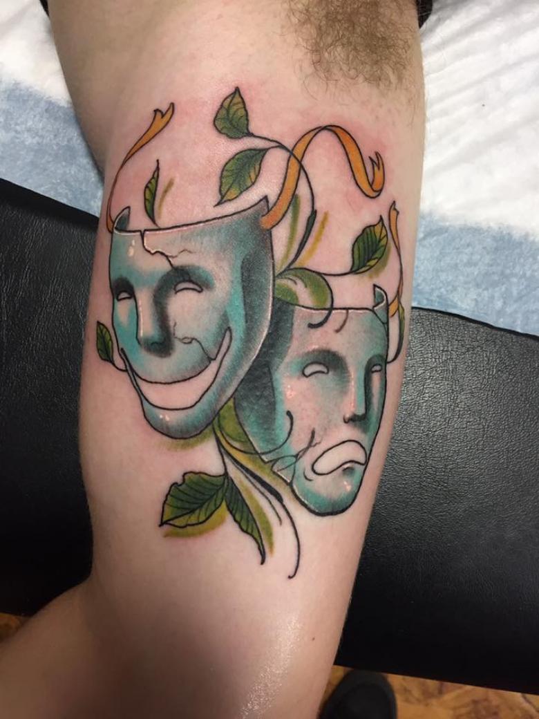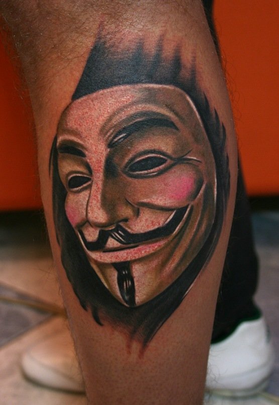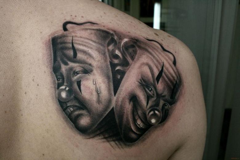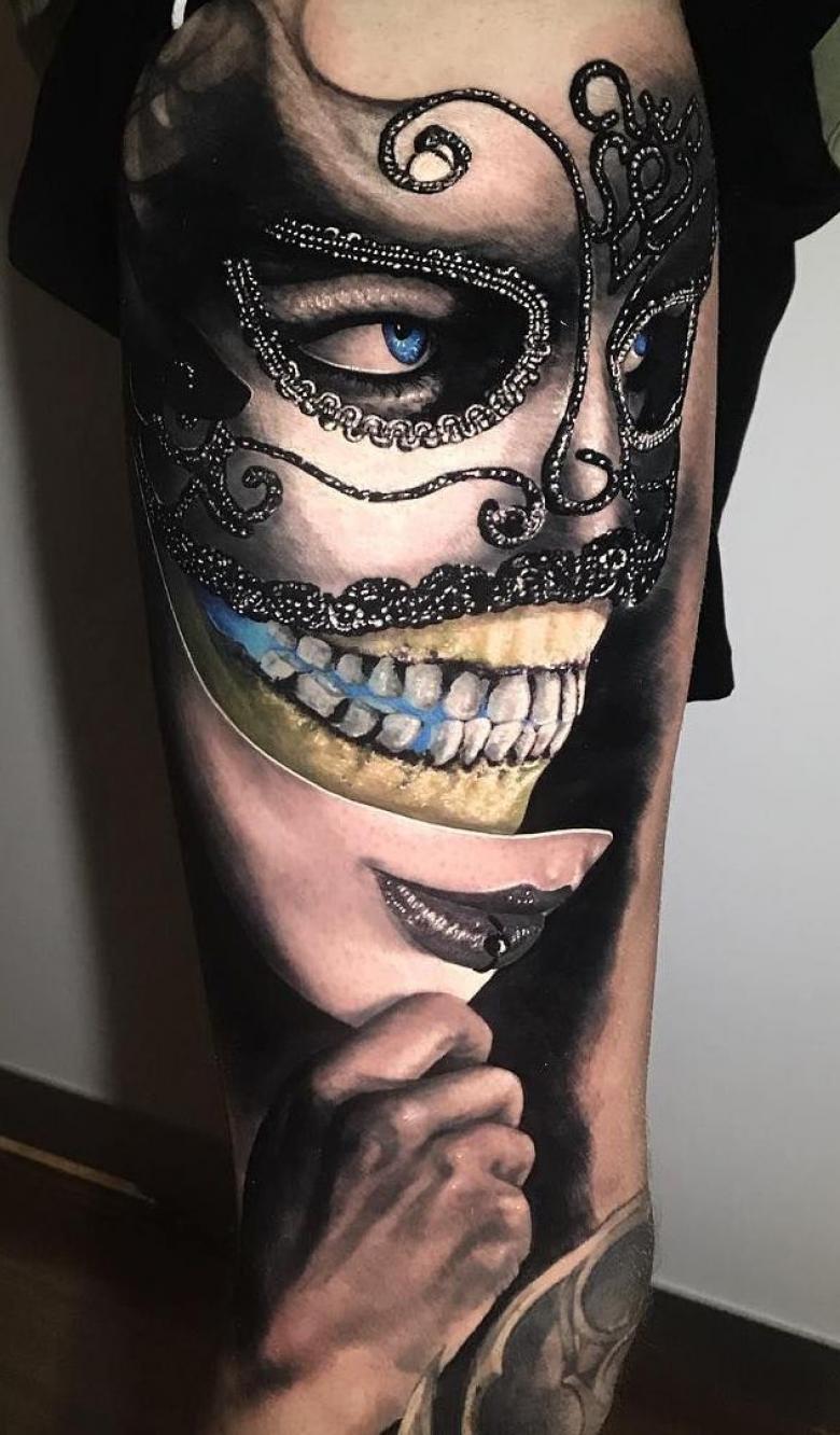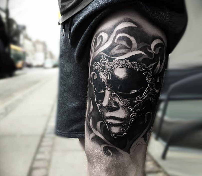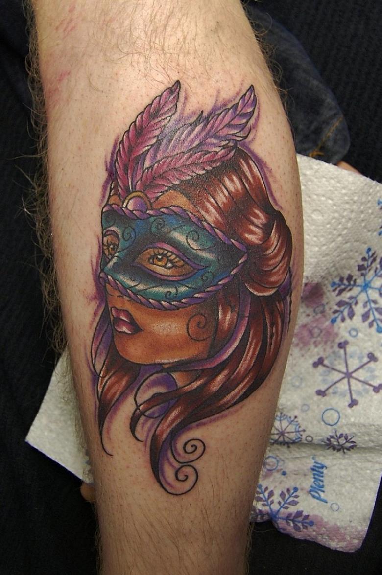 Les masques sur les jambes, surtout sur les mollets, ne sont pas mauvais. Cela s'explique par les thèmes associés de certains tatouages de masques - théâtraux, clownesques. Dupliqués sur les bras et les jambes, les tatouages ont en général un aspect spectaculaire. La large zone de chevauchement permet de bien dissimuler les cicatrices cutanées. Et pour éviter les erreurs lors de l'application d'un tatouage, il convient de choisir un salon éprouvé, un maître expérimenté.