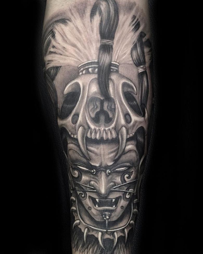 - La représentation d'un dieu guerrier, avec une langue tirée et des textes ou symboles complémentaires, peut être une bonne option pour un tatouage moderne ;