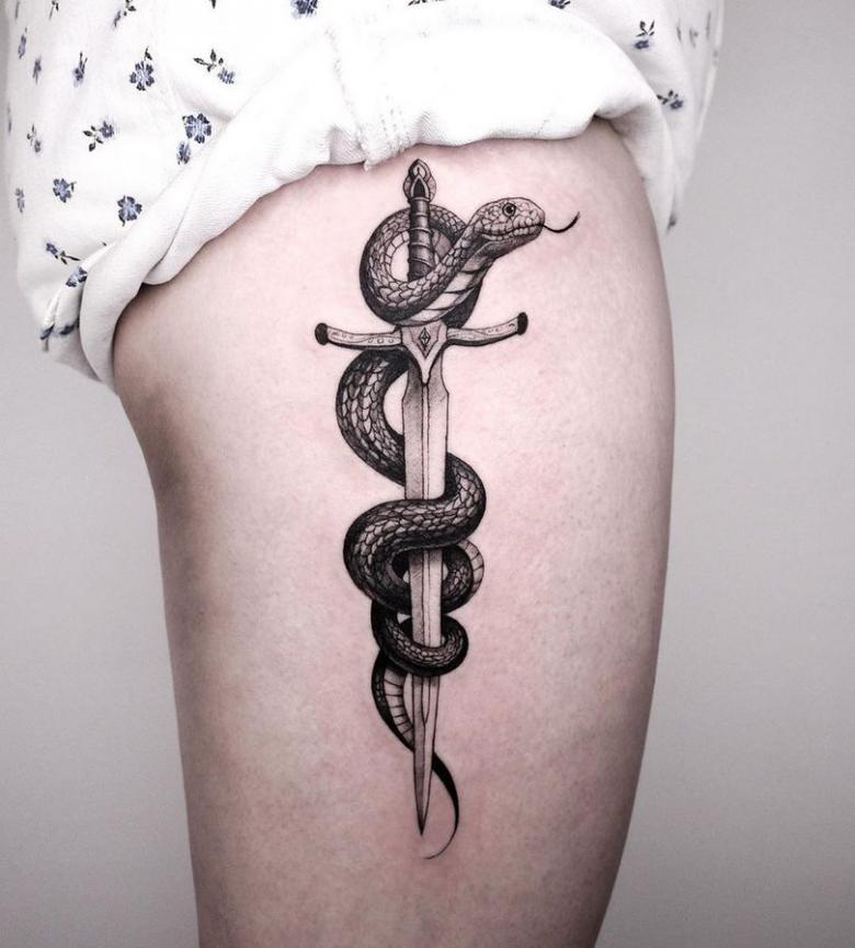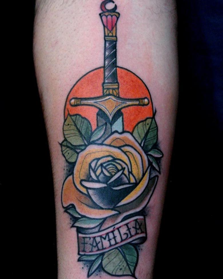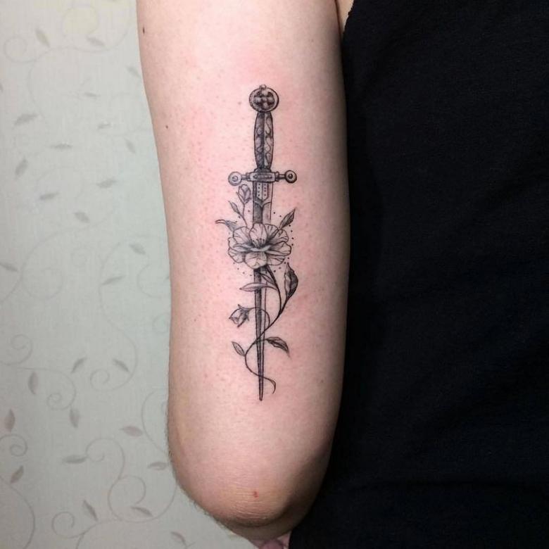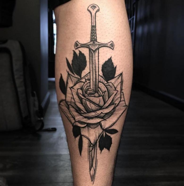 L'épée avec une rose ou des fleurs est la parure la plus populaire sur le corps d'une femme. C'est un symbole de romance et de sentiments élevés. Bien que la couleur de la fleur puisse en dire long : le blanc représente la pureté et l'innocence, le jaune la ferveur et la joie, le rouge ou l'orange la passion.
