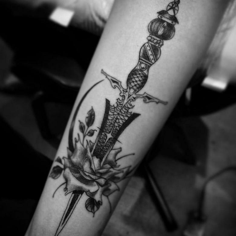 La volonté de se battre et de prendre des risques est l'interprétation de base de l'épée. Toute personne souhaite rendre son tatouage original et unique en le complétant par une variété d'éléments différents, de sorte que la signification des lames s'élargit et peut signifier beaucoup de choses. Par conséquent, avant de vous rendre au salon et de vous faire tatouer, vous devez réfléchir sérieusement et étudier l'histoire de l'origine et les différentes interprétations des lames. Si une personne veut investir dans le futur tatouage d'une certaine signification, il est nécessaire d'étudier plus d'une photo et plus d'une photo, qui sont trouvées sur Internet n'est pas un problème.