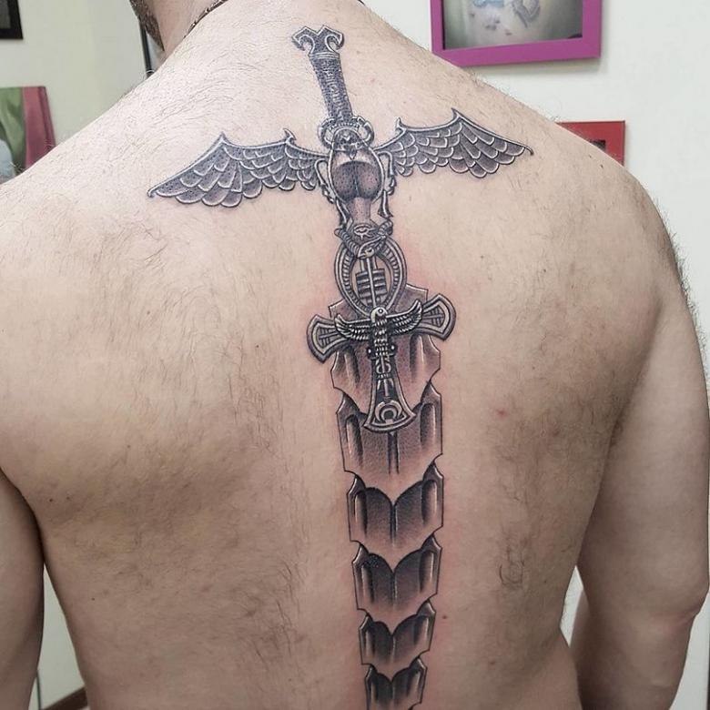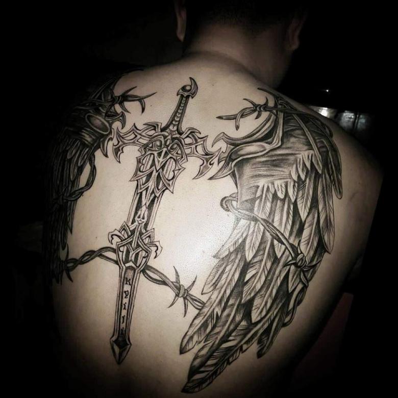 Pour les tatouages de grande taille, choisissez le dos ou la poitrine, où il y a suffisamment de place pour toute une collection d'épées. Les images les plus populaires chez les hommes sont une épée avec des ailes, avec un crâne, avec une rose et des lames croisées.